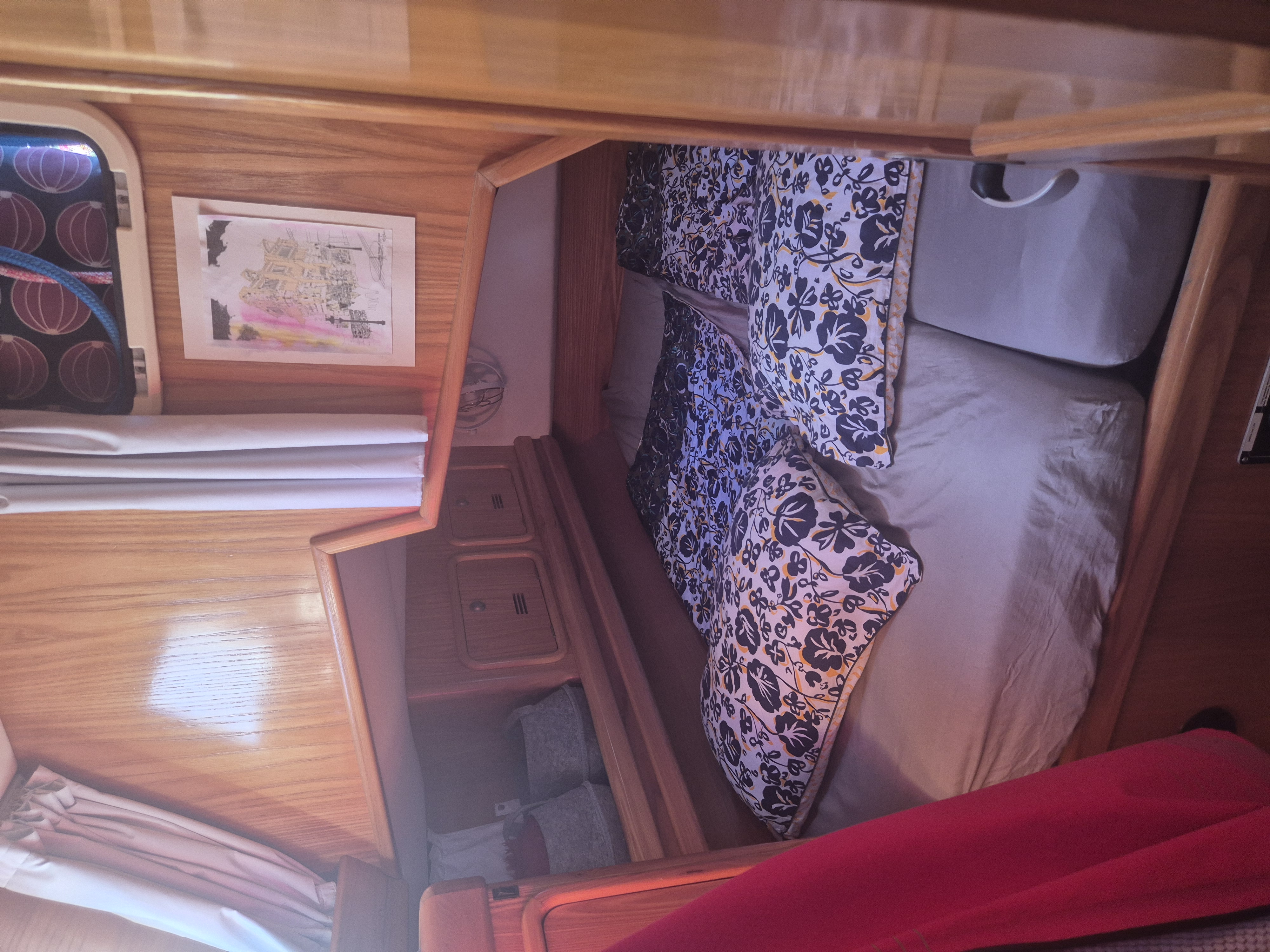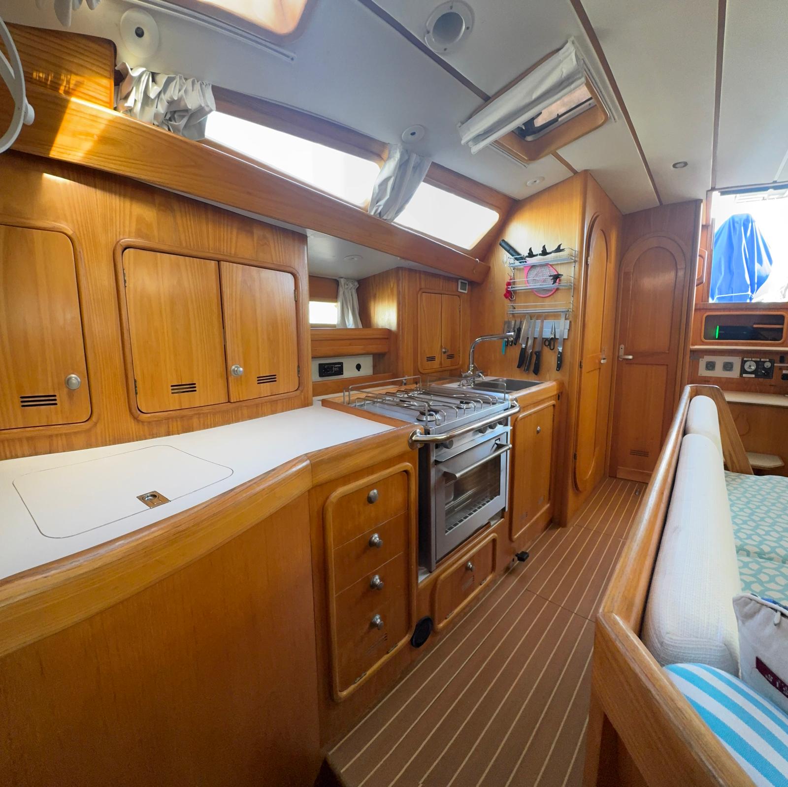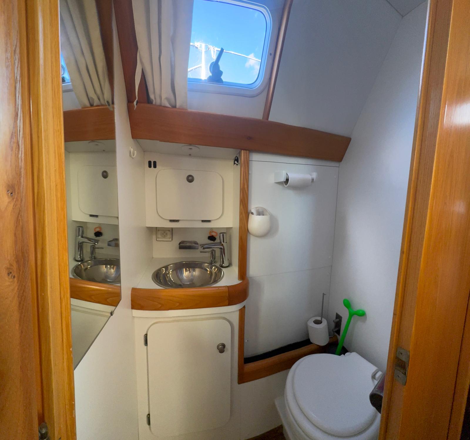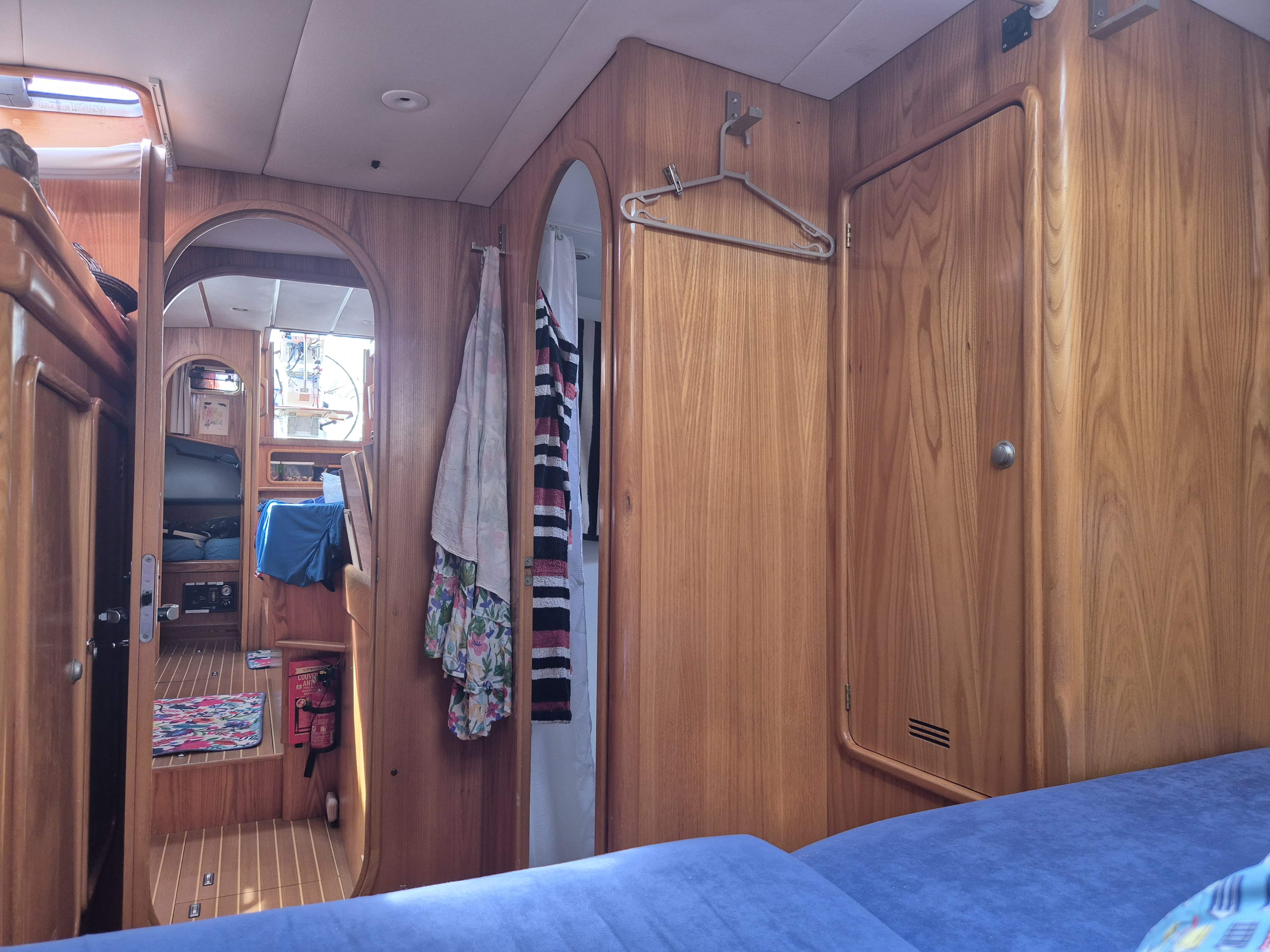 L’intérieur offre trois cabines doubles plus un carré transformable (8 couchages), chauffage AIRTRONIC, ventilateurs, cuisine équipée d’un four OceanChef 2024, d’un grand volume frigo et d’un congélateur 2023, ainsi qu’une machine à laver Daewoo. Deux salles d’eau complètes, avant et arrière.
