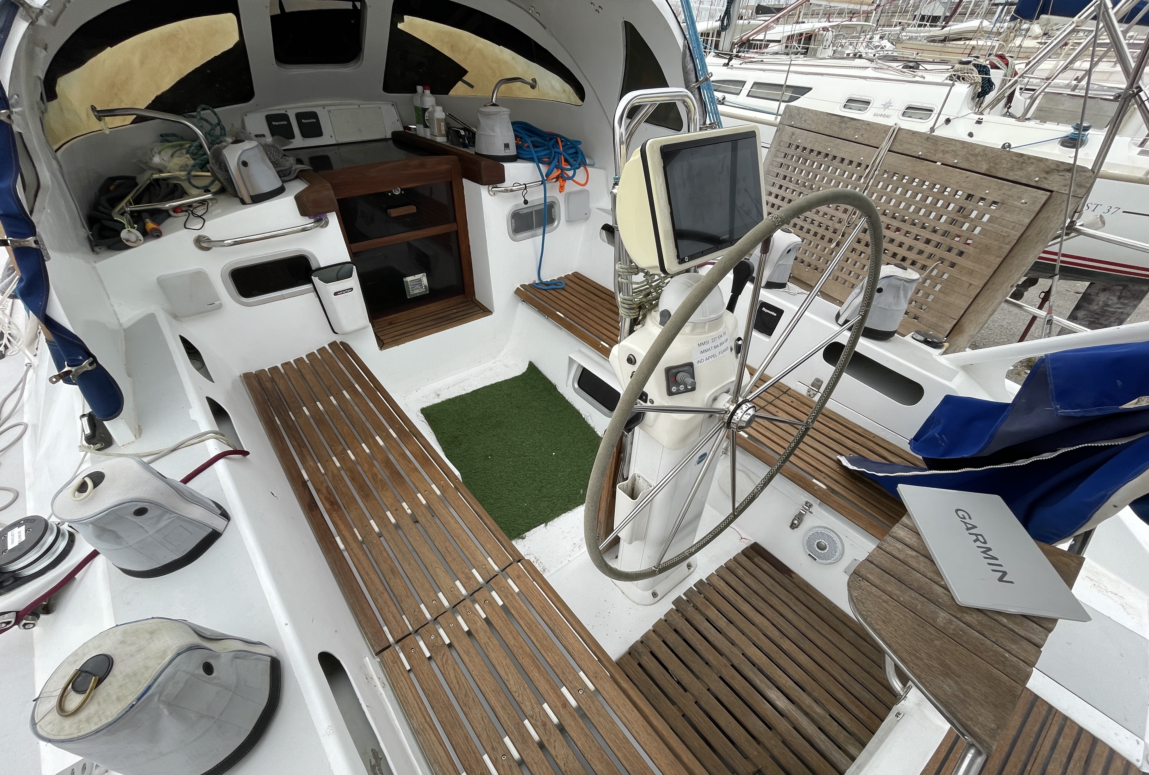 La dérive, le safran et le pont ont été révisés ou remis à neuf, notamment une peinture complète du pont en 2020. L’équipement comprend un cockpit en teck, une casquette rigide renforcée et un taud polyester (2019), protections solaires et grands volumes de rangement.