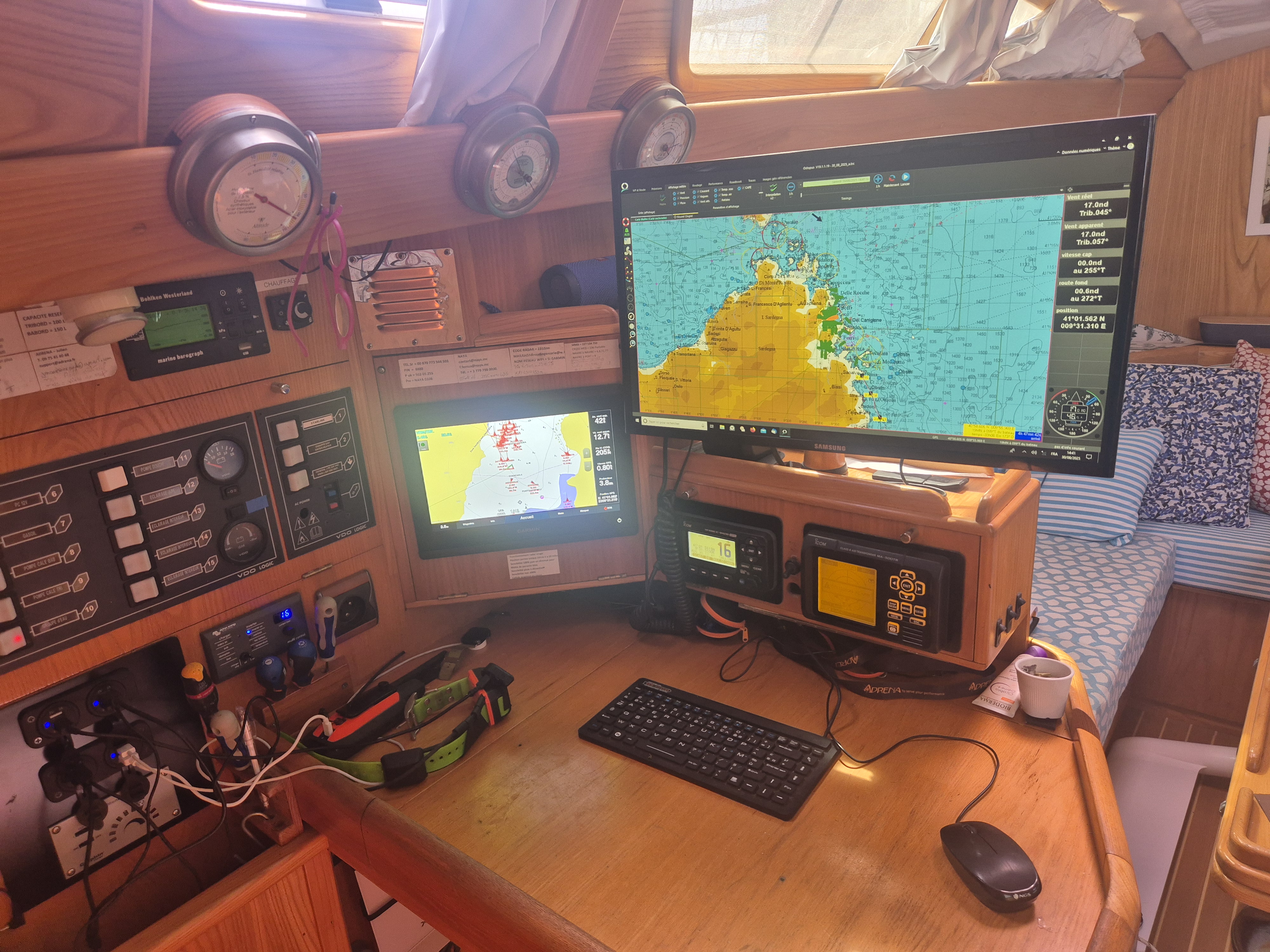L’électronique de navigation est moderne et complète : double station Garmin GPSMAP 8612xsv avec radar et AIS, instruments Raymarine (2022), pilote automatique neuf (2024), VHF fixe et portable DSC, ordinateur marin avec logiciel ADRENA, et Starlink High-Performance (2025).