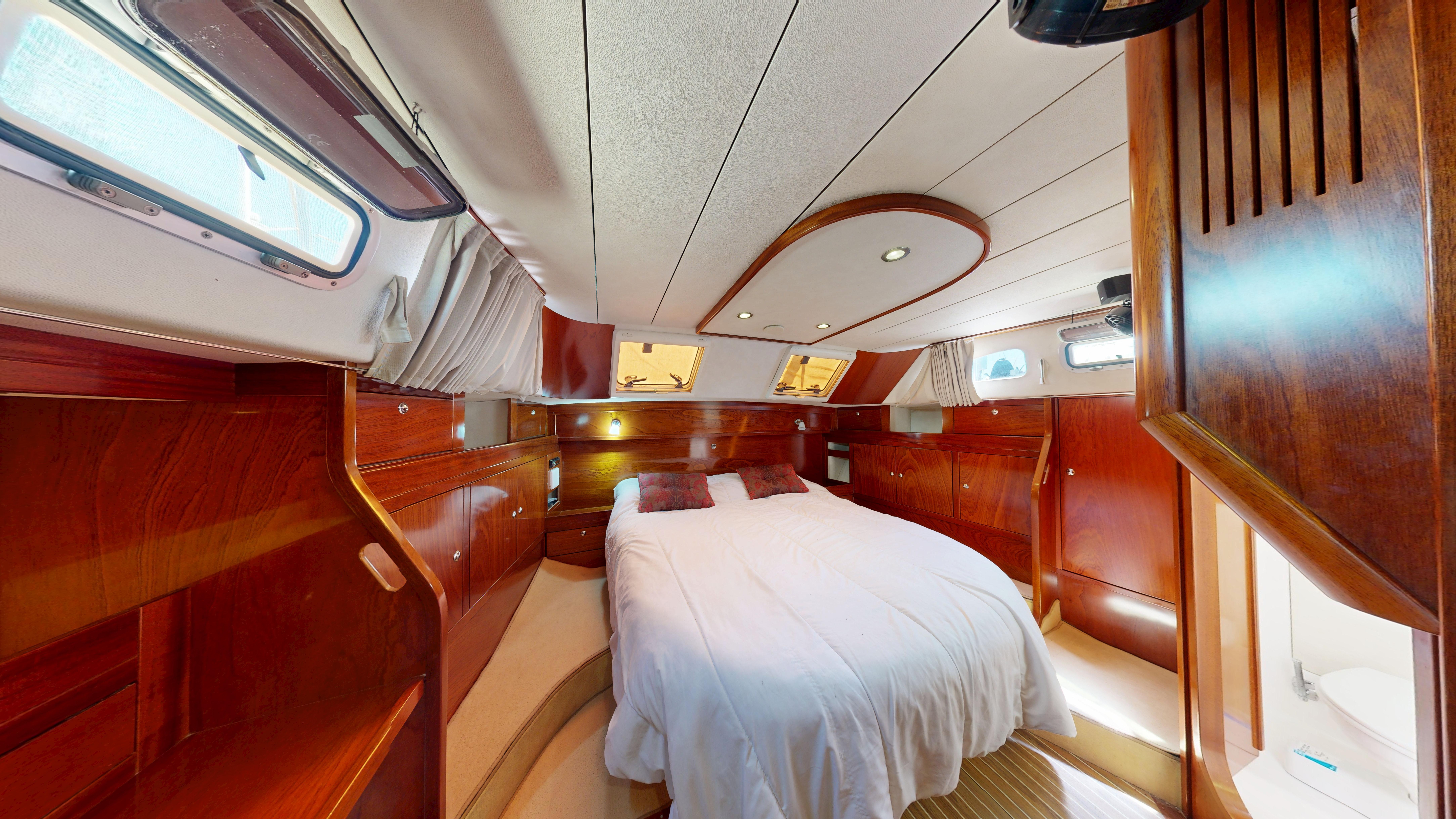 Aft cabin : Owner's cabin with double island berth (2mx1.60m), safe, desk/hairdresser, closet, television in varnished mahogany cabinet, anti-roll cover.