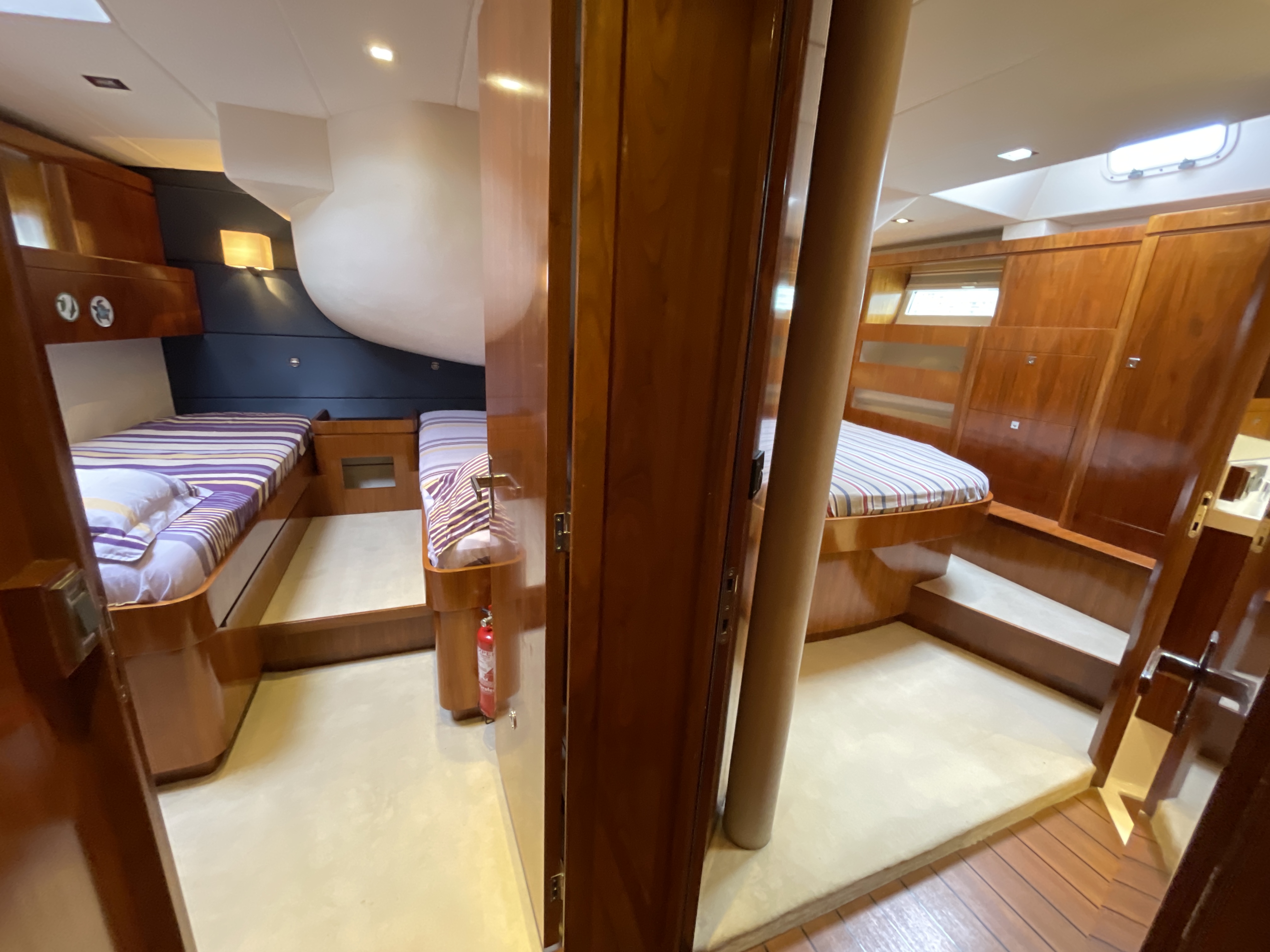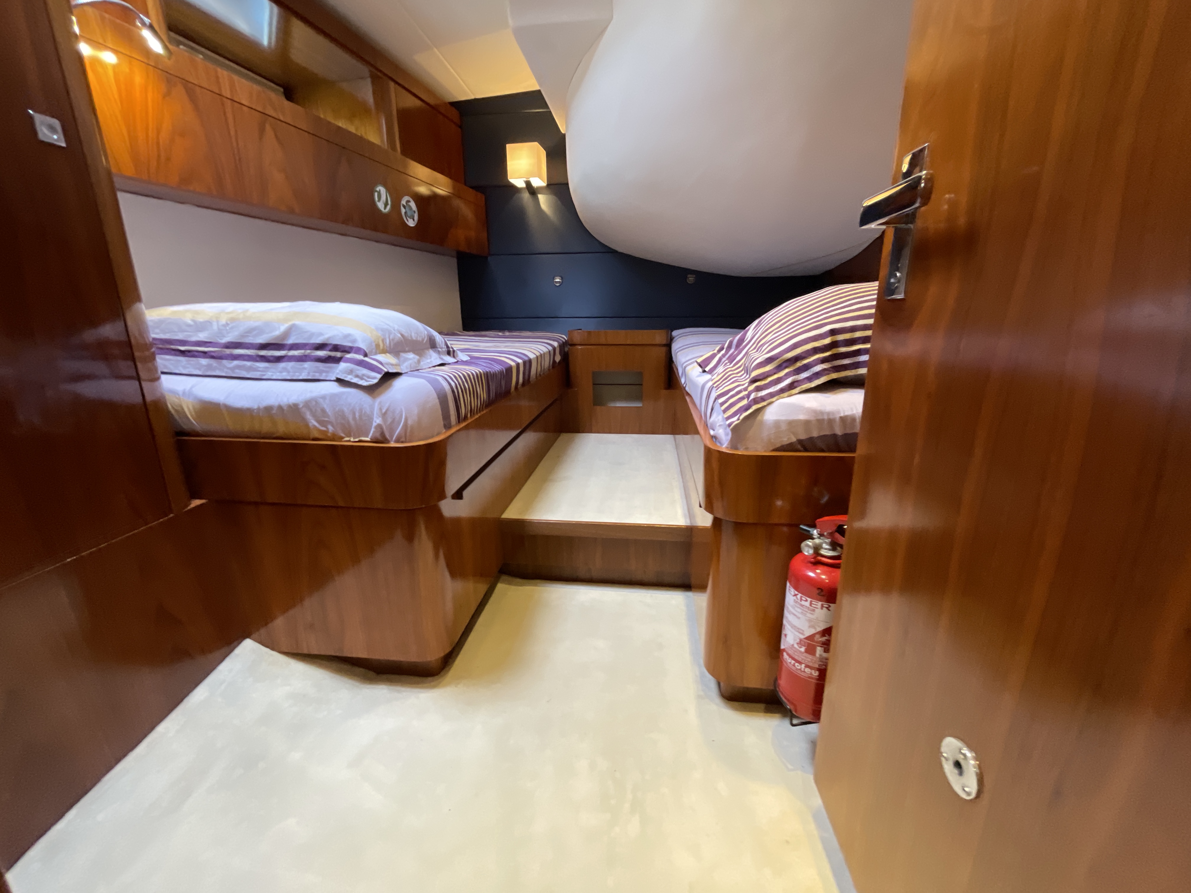 3 double cabins, 3 head compartments, one skipper cabin on port side.