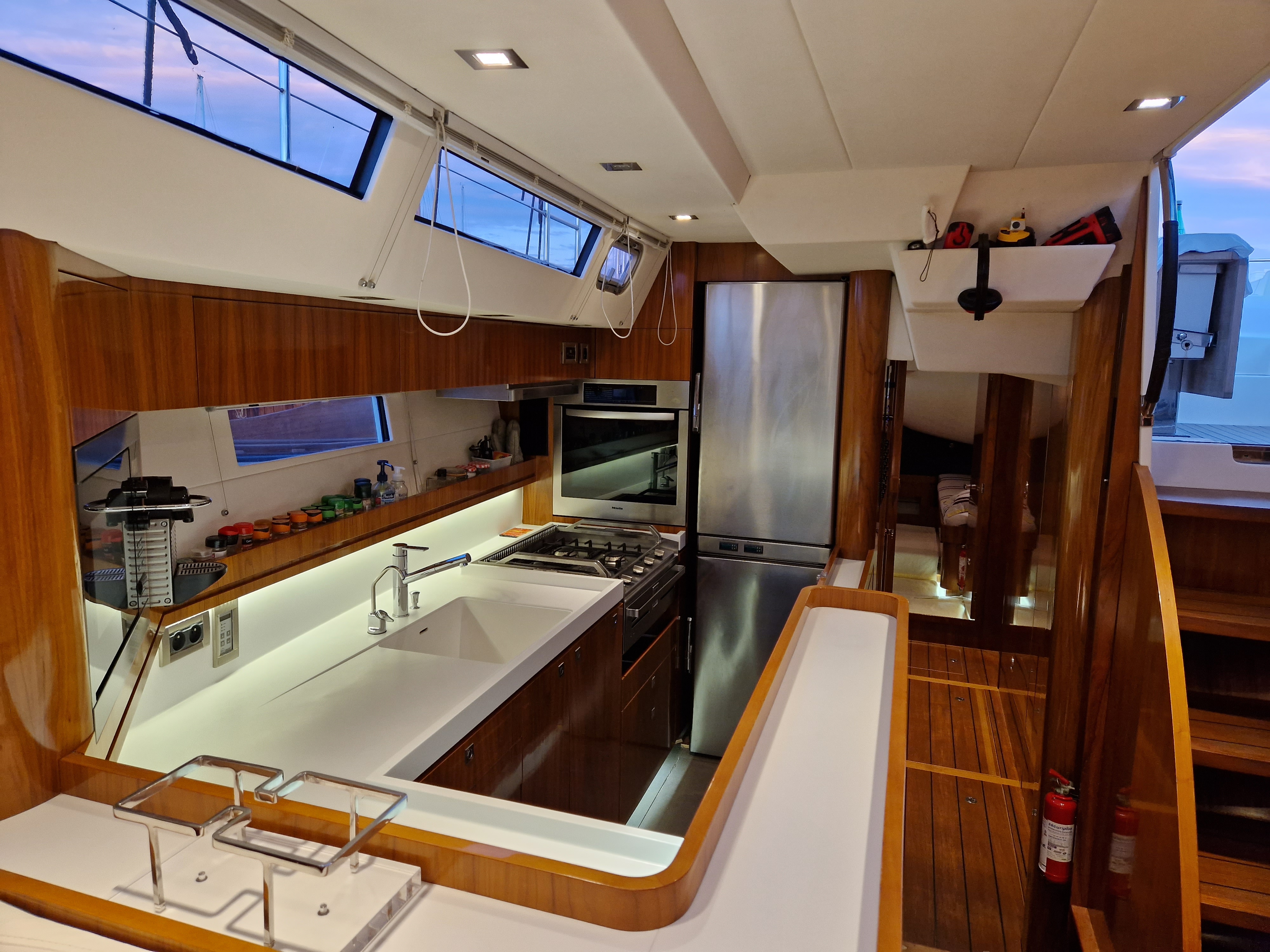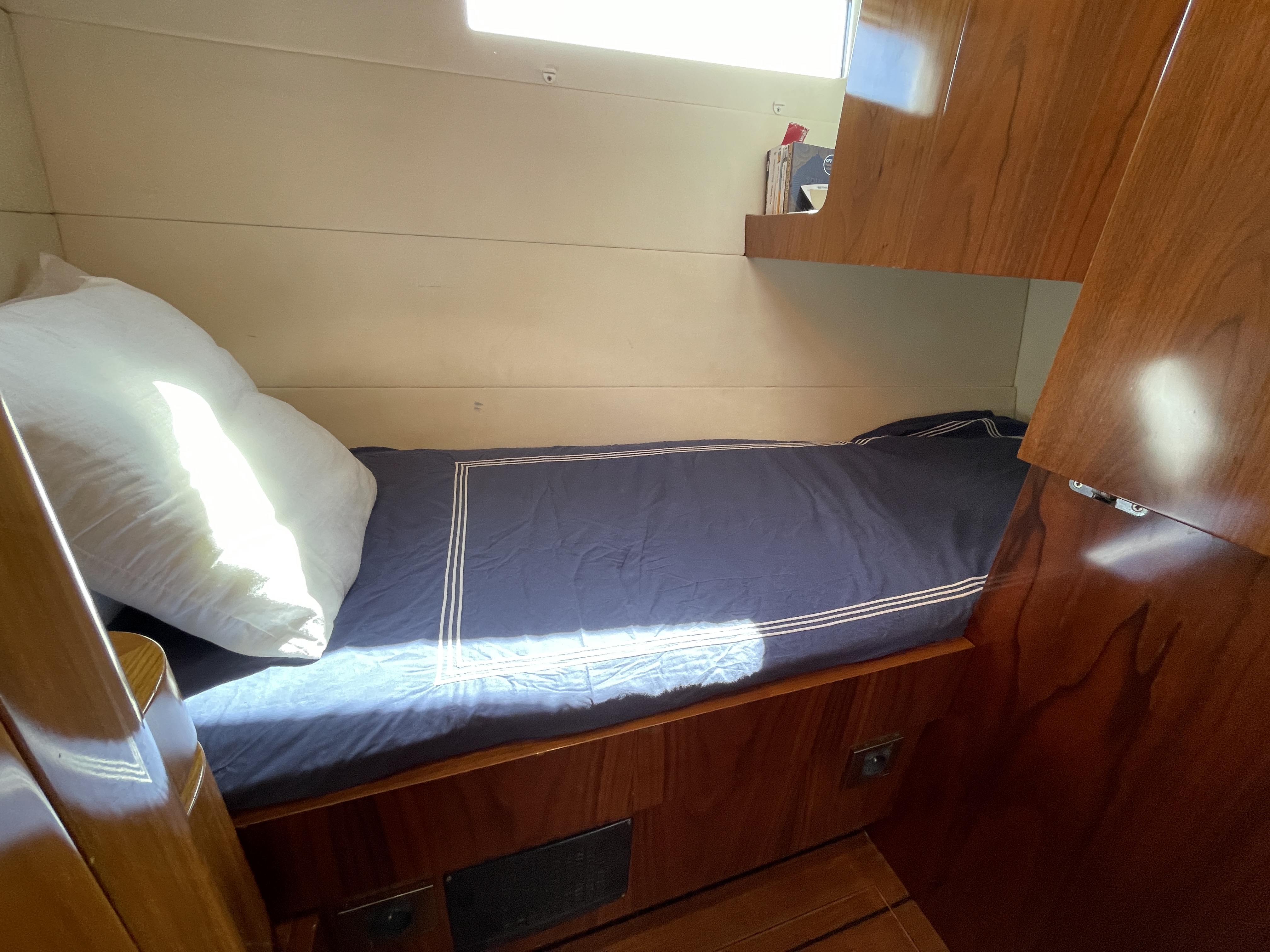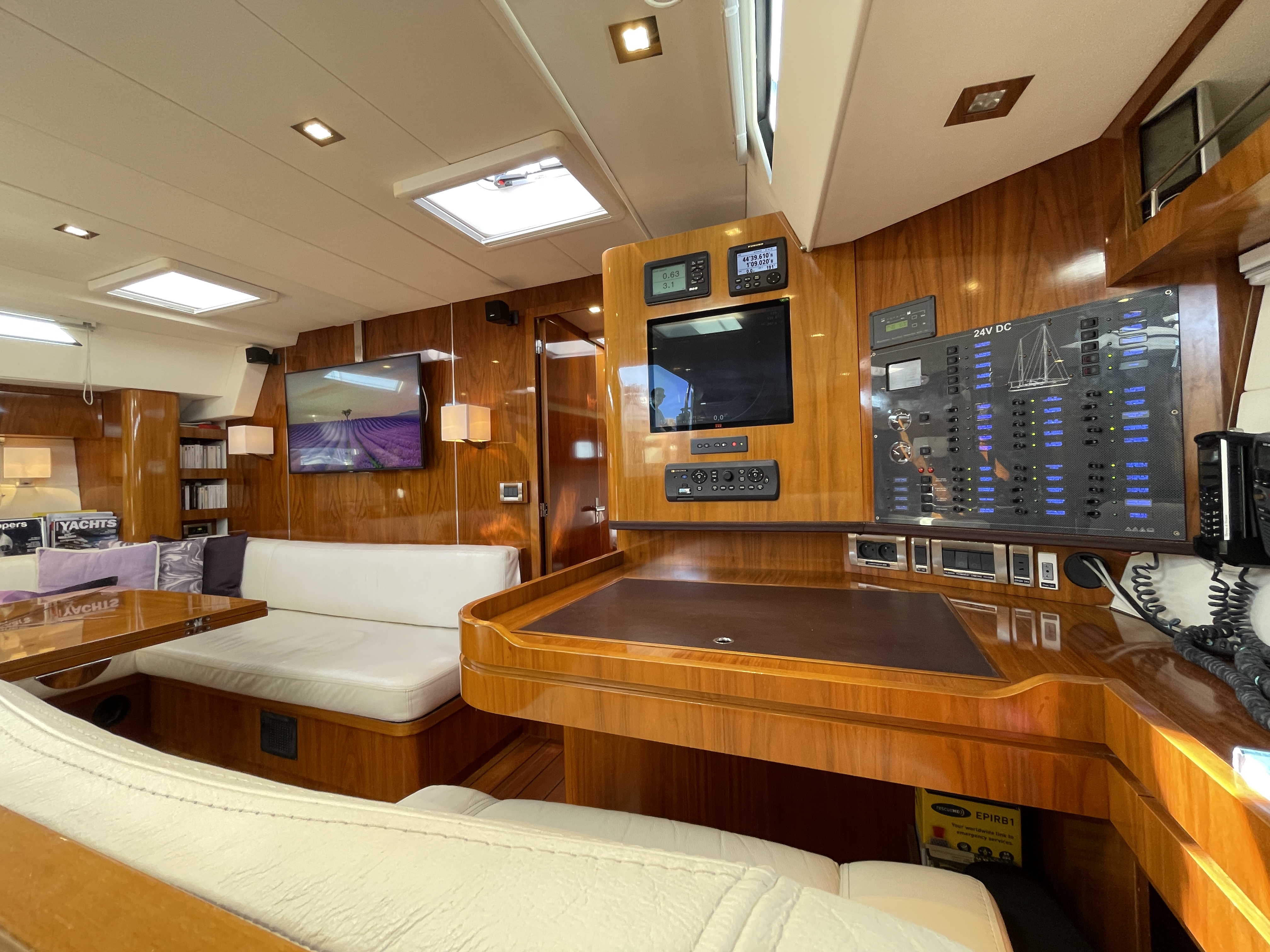 AC, Heating Webasto, Garage, dinghy & HB, Swimming plateform, Bow and Stern Thruster, 240 L H Watermaker instead 150 LH, Recent batteries and upgraded for electrical system (charger, inverter) two mooring with two windlass, full electronics, full set of sails in good condition including Gennaker, full set of covers and sun covers, sun matress, cushions in good shape etc.