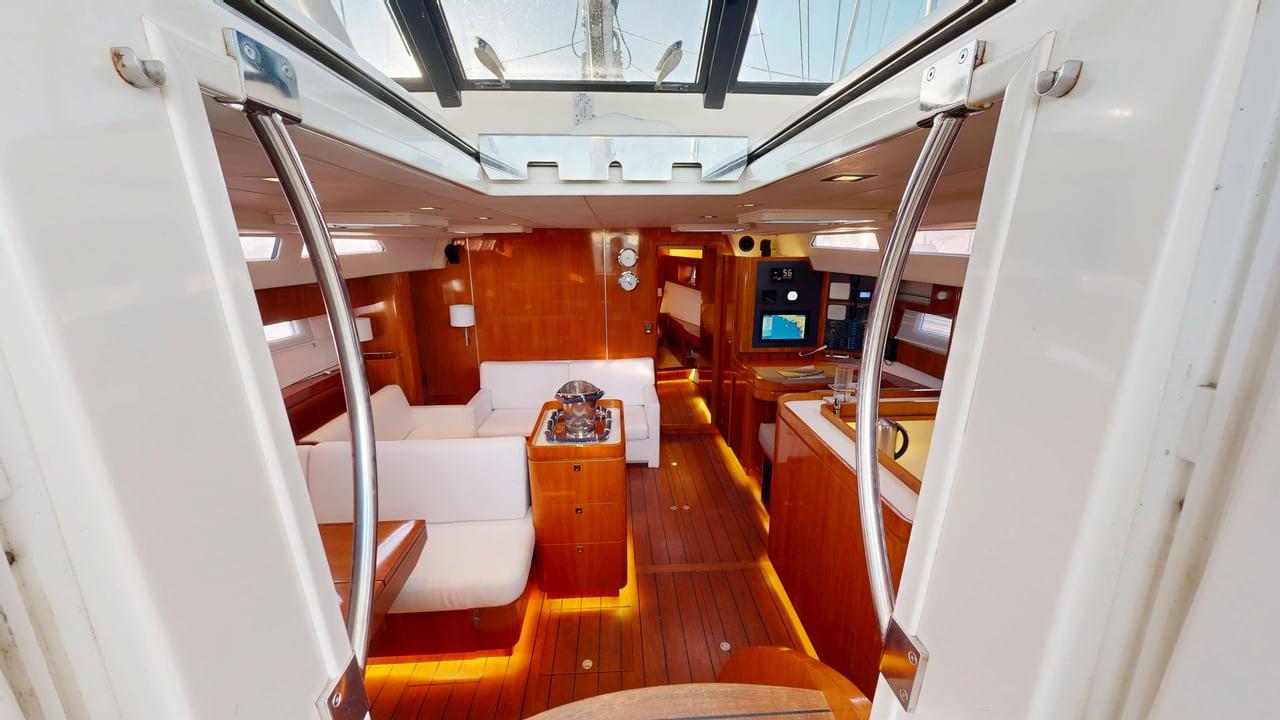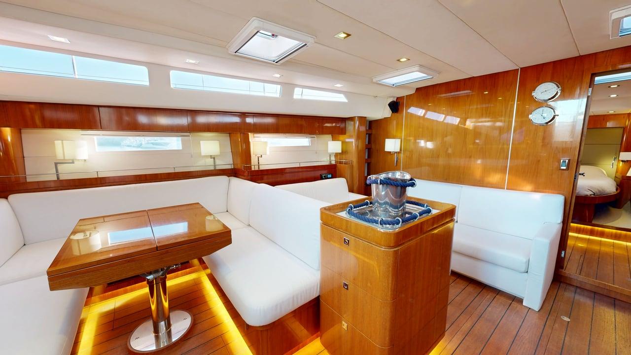 Saloon: Built-in seawater-operated fridge/freezer under the saloon seat, 220V air-conditioning, extra-large U-shaped seating around the same table, 2021 LG TV screen on the aft bulkhead near the cockpit.