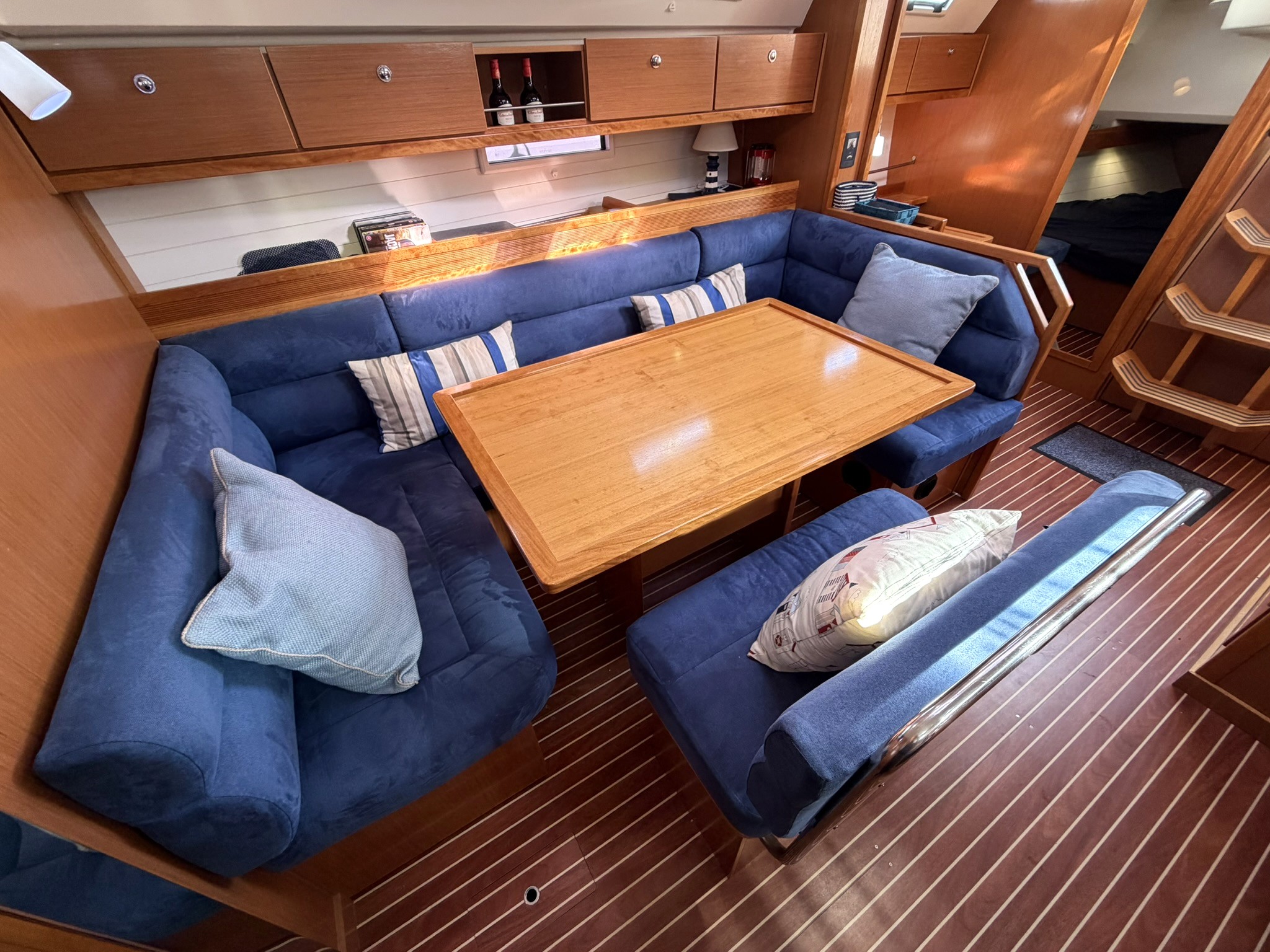 Large C-shaped dinette with storage below (stbd).