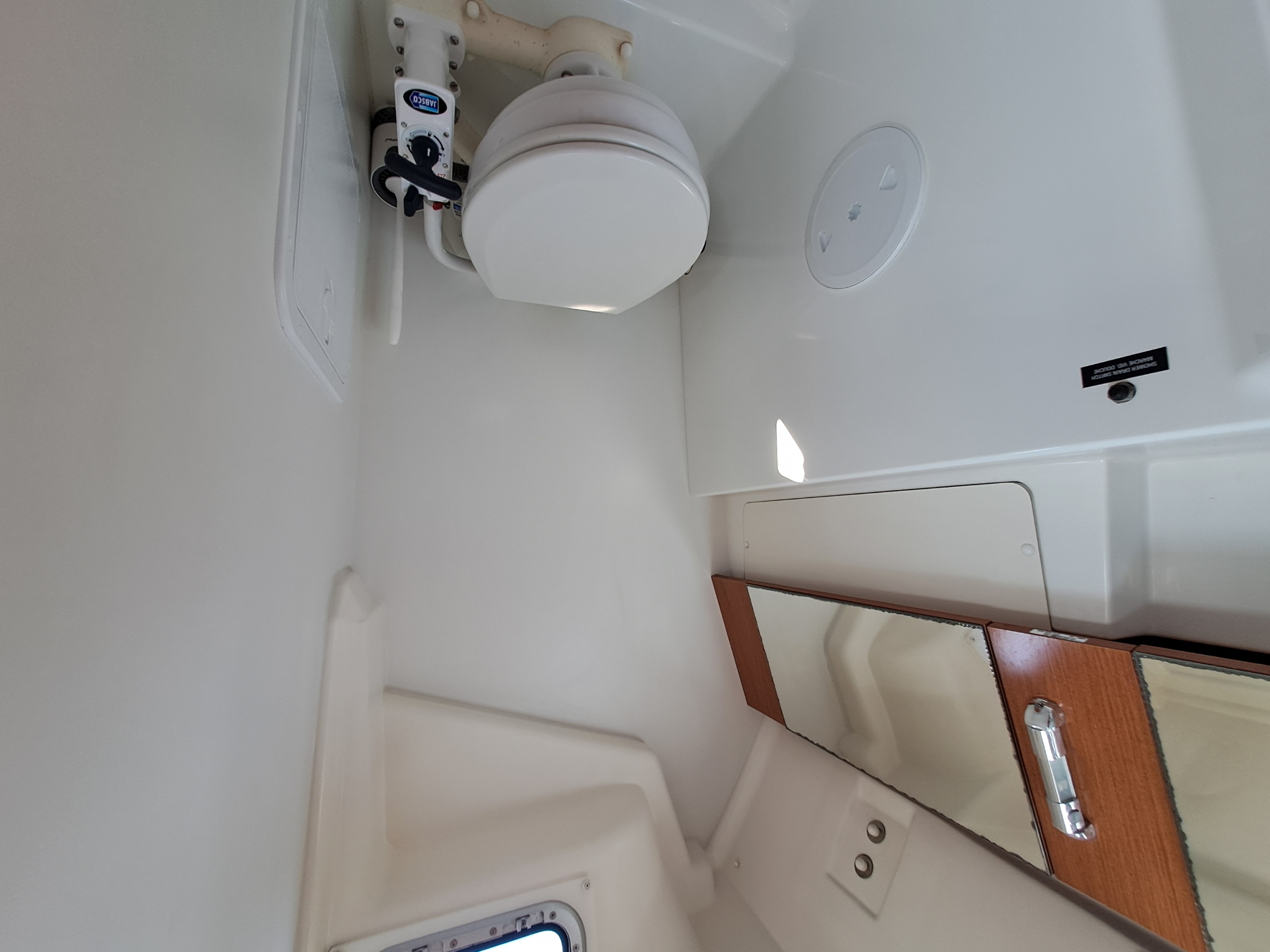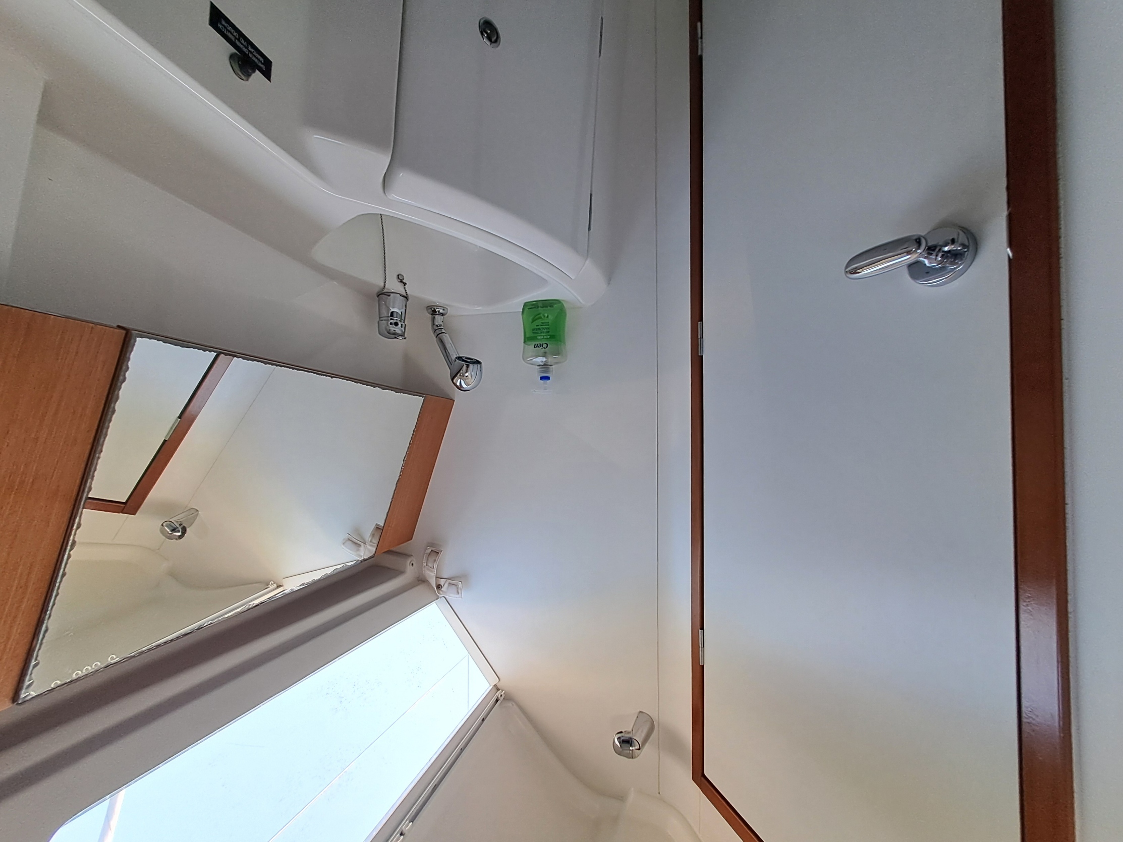 Heads compartment to port of companionway with sea toilet, washbasin, shower and mirror