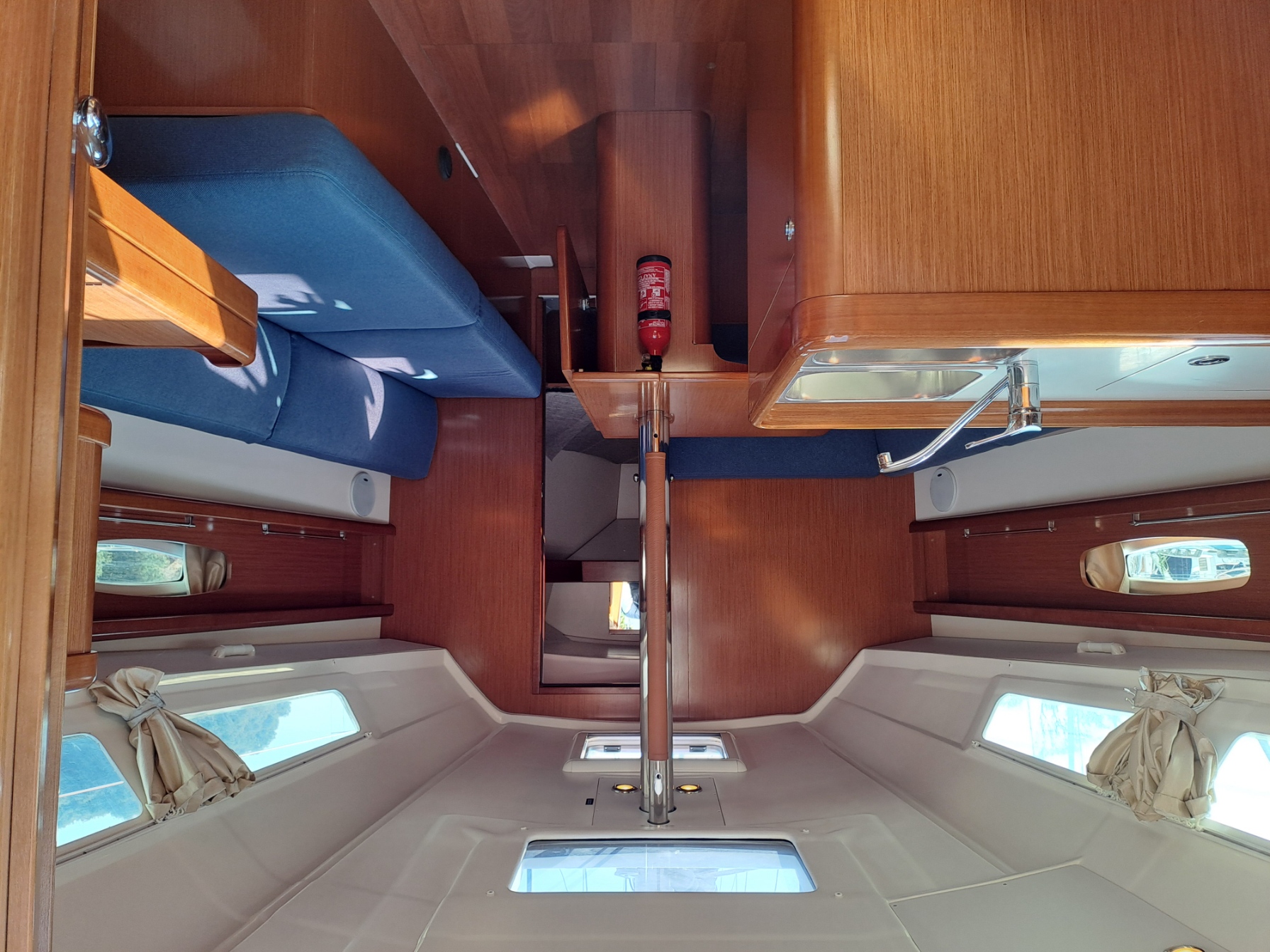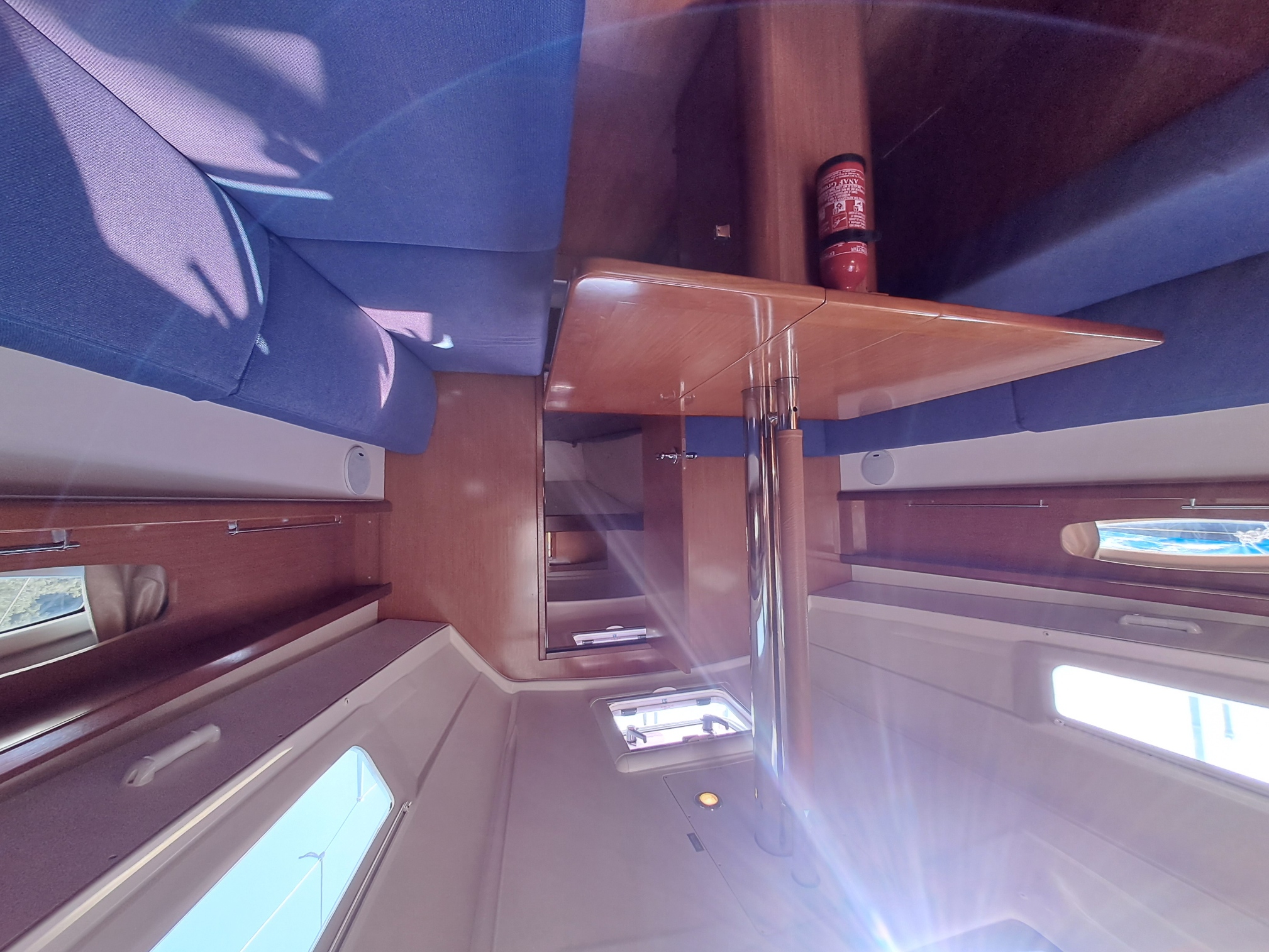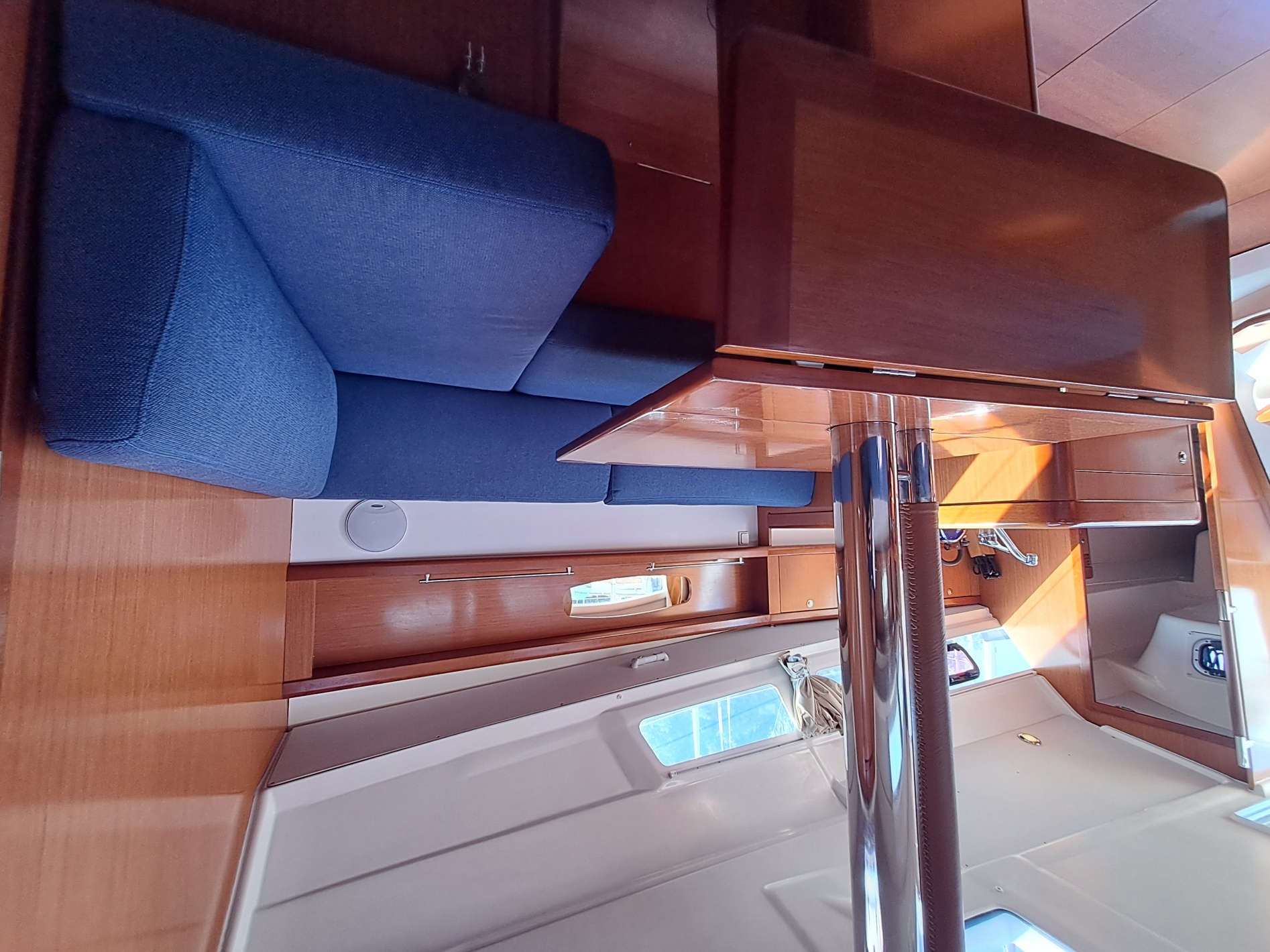 L-shaped settee to Port and straight sofa to starboard around folding table