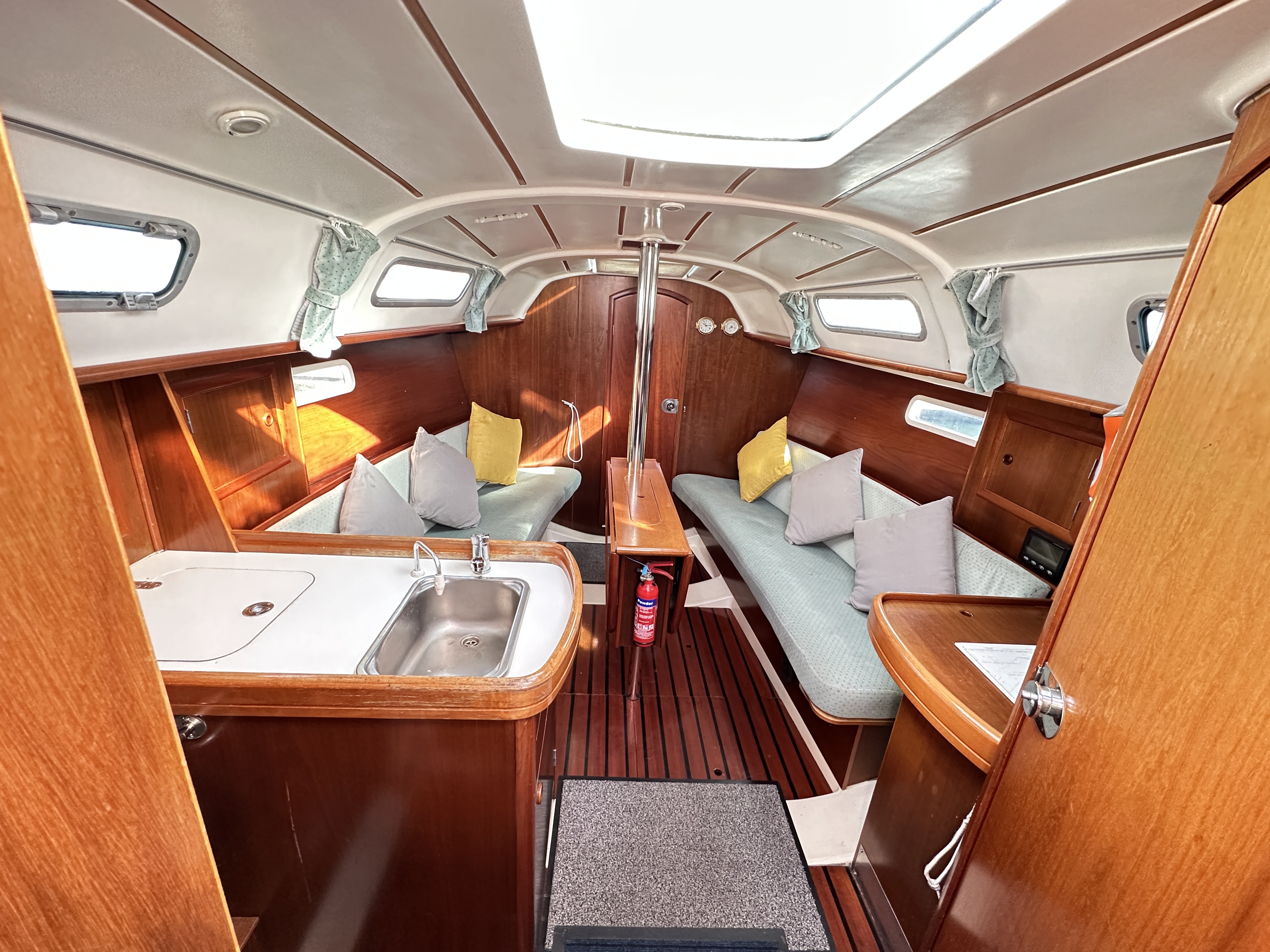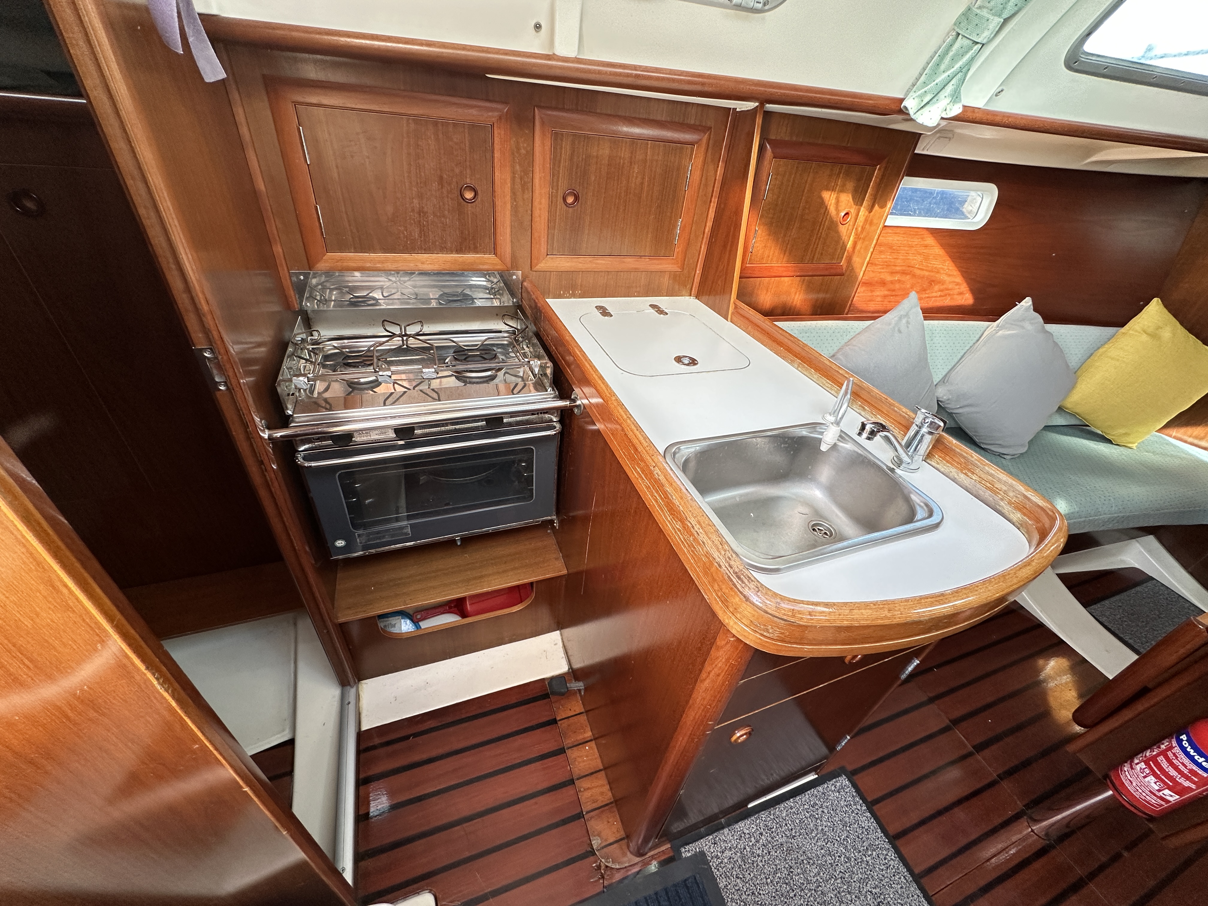 L-shaped galley to port with laminated worktop, stainless steel sink with mixer tap, 2 burner gas hob and oven (gas), 60 litre refrigerator