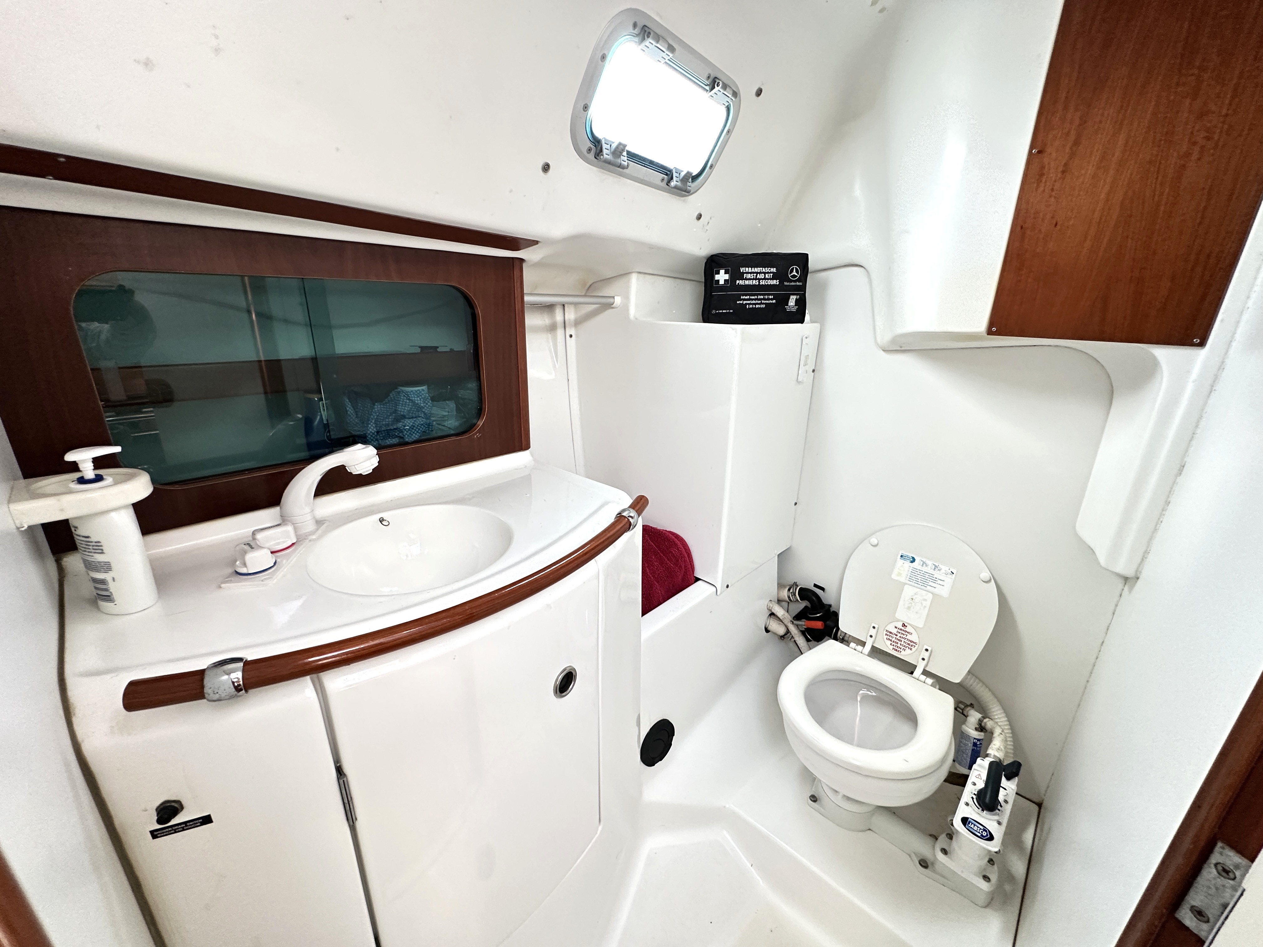 Head is situated to starboard aft with Jabsco WC, handbasin with mixer tap and shower