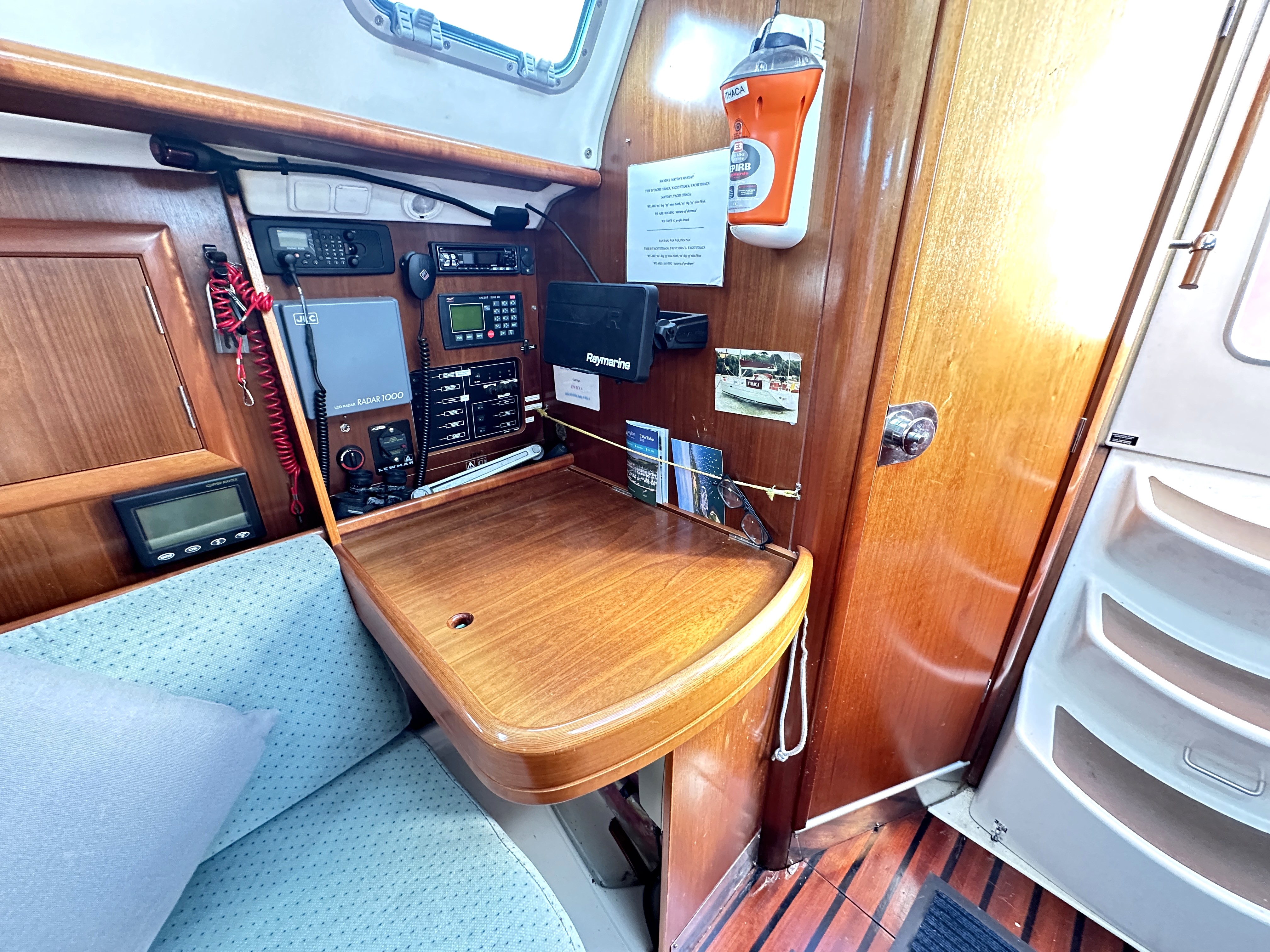 Navigation station to starboard with aft facing chart table, lockers and instrument panel