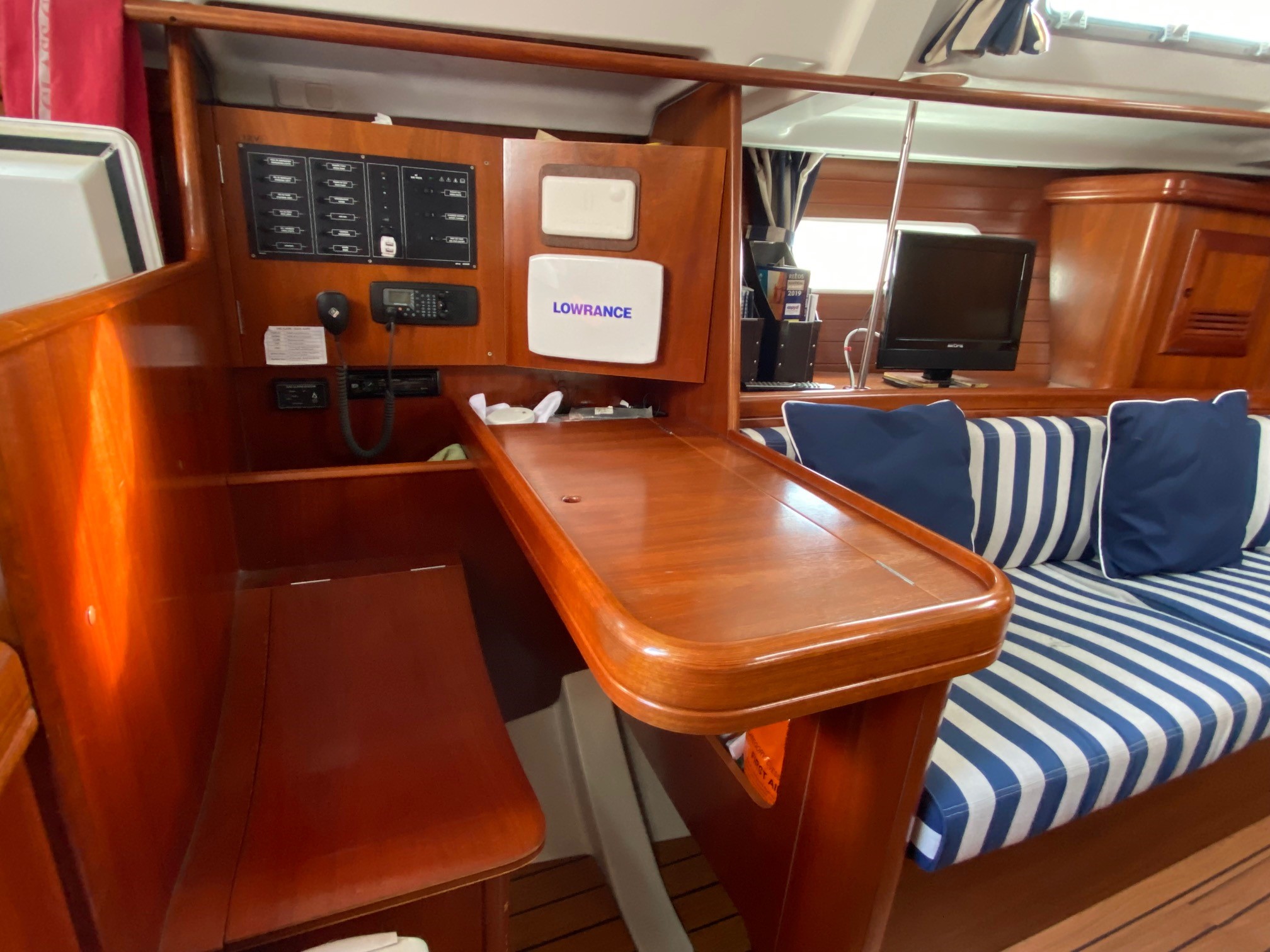 Forward-facing nav station/chart table located to port, with stool seating, electrical panel access, and good stowage