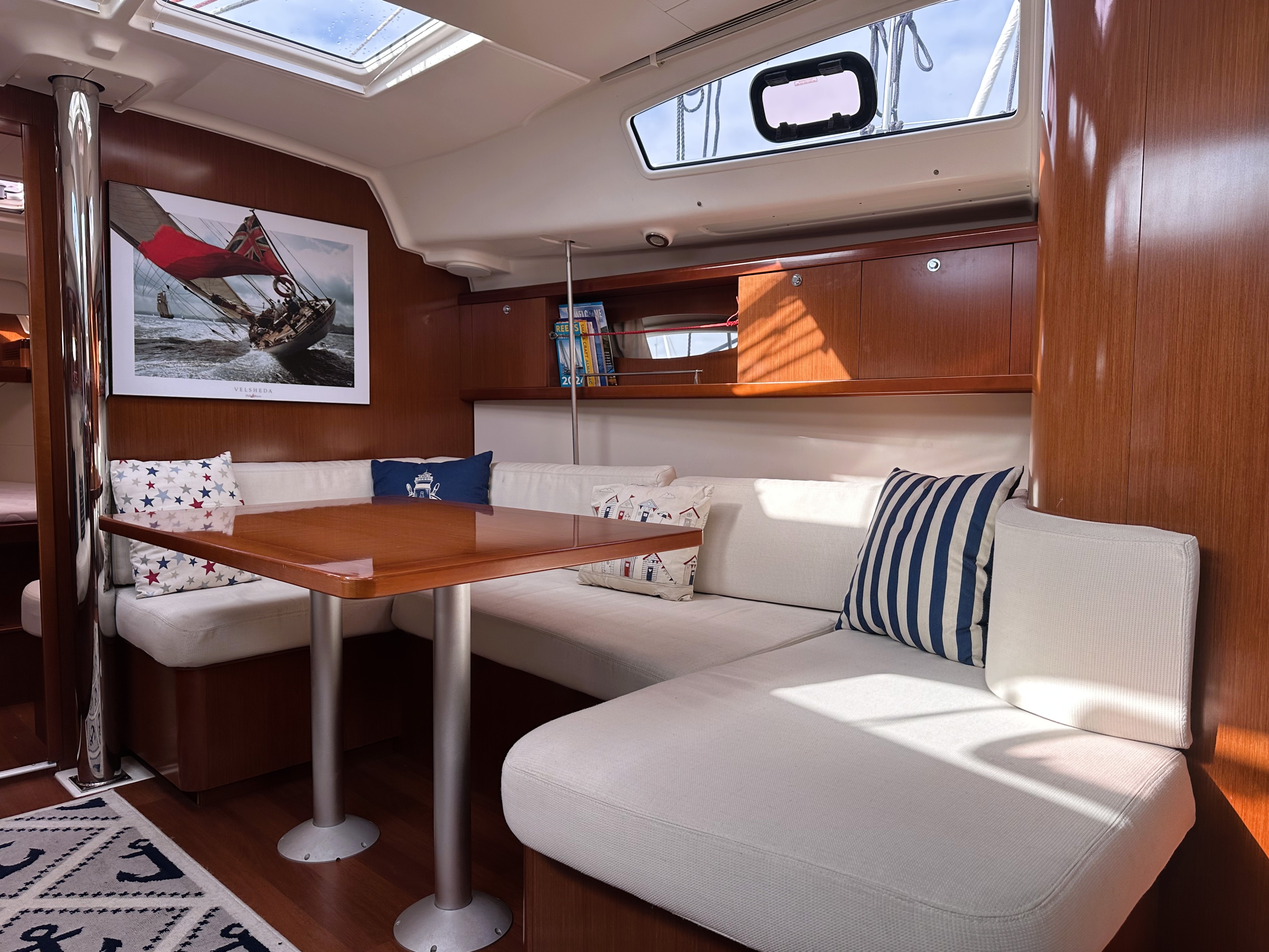 - U-shaped seating to starboard around table (converting to double berth with short table legs and infill cushion) with excellent storage beneath.