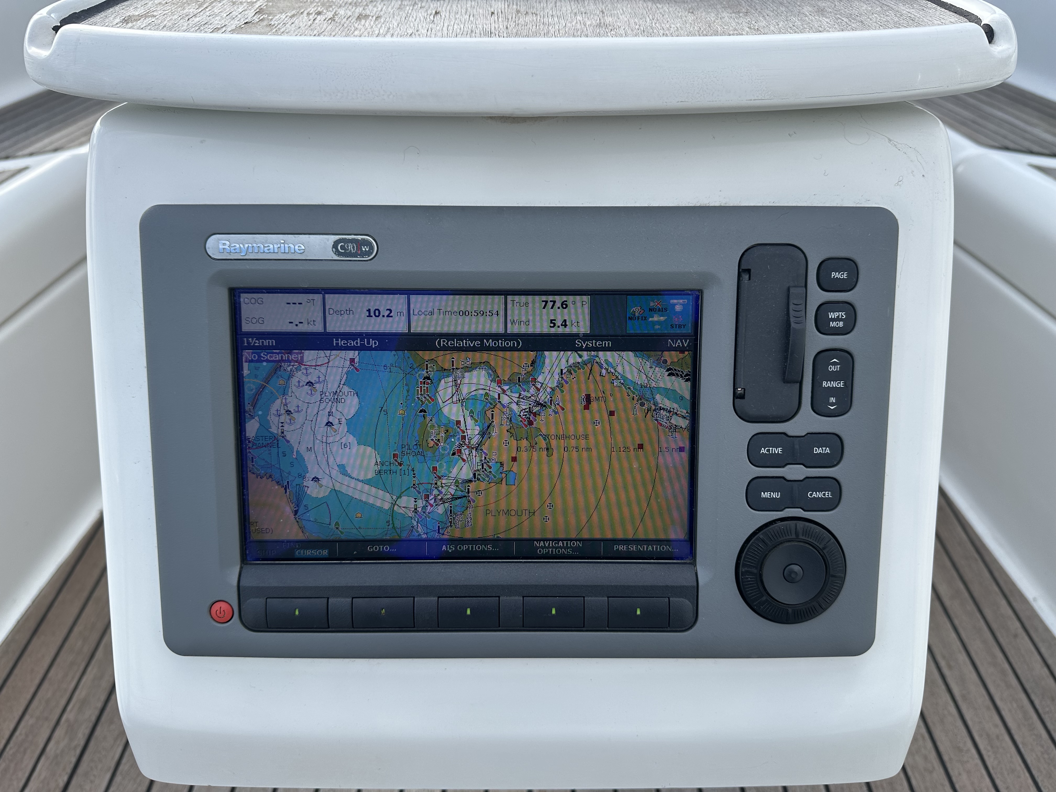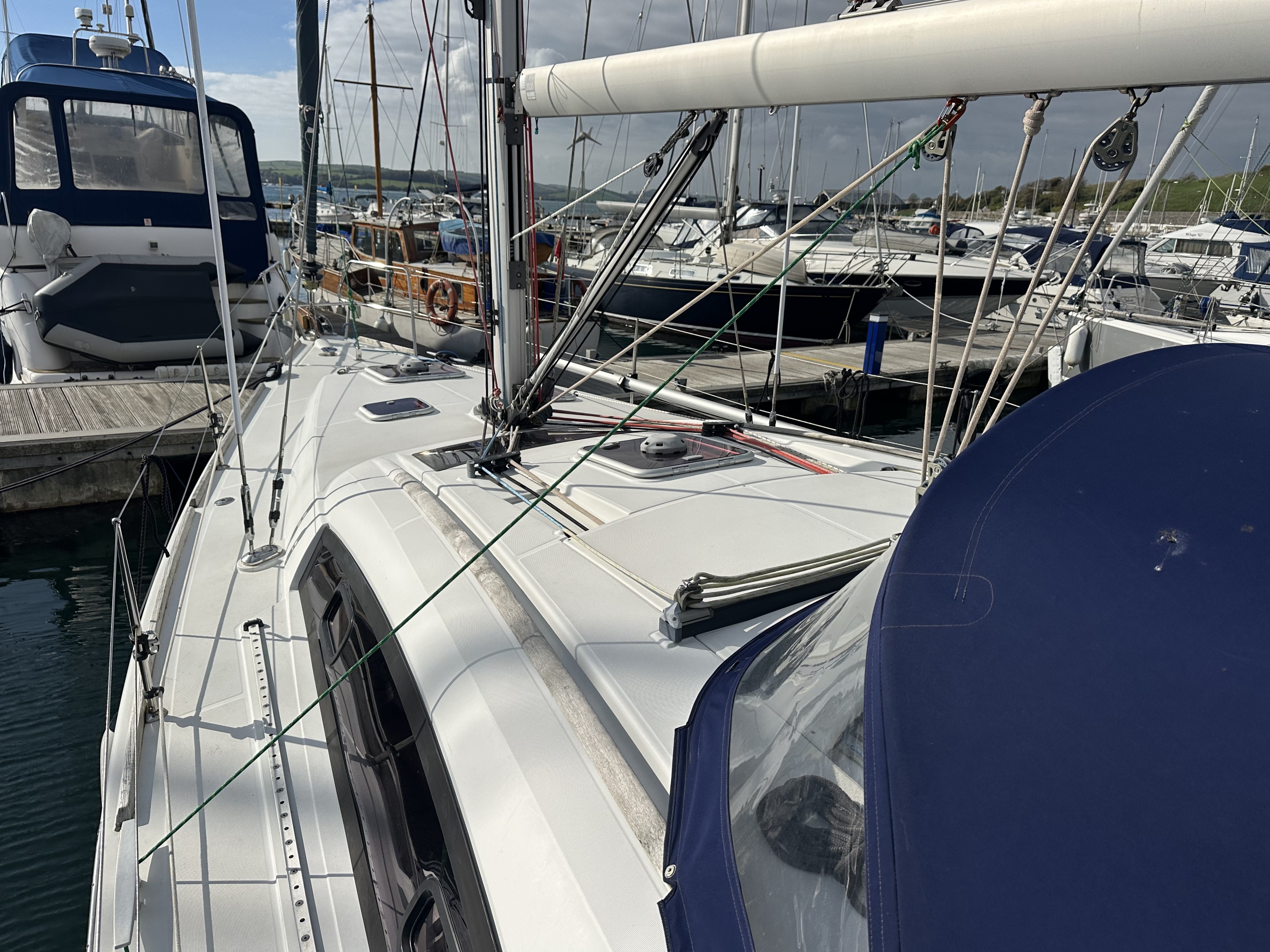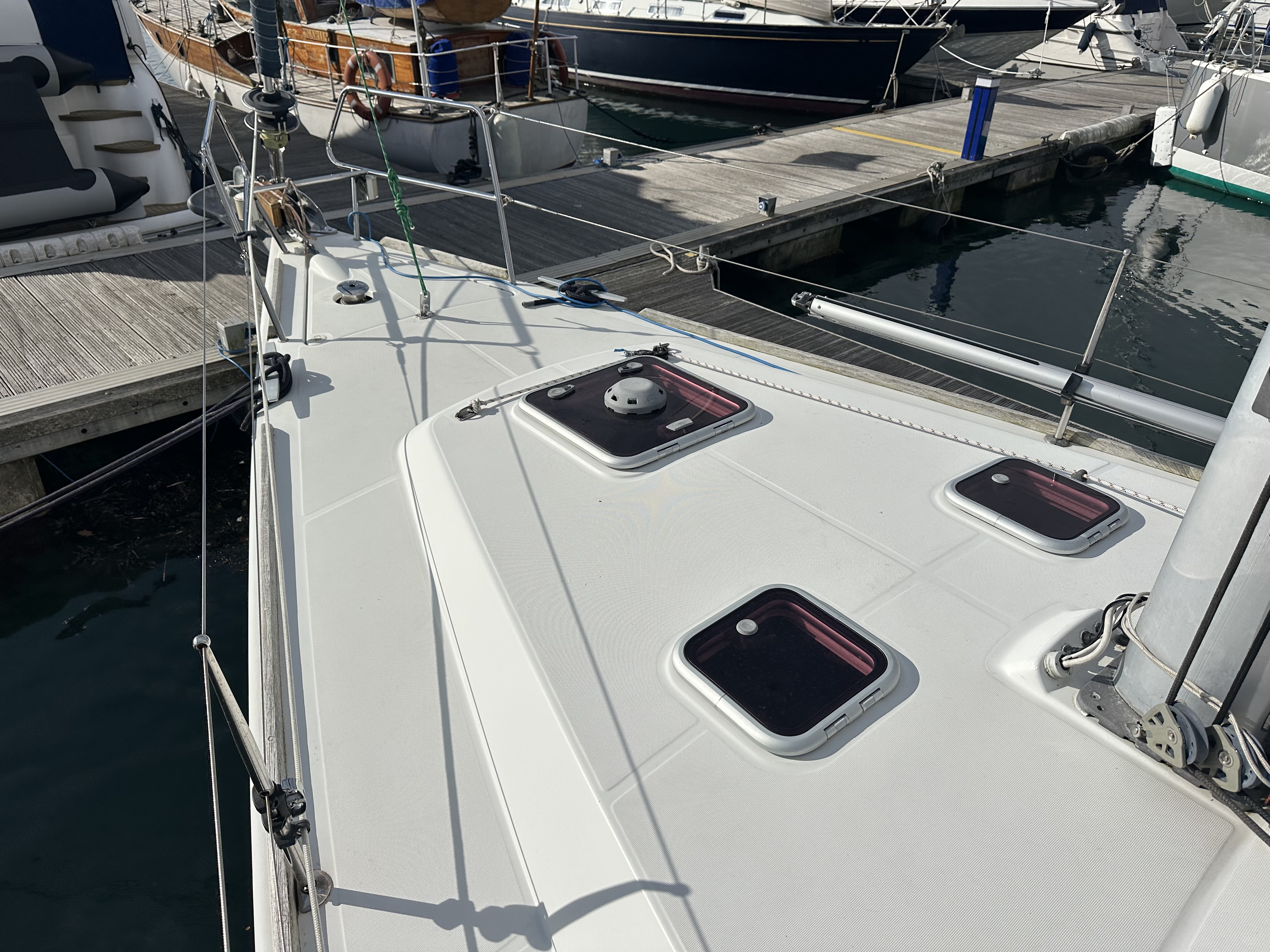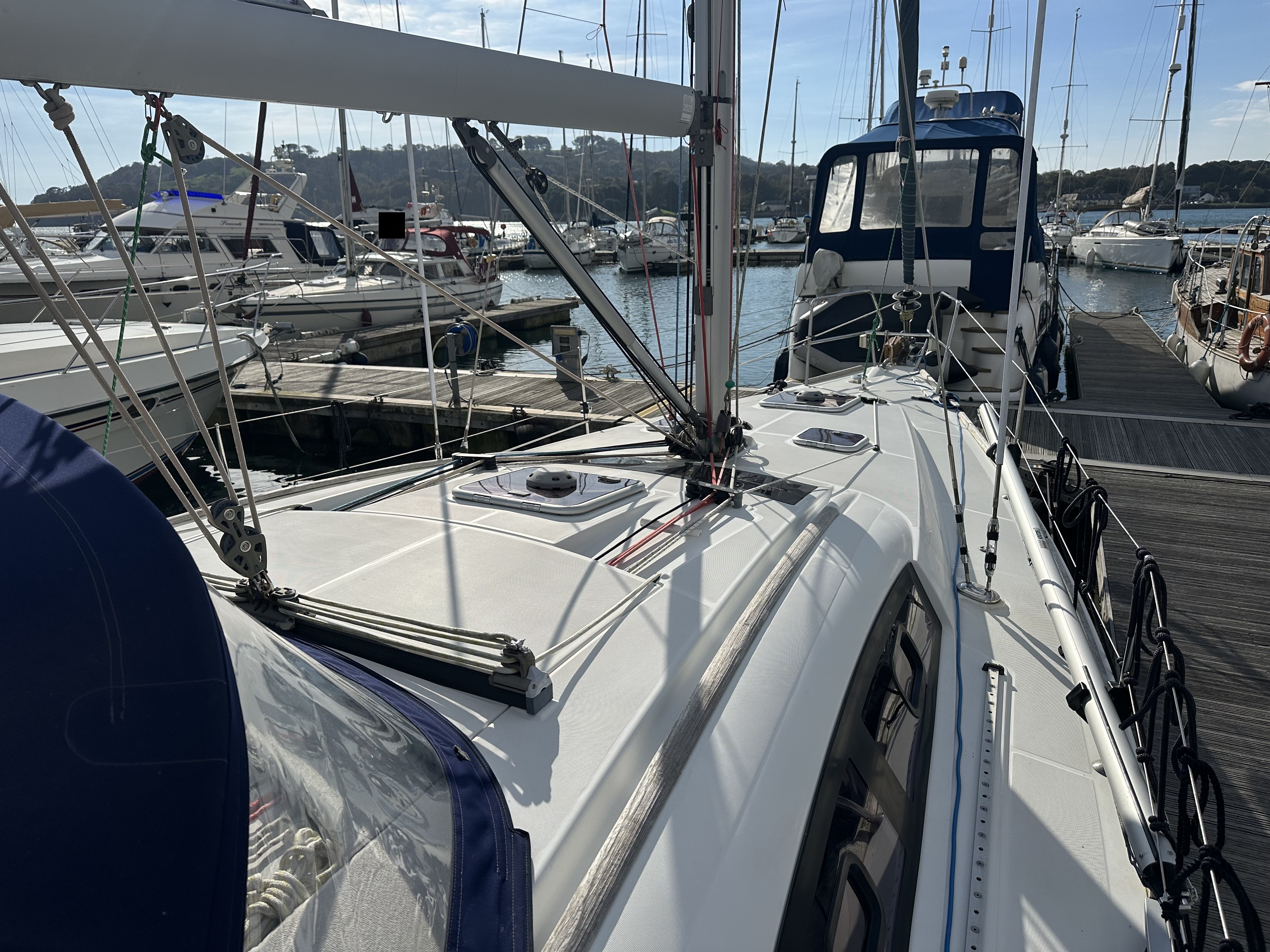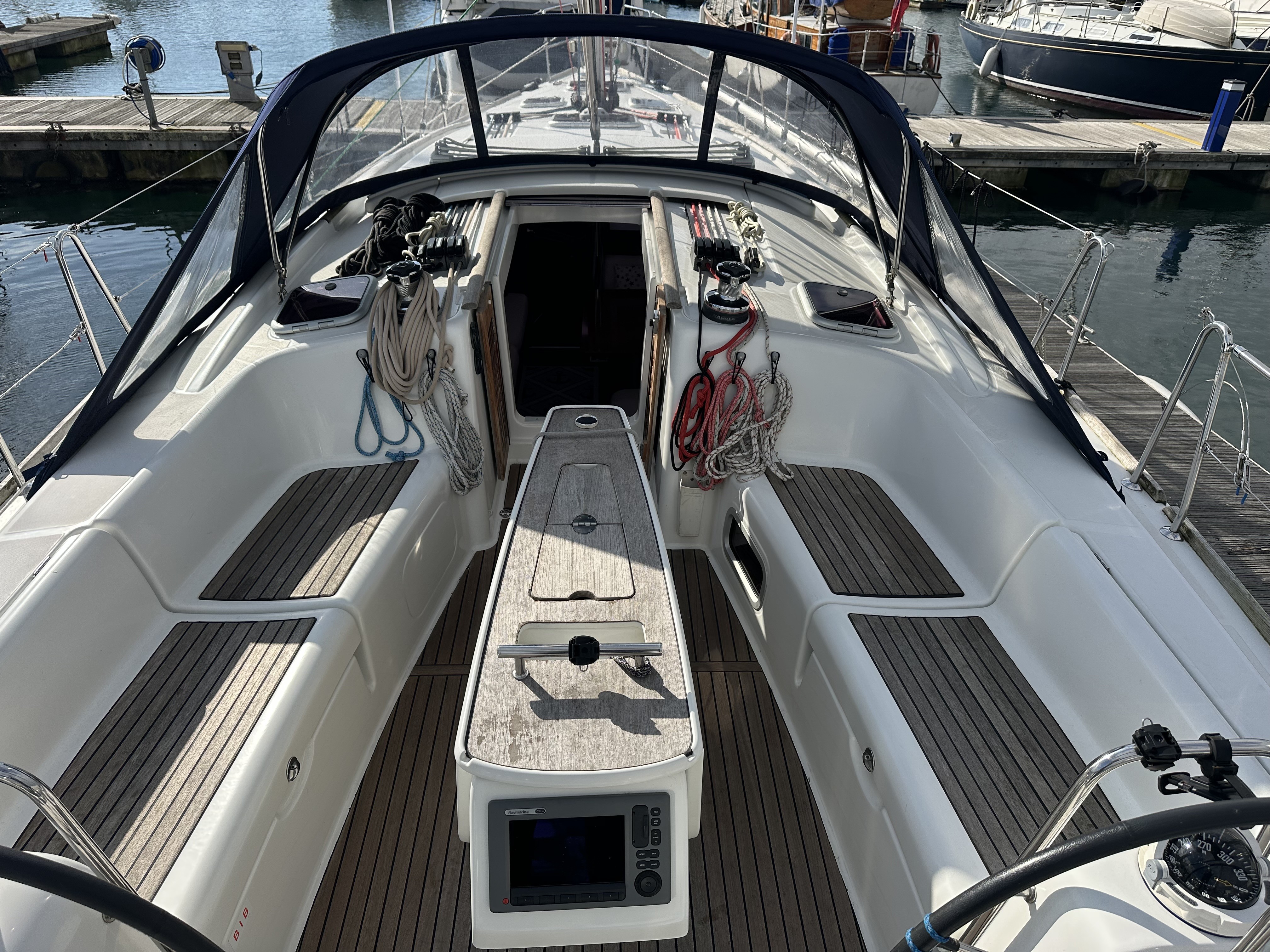 "Arya" is an 'Owner's version' (2 cabin) configured with in-mast furling mainsail and deep fin keel. 40hp Yanmar engine with circa 740 hrs. Recently set up for cruising including new standing rigging (2025), largely renewed running rigging (2025), AIS (2023), autopilot (2025), stainless-steel bowsprit (2024), downwind pole for chute and genoa (2025), Marship "Diesel Dipper" (2025), solar installation and inverter. Her spacious accommodation above and below decks offers comfortable cruising with a particularly sizeable aft cabin, saloon / galley, and very large lazarette. Her extensive inventory includes a cruising chute on carbon furler, bow thruster, two Raymarine C90W colour chartplotters, radar, Eberspacher cabin heating, bimini, Darglow three-bladed folding prop & HydroAxe rope cutter, electric windlass, liferaft, EPIRB, Fusion stereo, holding tank and more. Professionally polished and antifouled annually.