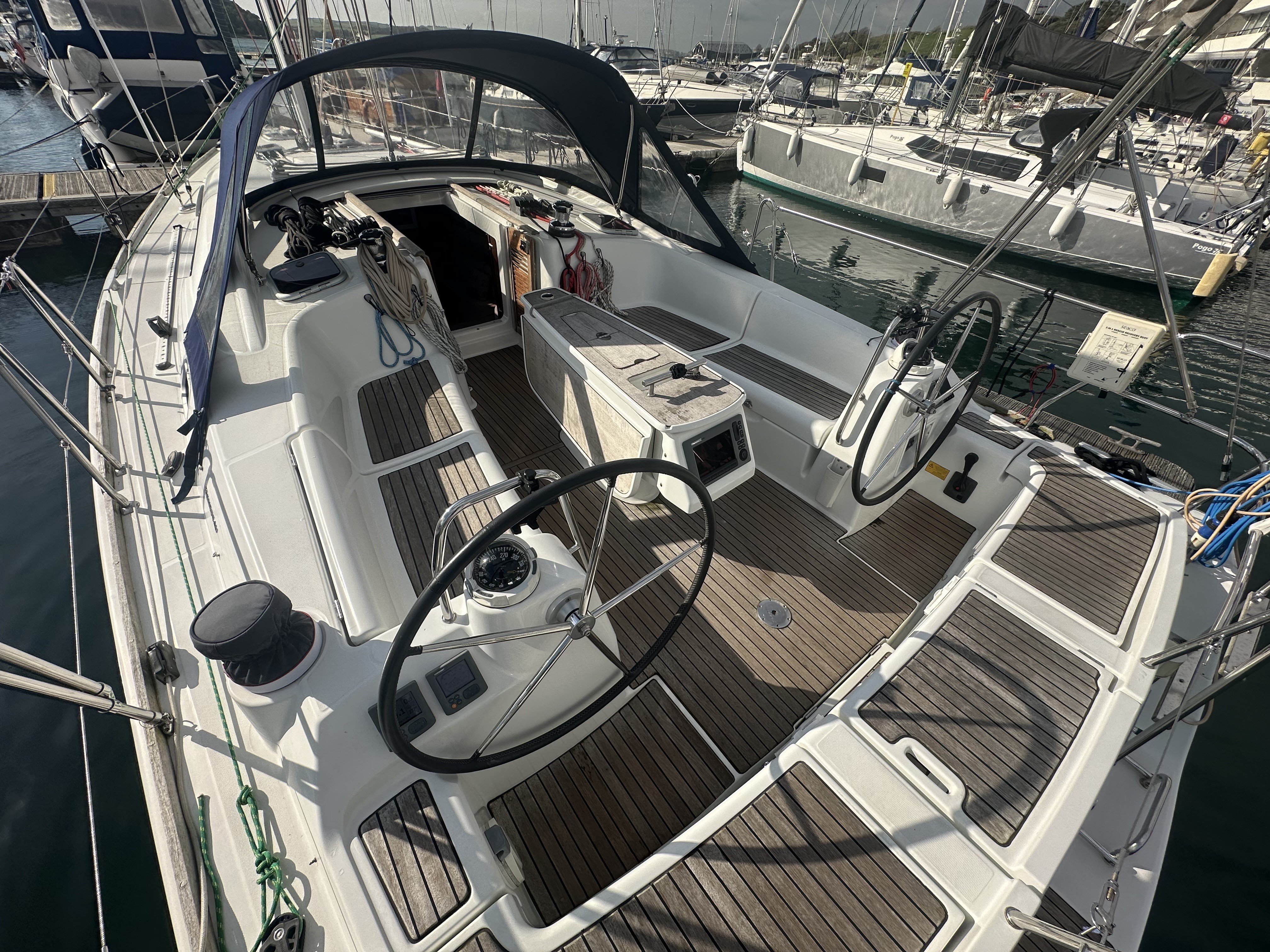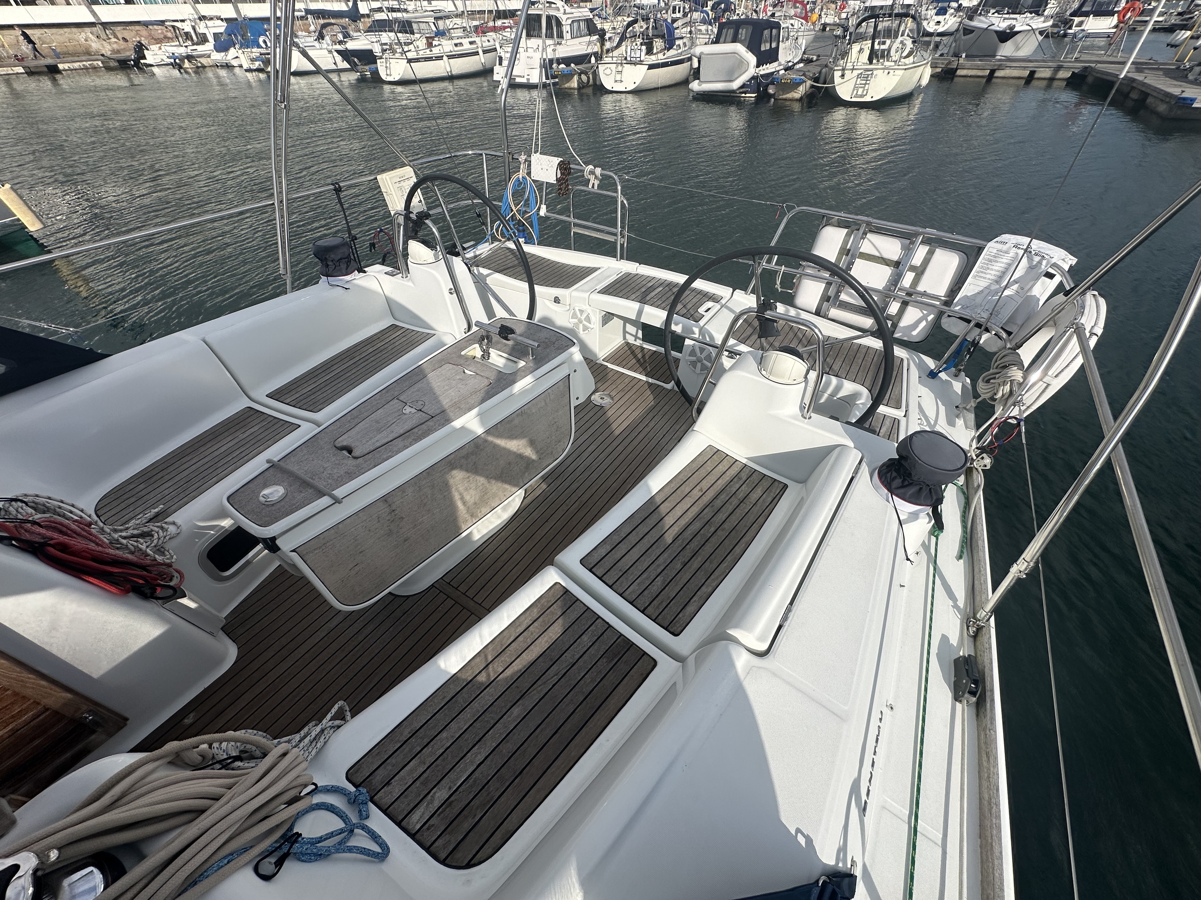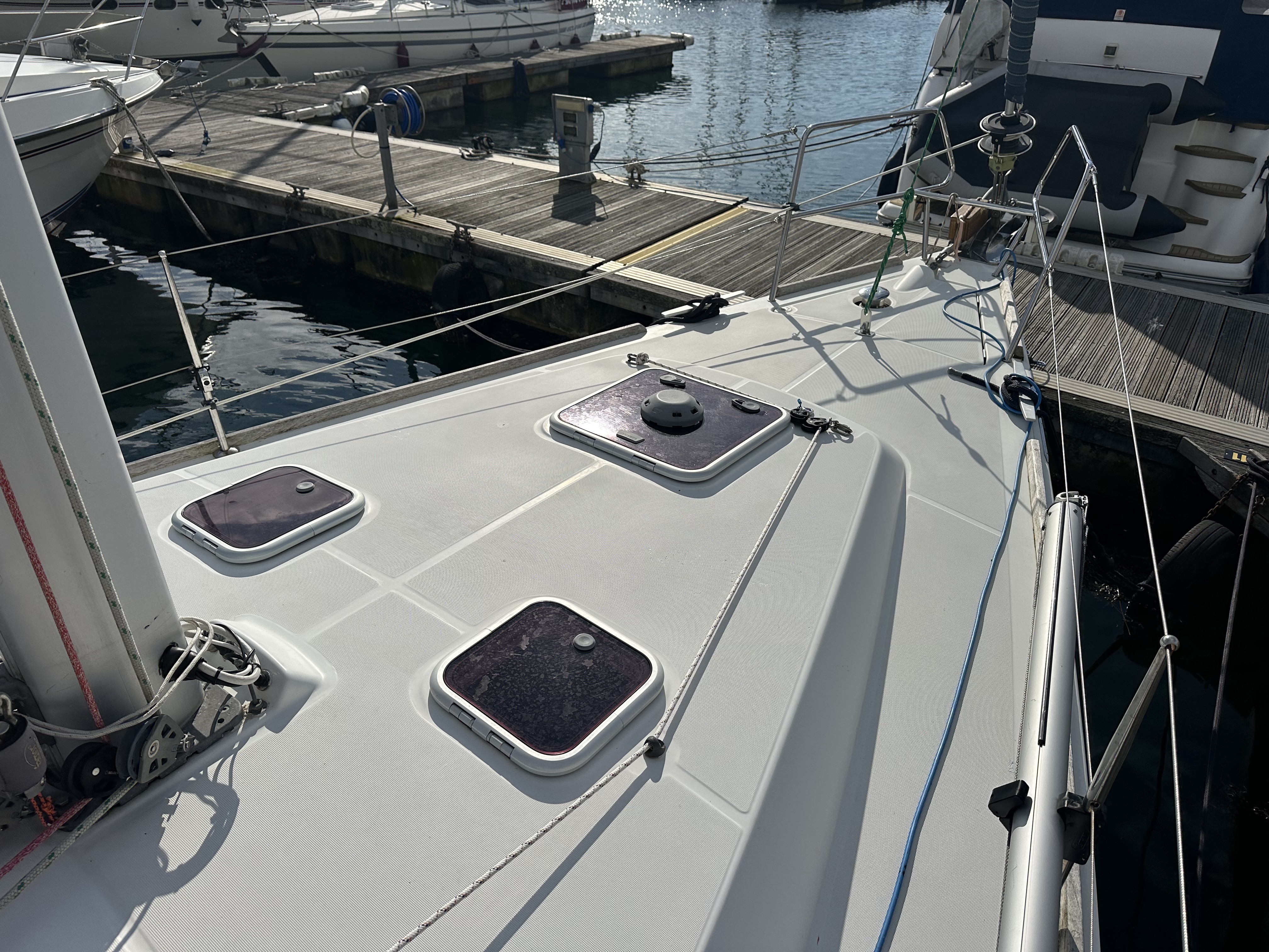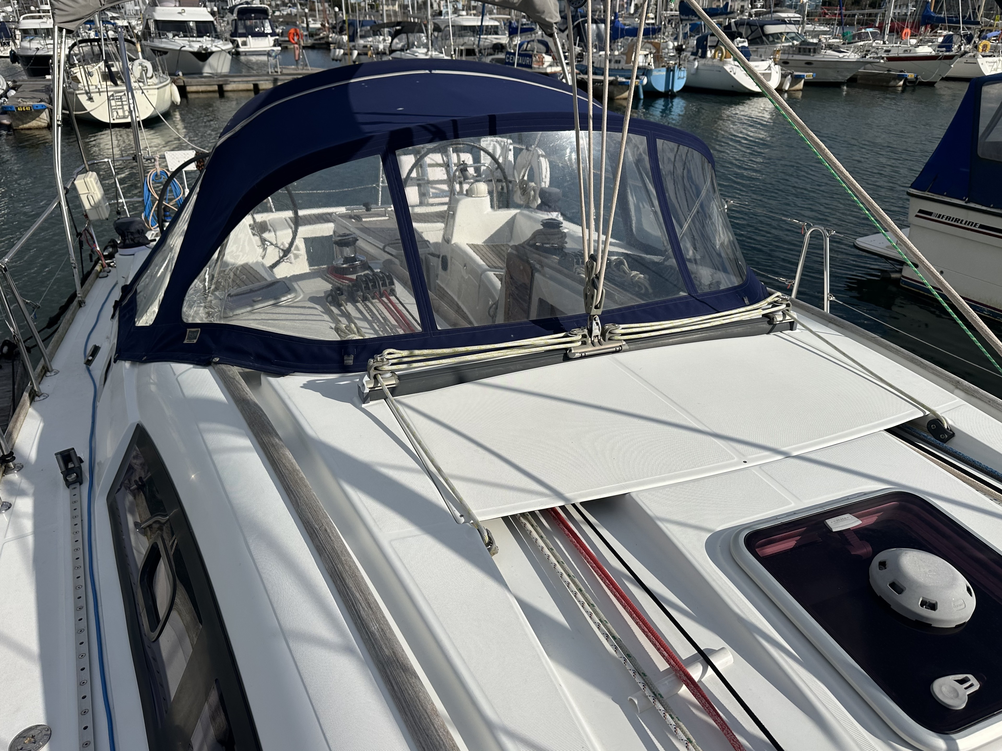 "Arya" is an 'Owner's version' (2 cabin) configured with in-mast furling mainsail and deep fin keel. 40hp Yanmar engine with circa 740 hrs. Recently set up for cruising including new standing rigging (2025), largely renewed running rigging (2025), AIS (2023), autopilot (2025), stainless-steel bowsprit (2024), downwind pole for chute and genoa (2025), Marship "Diesel Dipper" (2025), solar installation and inverter. Her spacious accommodation above and below decks offers comfortable cruising with a particularly sizeable aft cabin, saloon / galley, and very large lazarette. Her extensive inventory includes a cruising chute on carbon furler, bow thruster, two Raymarine C90W colour chartplotters, radar, Eberspacher cabin heating, bimini, Darglow three-bladed folding prop & HydroAxe rope cutter, electric windlass, liferaft, EPIRB, Fusion stereo, holding tank and more. Professionally polished and antifouled annually.