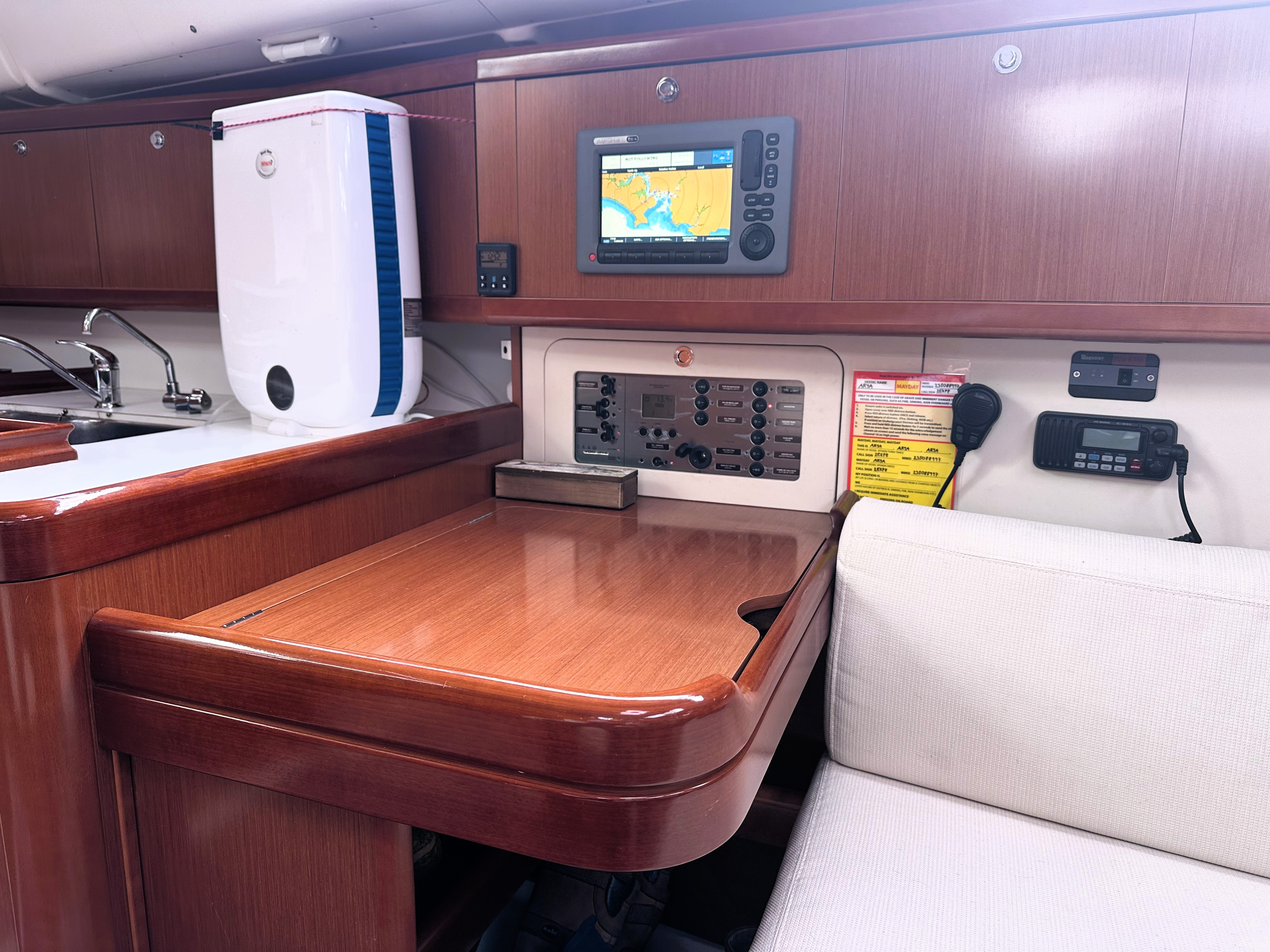 - Large aft facing navigation station to port with red lighting, chart stowage, AC/DC switch panel.