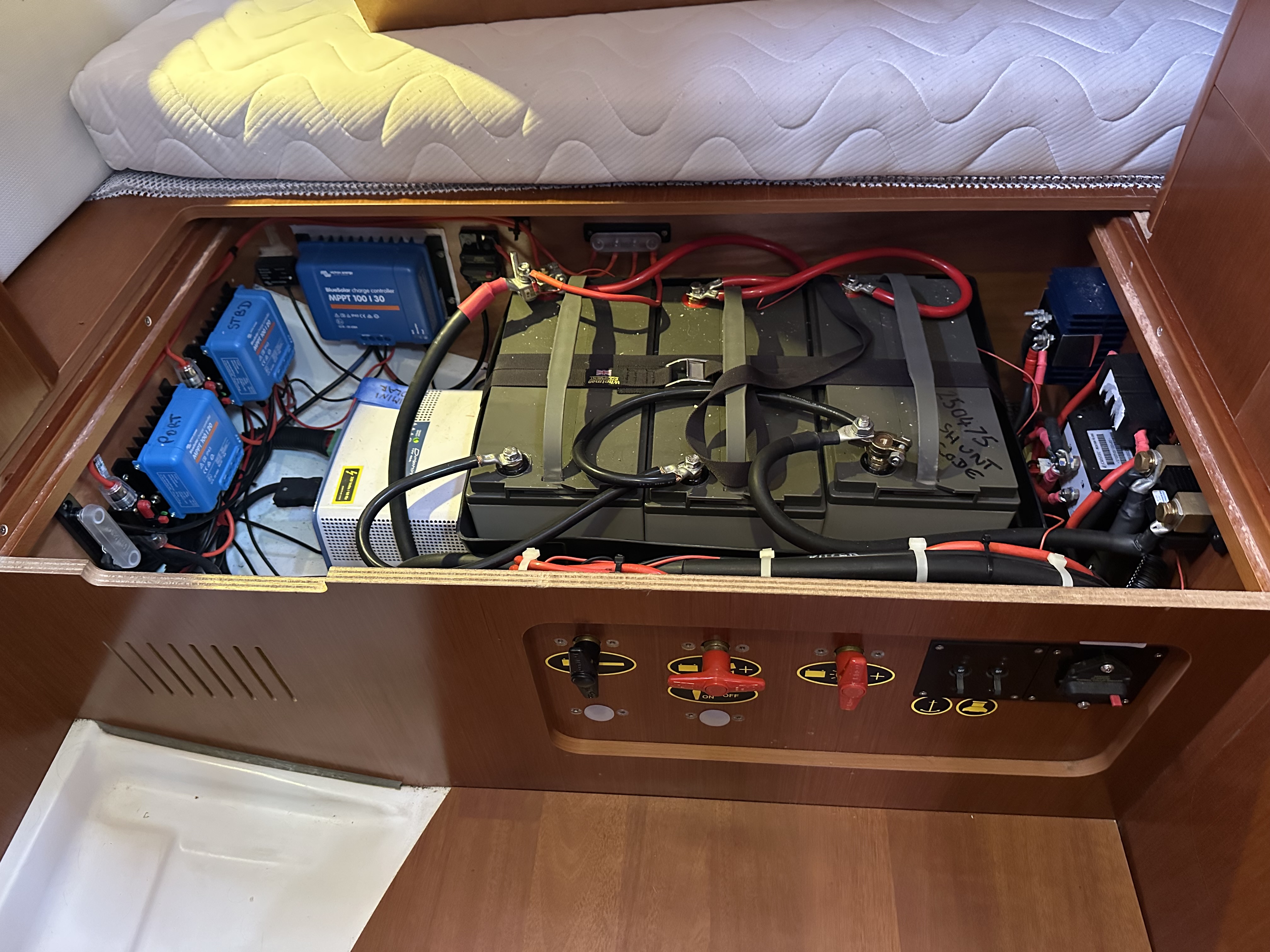 Solar installation for rails and bimini totally 400W on separate Victron BlueSolar Charge Controllers (MPPT 100 1 30 + 2x MPPT 100 1 20) with Victron smart shunt. - All with Bluetooth monitoring.