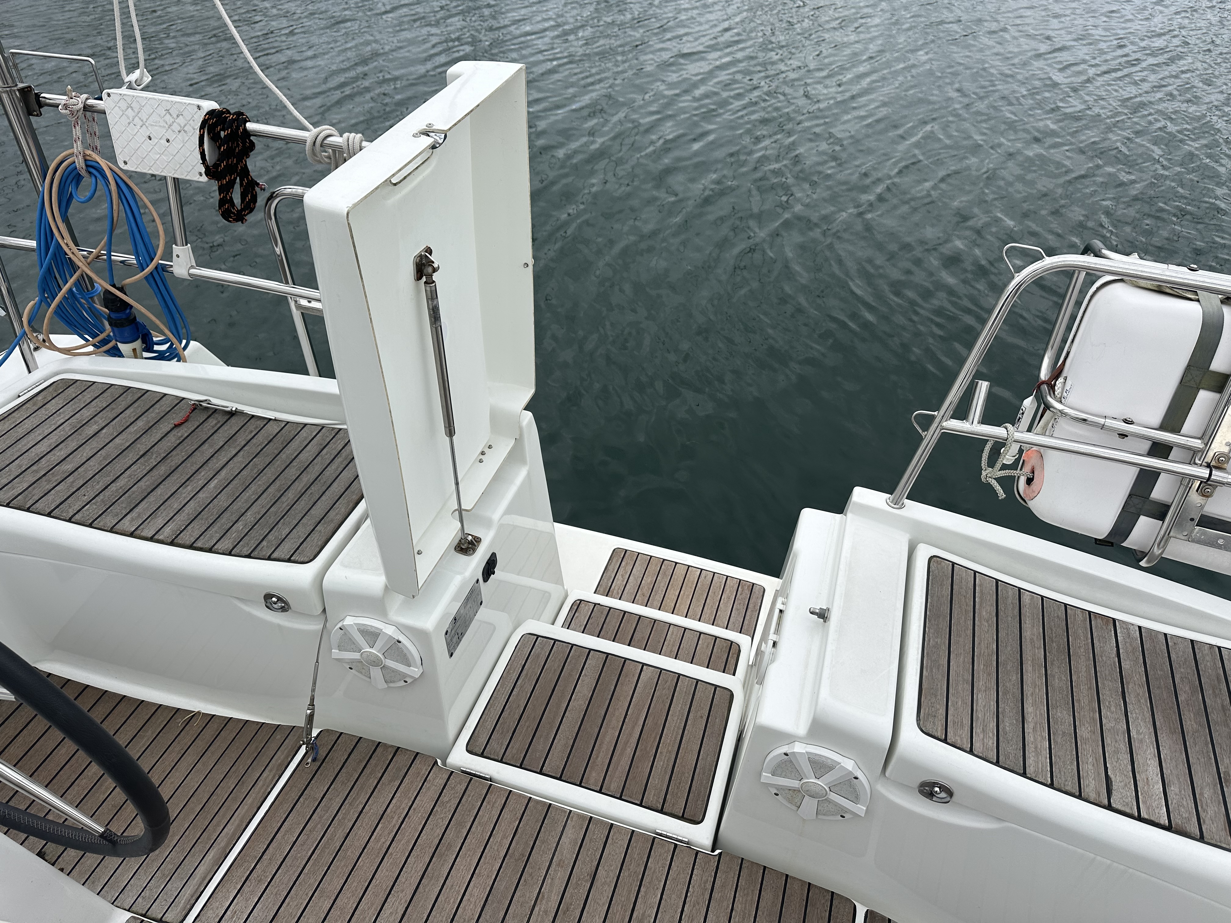 - Transom bench seat with middle opening section allowing access to bathing platform.