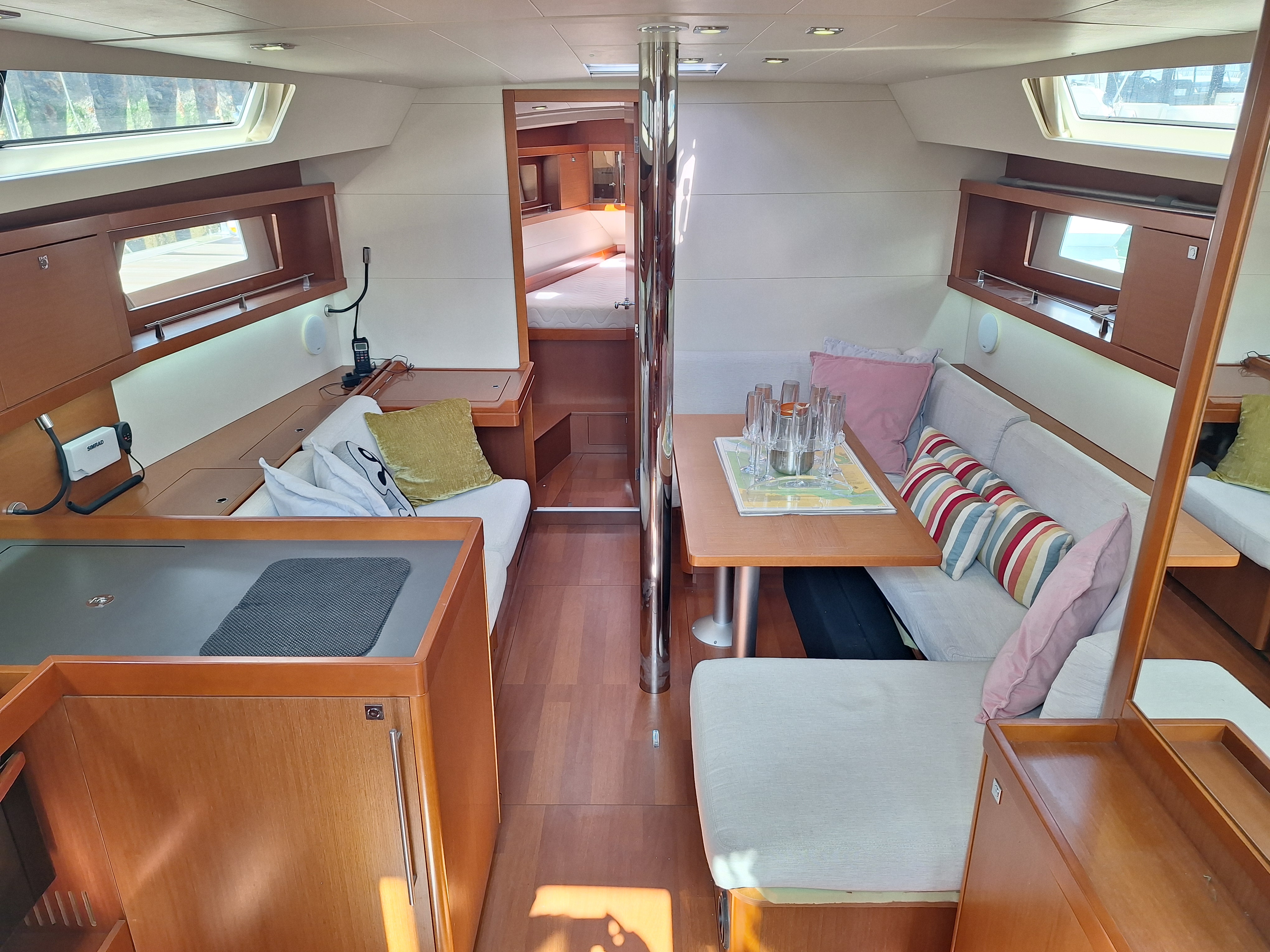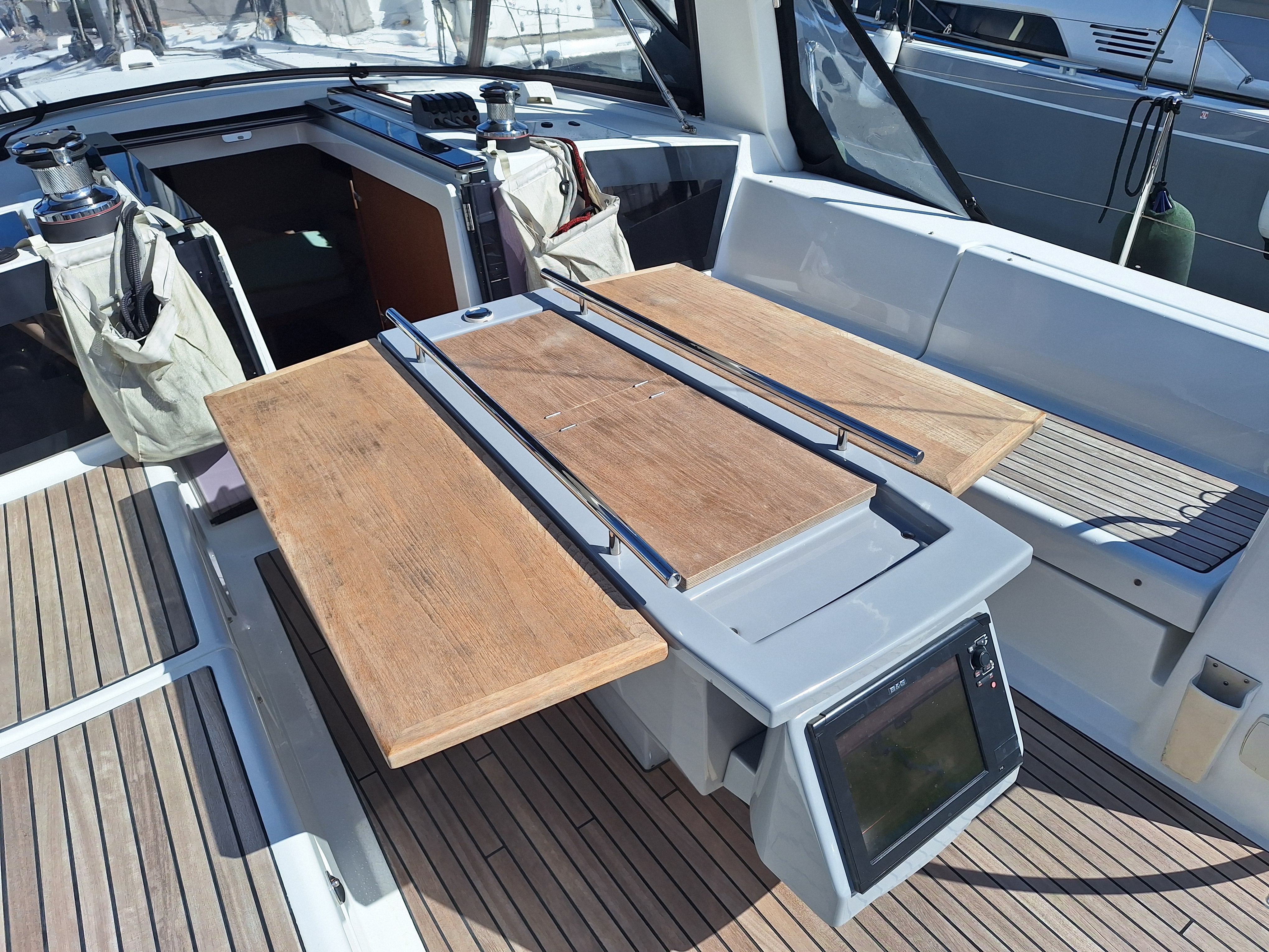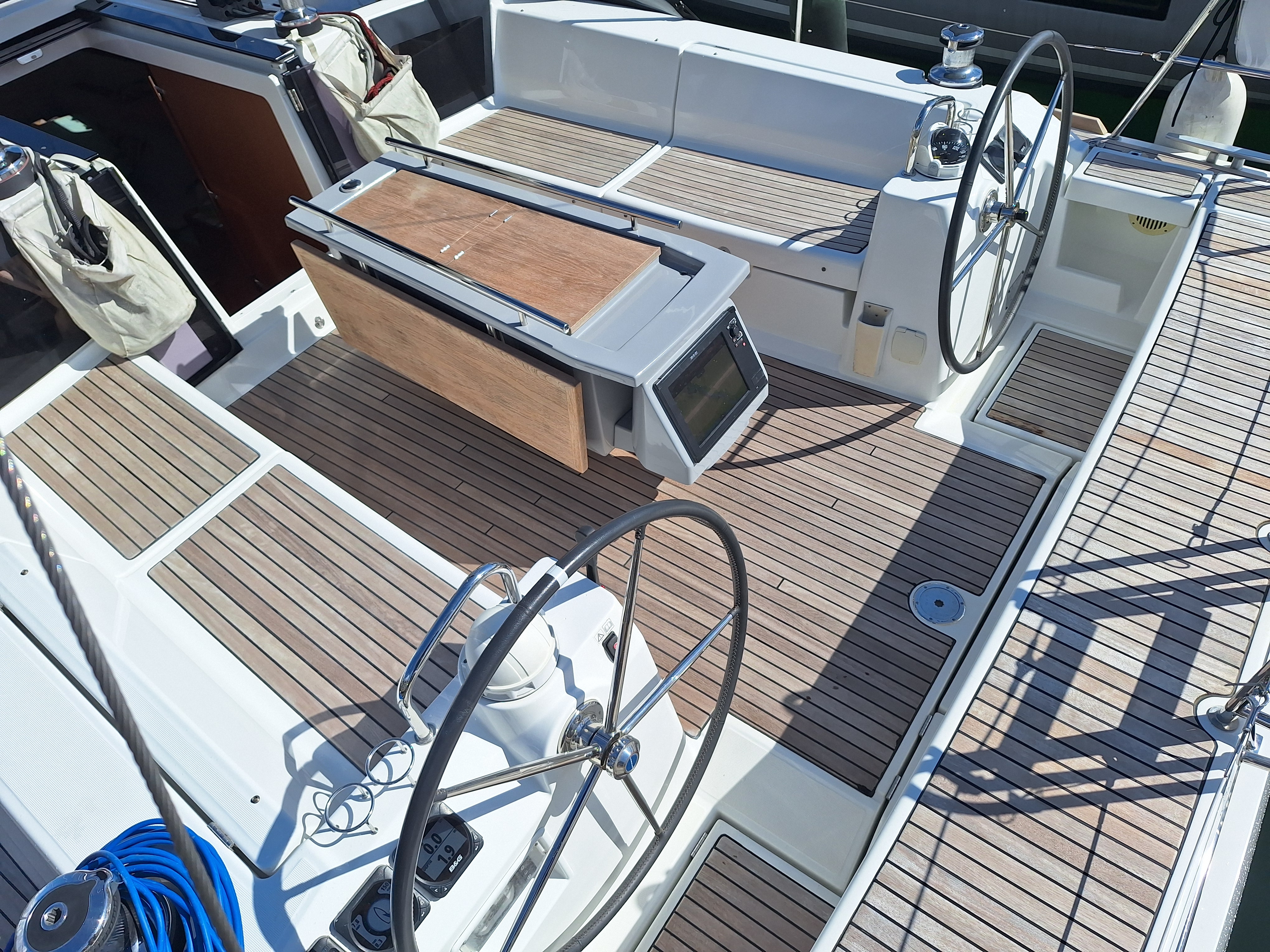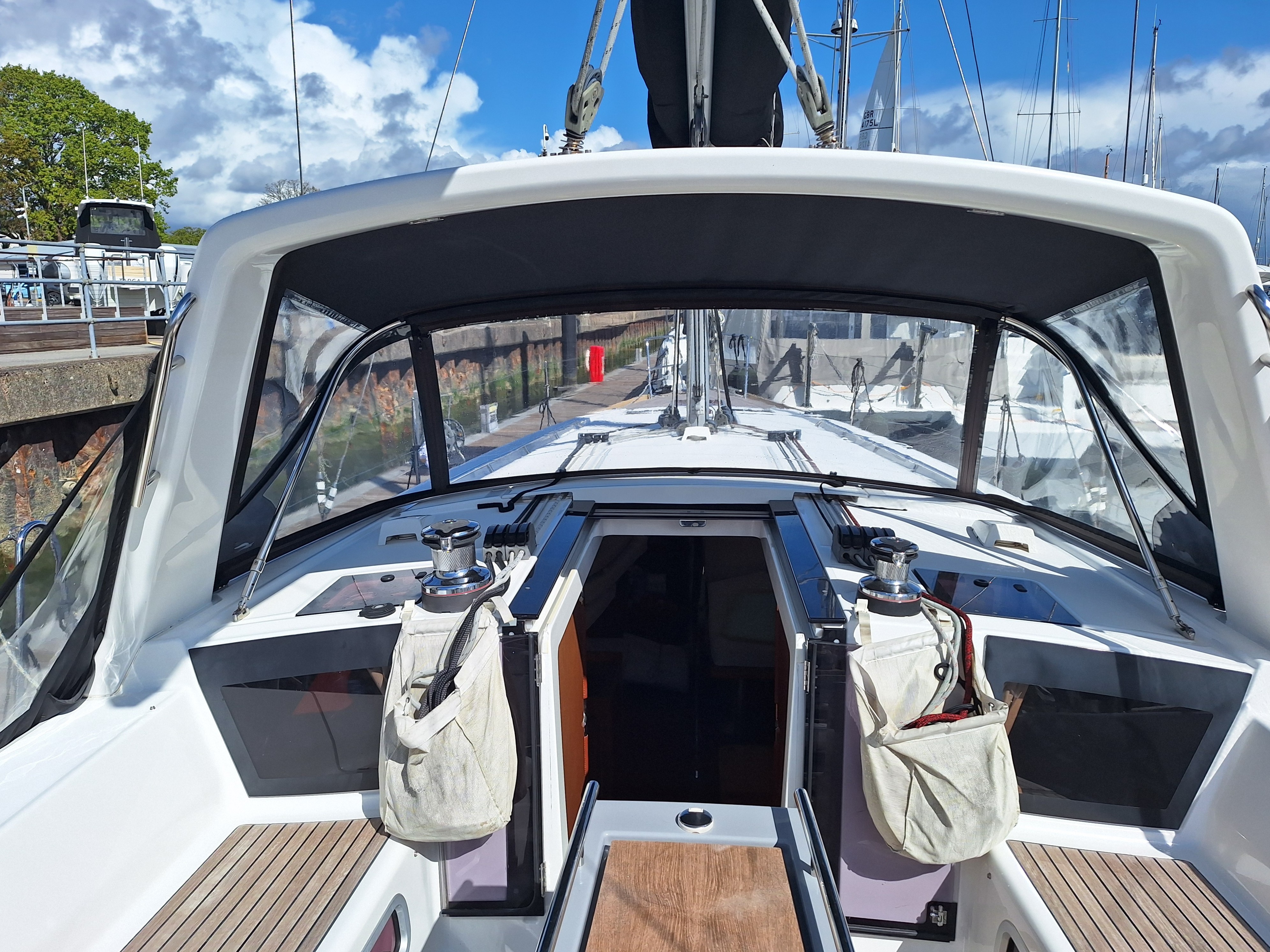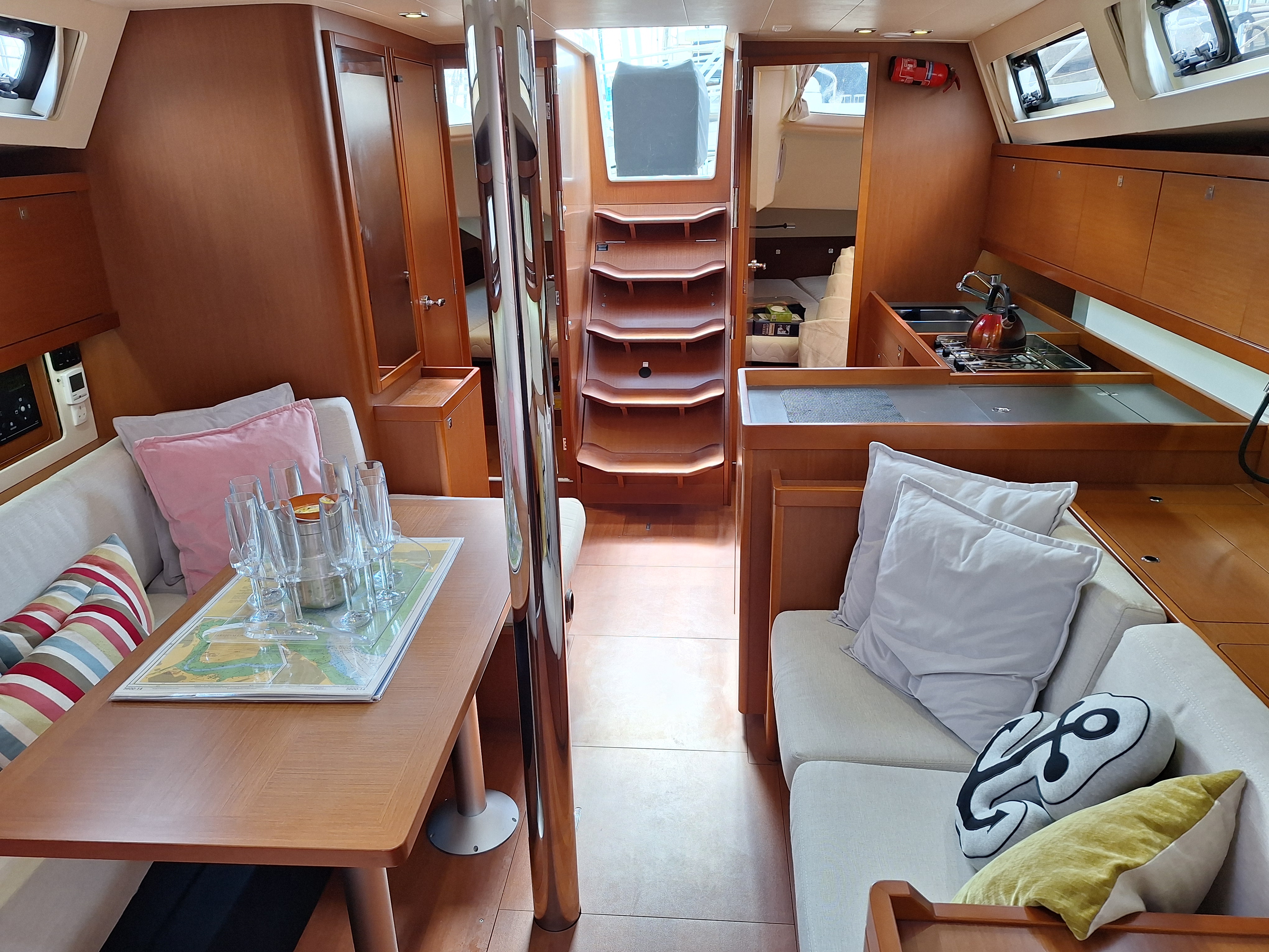 Couple this with a bowthruster, heating, electric opening transom, electric halyard winch and slab reefing mainsail and you have an excellent family cruiser which is very easy to handle.