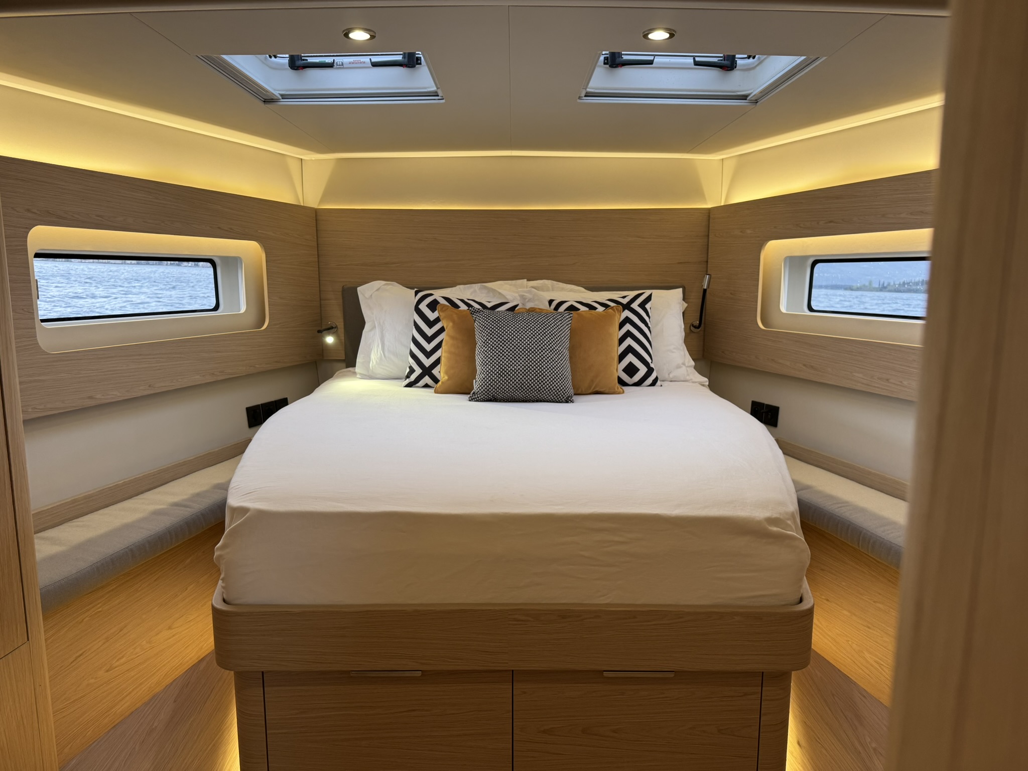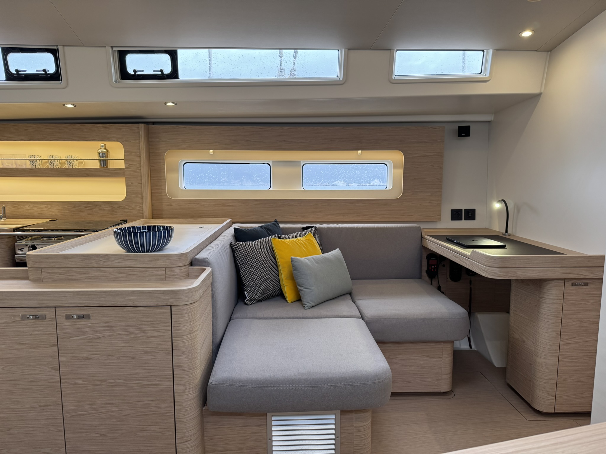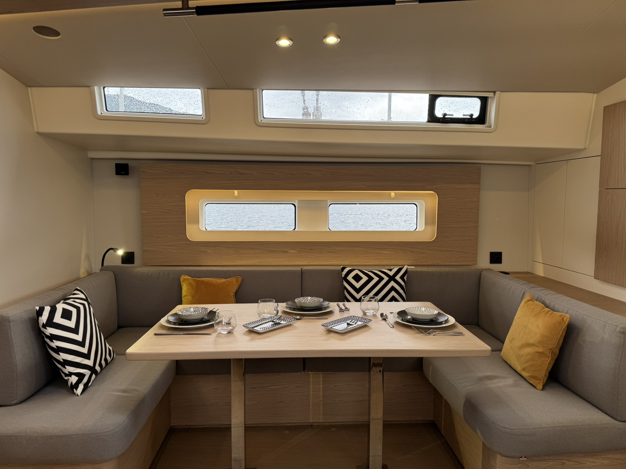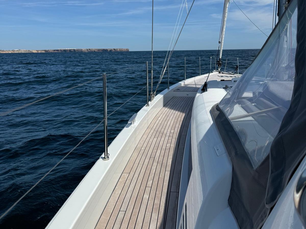 The hull is used from the high performing First Yacht 53, which makes sailing a pleasure in all weather and lively, even in light air. Her straight bow takes on little water forming a fine spray and she has twin rudders for perfect hull control making her a joy to helm.