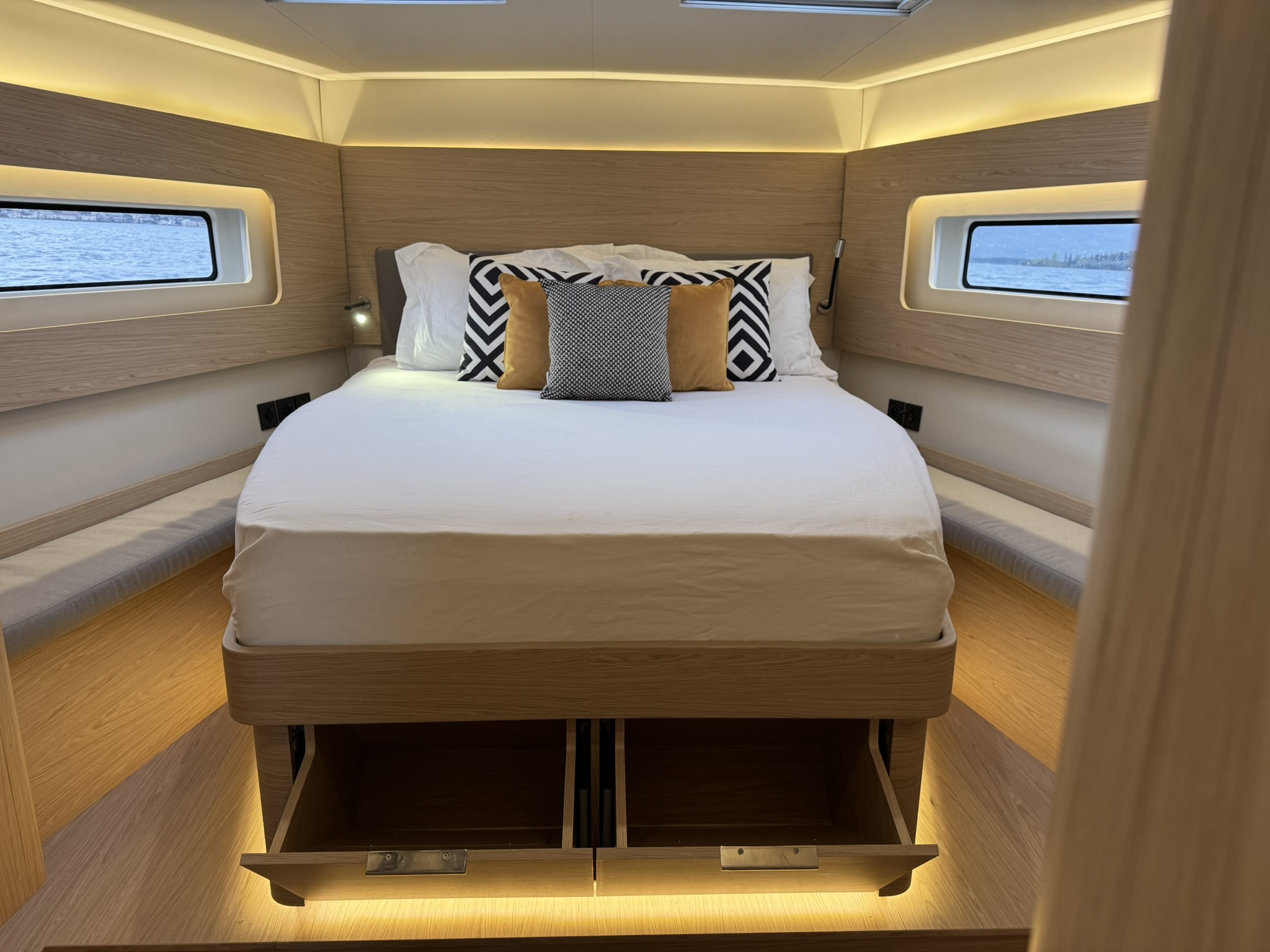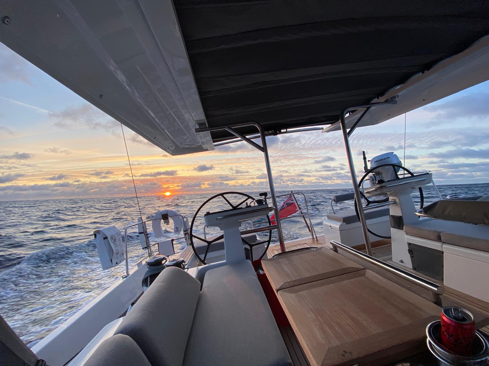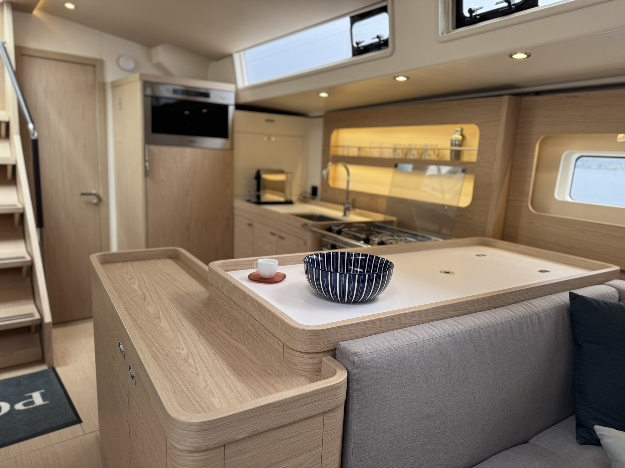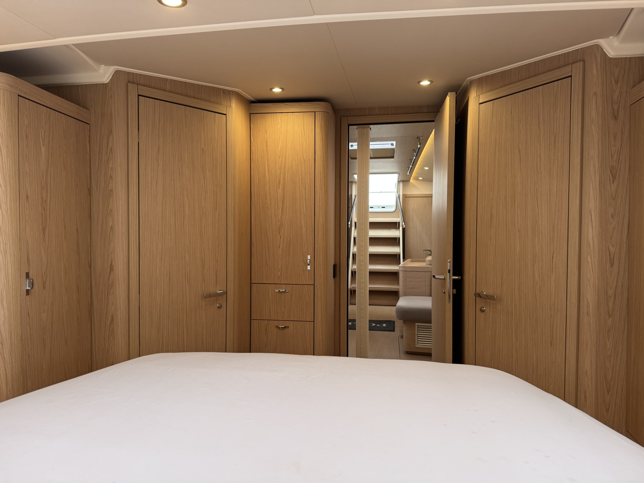 The hull is used from the high performing First Yacht 53, which makes sailing a pleasure in all weather and lively, even in light air. Her straight bow takes on little water forming a fine spray and she has twin rudders for perfect hull control making her a joy to helm.
