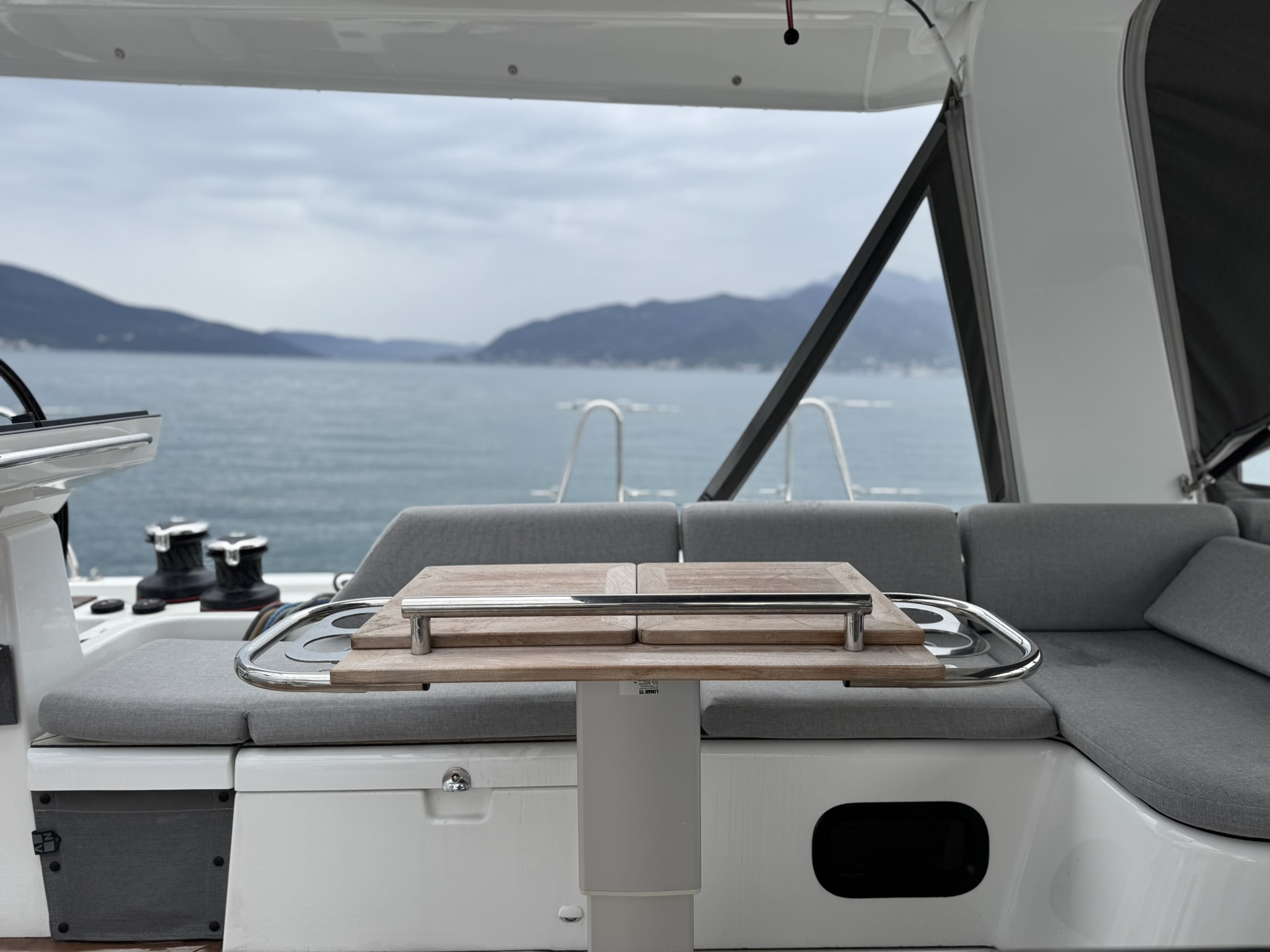 Semi rigid GRP bimini with retractable charcoal grey canvas