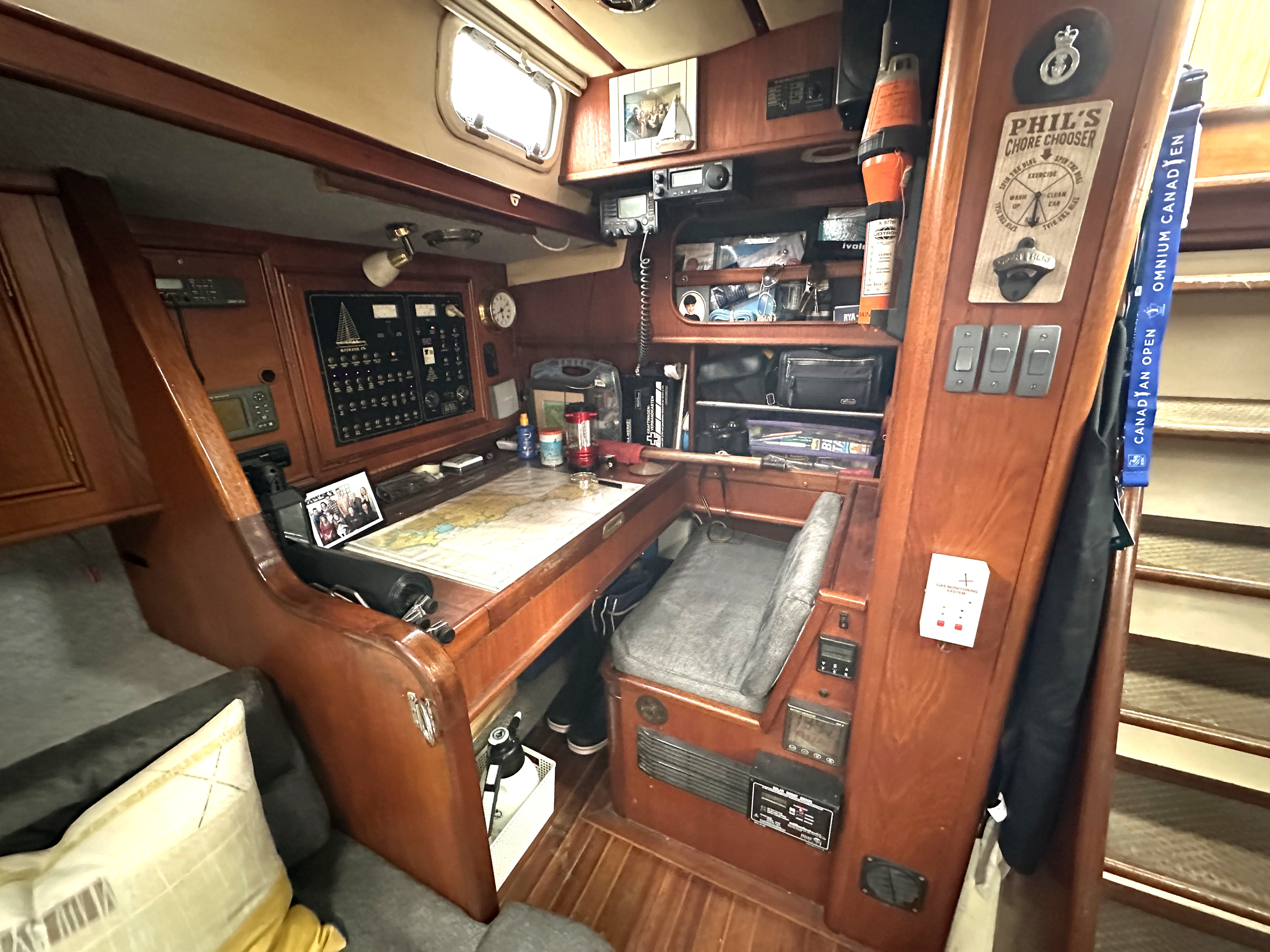 The Nav area is to stb'd with a large chart table, storage within and shelving around, access to the batteries is beneath the vinyl covered seat. Electrical panel and space for instruments etc, night light (red) portlight