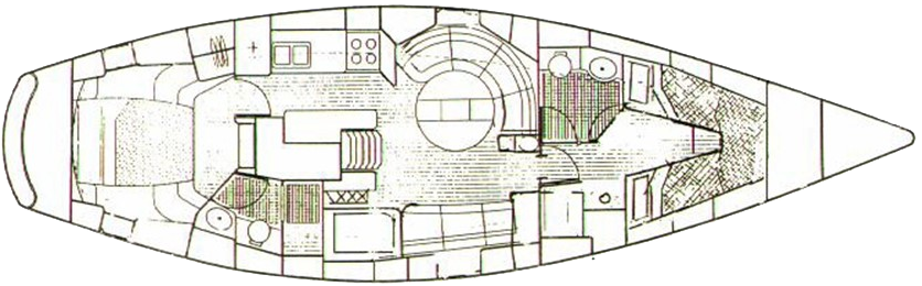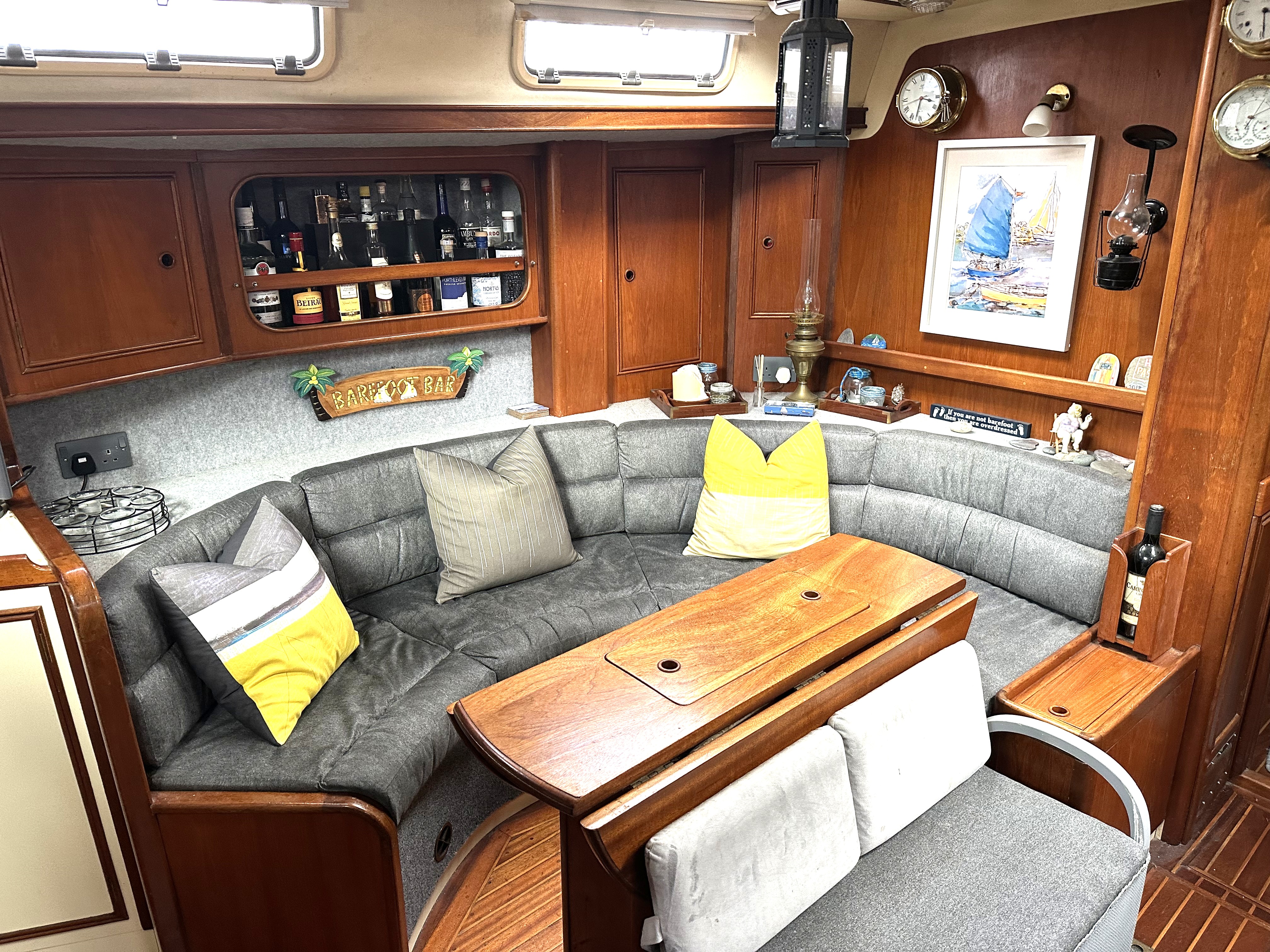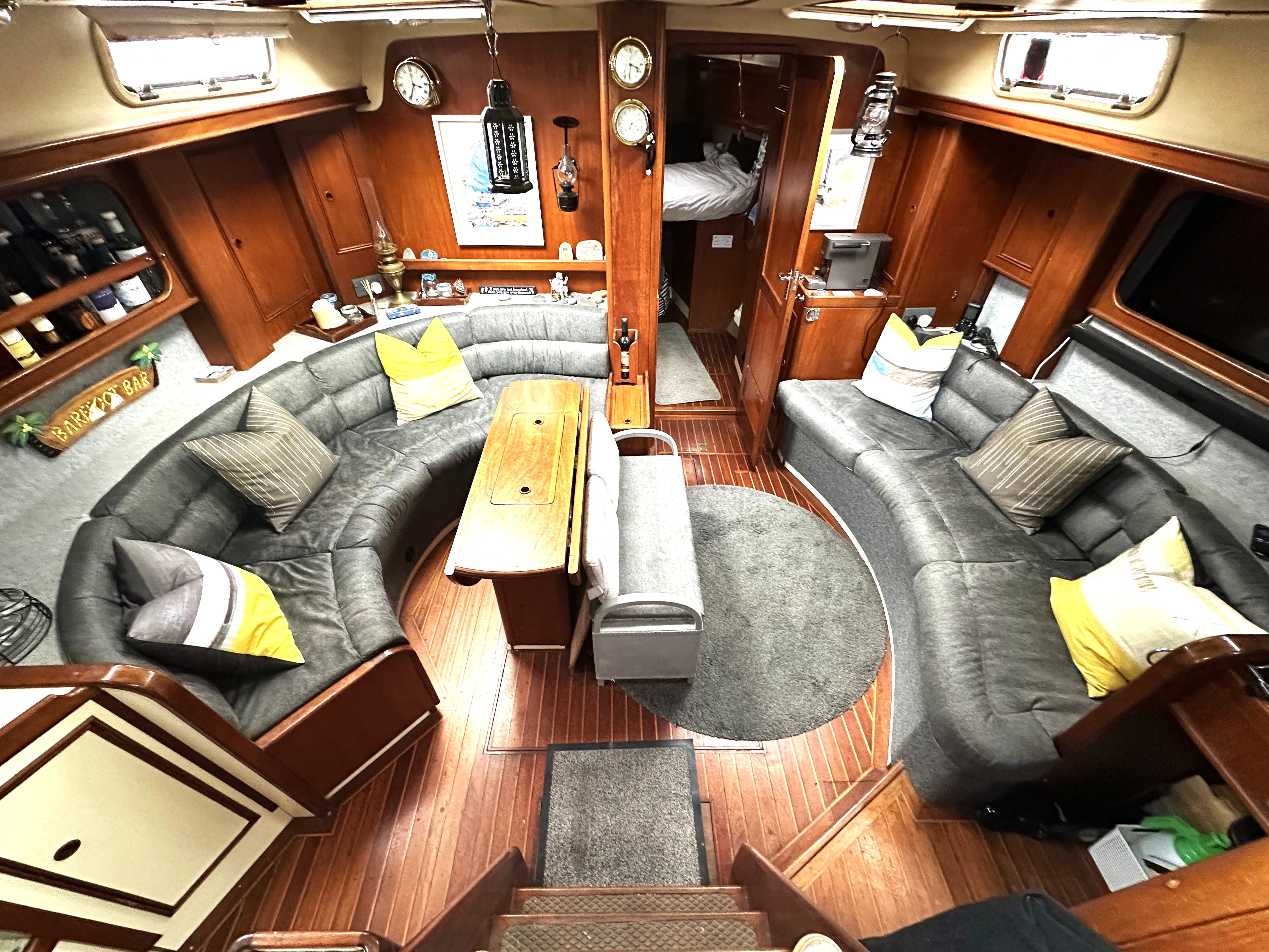 Large saloon with curved seating either side (conversion available to make port saloon seats into double or large single next to saloon table), lee cloths, storage everywhere, bookshelves behind, drop leaf table with central storage, 2 paraffin lamps, ships clock and barometer on bulkhead, custom lockers and shelving, 2 opening hatches and 6 portlights, TV with sound bar, 12V fan