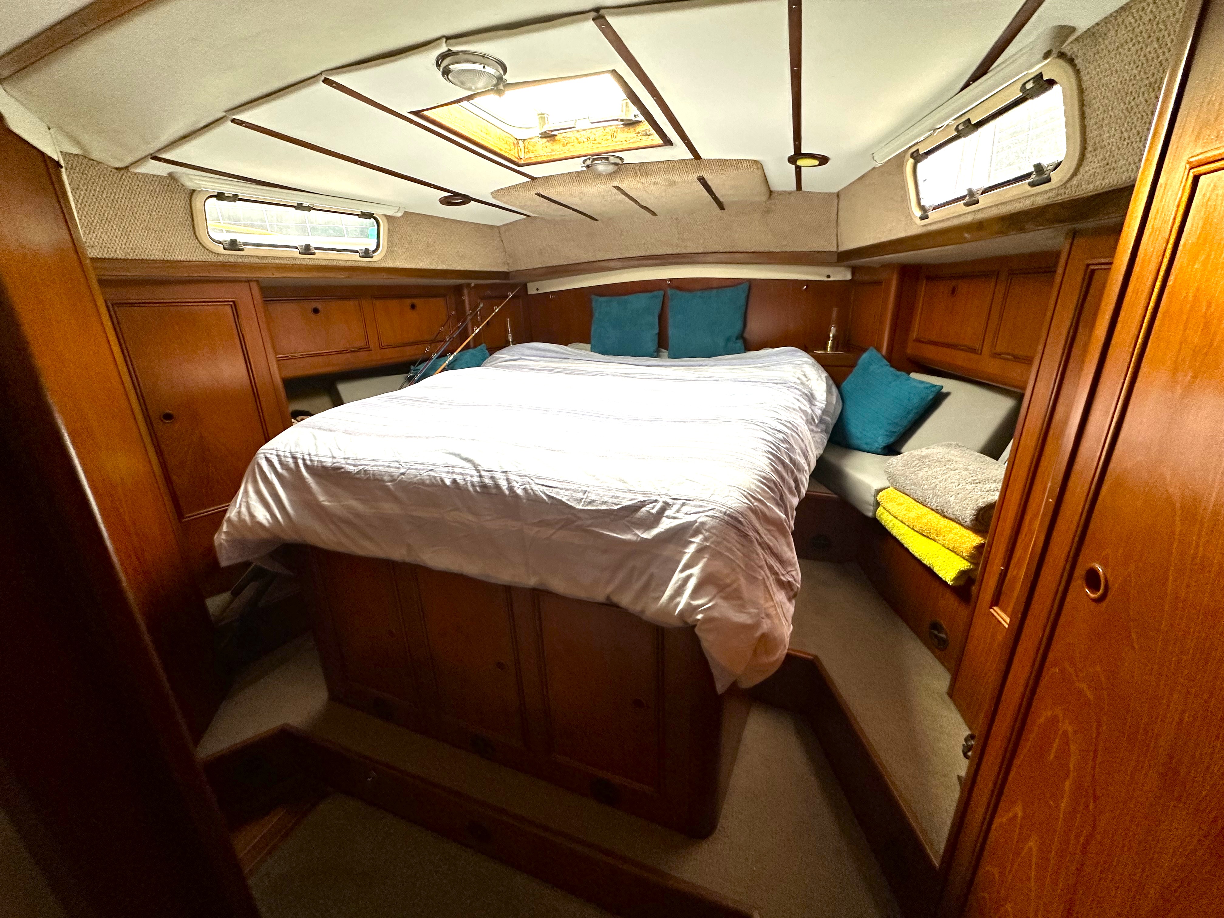 The Owners Suite aft with "island" double berth with storage under and a chart storage locker, under bed heating (240V) hanging locker and further storage, vanity unit with mirror, opening hatch and portlights, 12V and 240V lighting, 12V fan