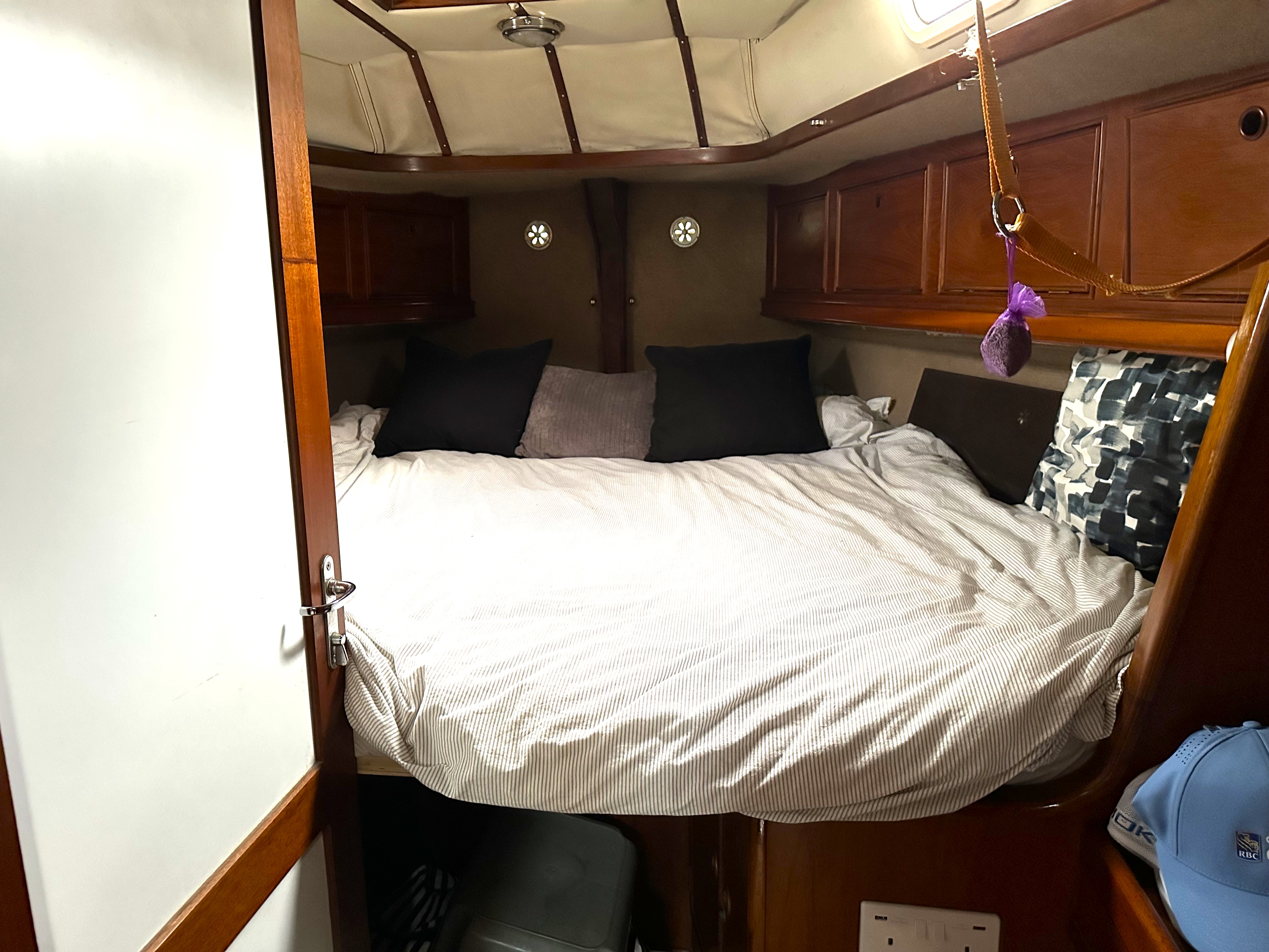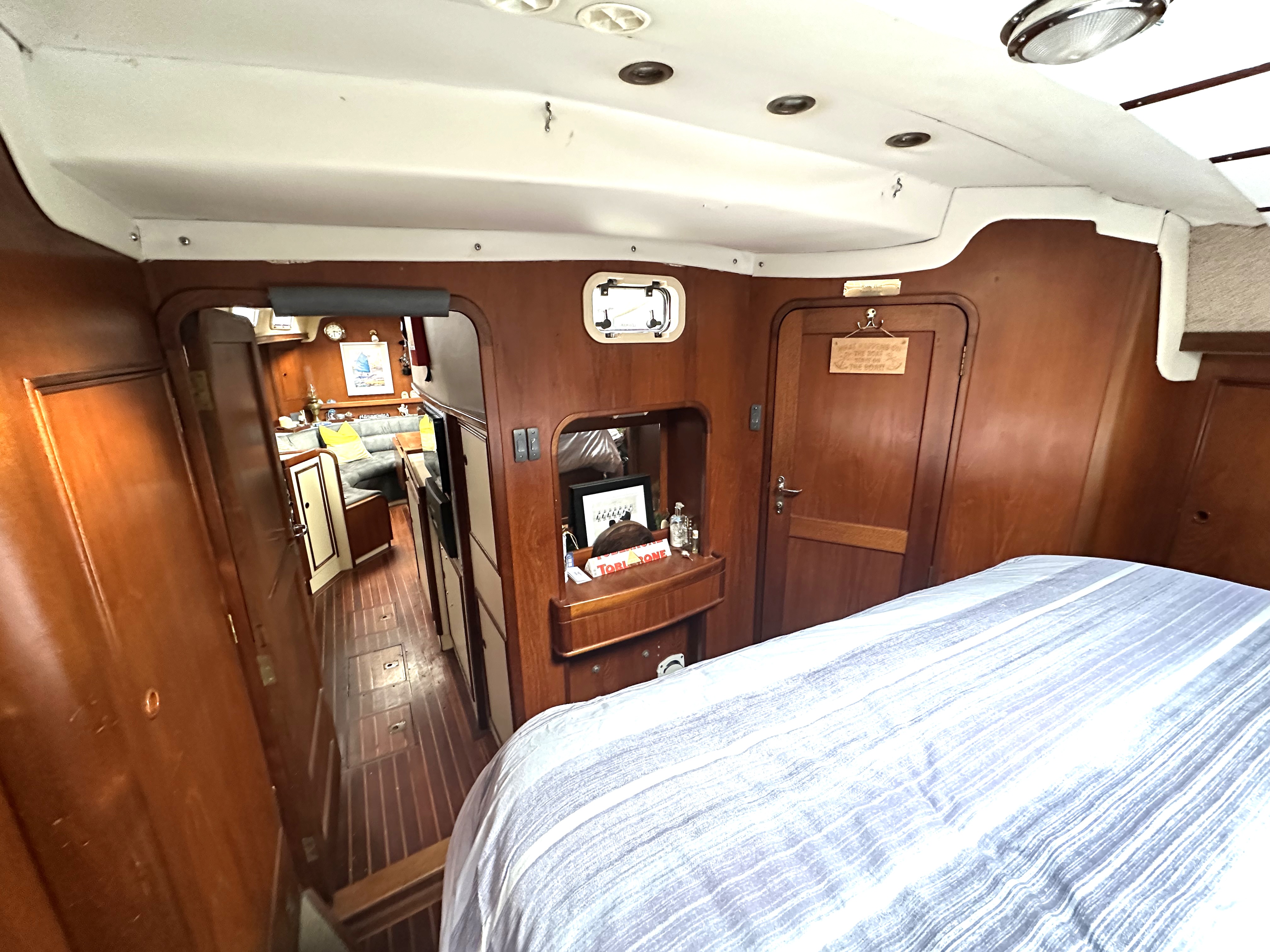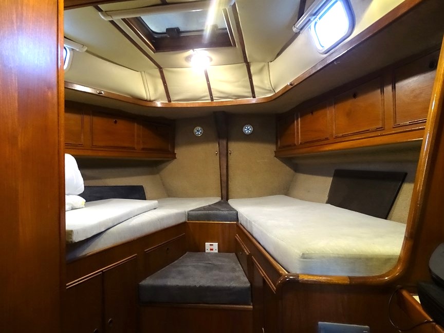 Fwd cabin (en suite) with double berth (can be 2 good size single berths), lee cloths, storage above and below berths in lockers, large hatch, 2 portlights, 2 reading lights and an overhead lights. Vanity unit to stb'd with more locker space, large hanging locker, Door to saloon.