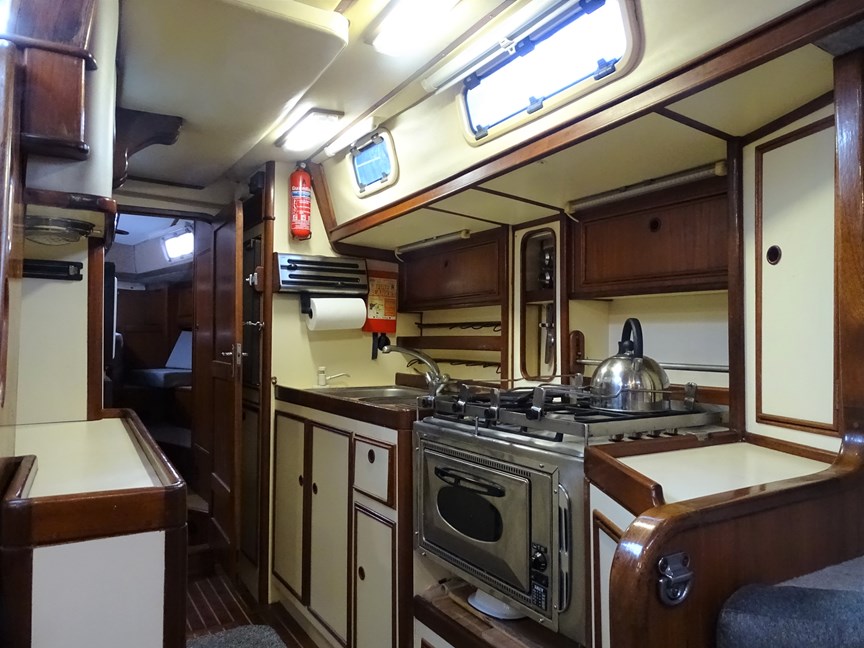 The galley is to port and is well designed for use at sea, whilst also providing lots of storage again incorporating a multitude of custom storage and shelving, full sized gimballed 4 burner hob with pan clamps, SS Smev oven and grill, SS bowl and a half sink with drainer, H/C water and a manual faucet, LED lighting, Isotherm fridge/freezer (new 2021), Panasonic Chef microwave (new 2021), further worktop and storage opposite under steps
