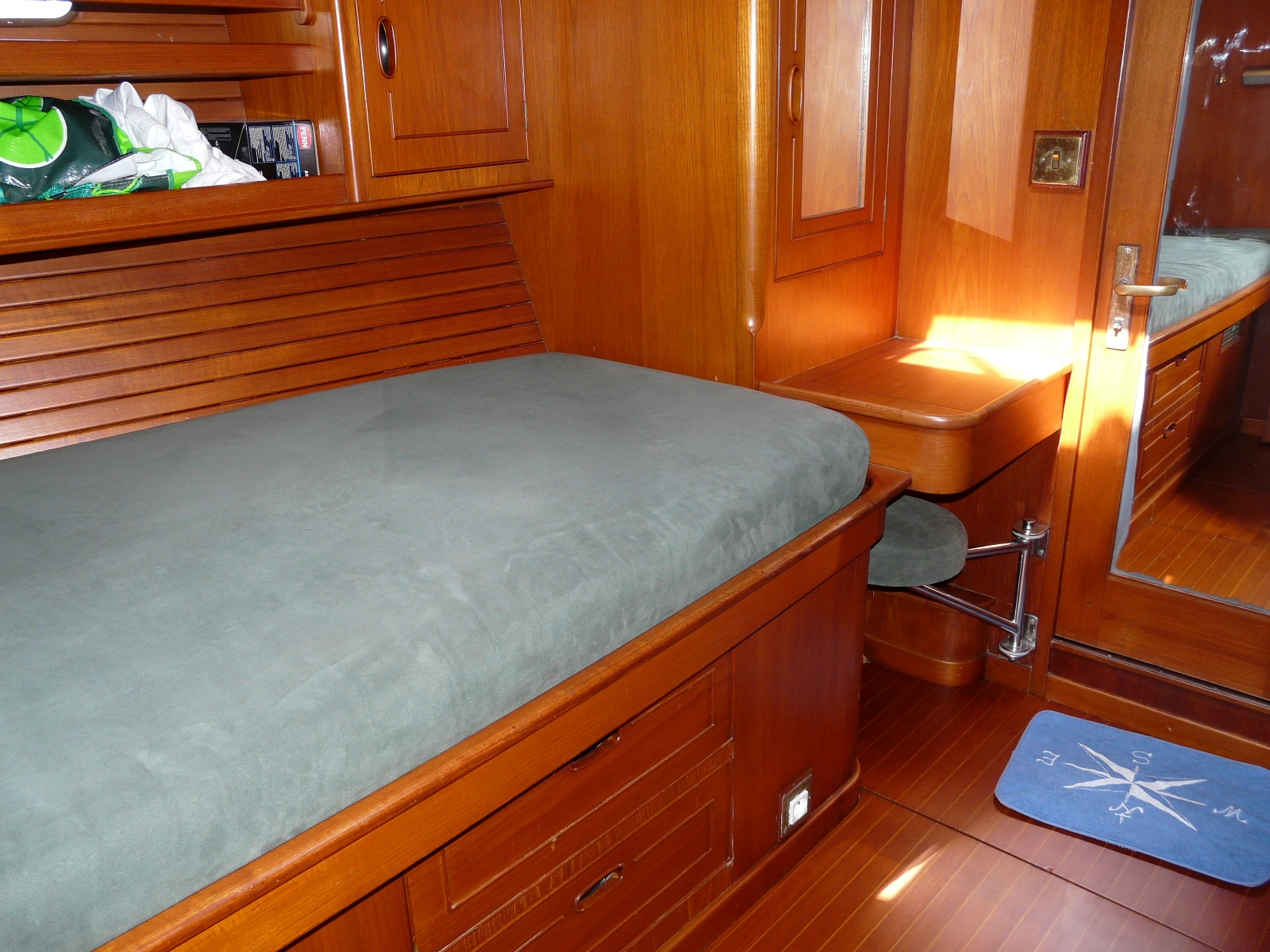 The port guest cabin forward has a double berth and its own ensuite head compartment. The guest cabin to starboard (presently used as crew cabin) has upper and lower bunks and is sharing a head compartment with the forward guest cabin with V shaped berth, which is currently used for storage.