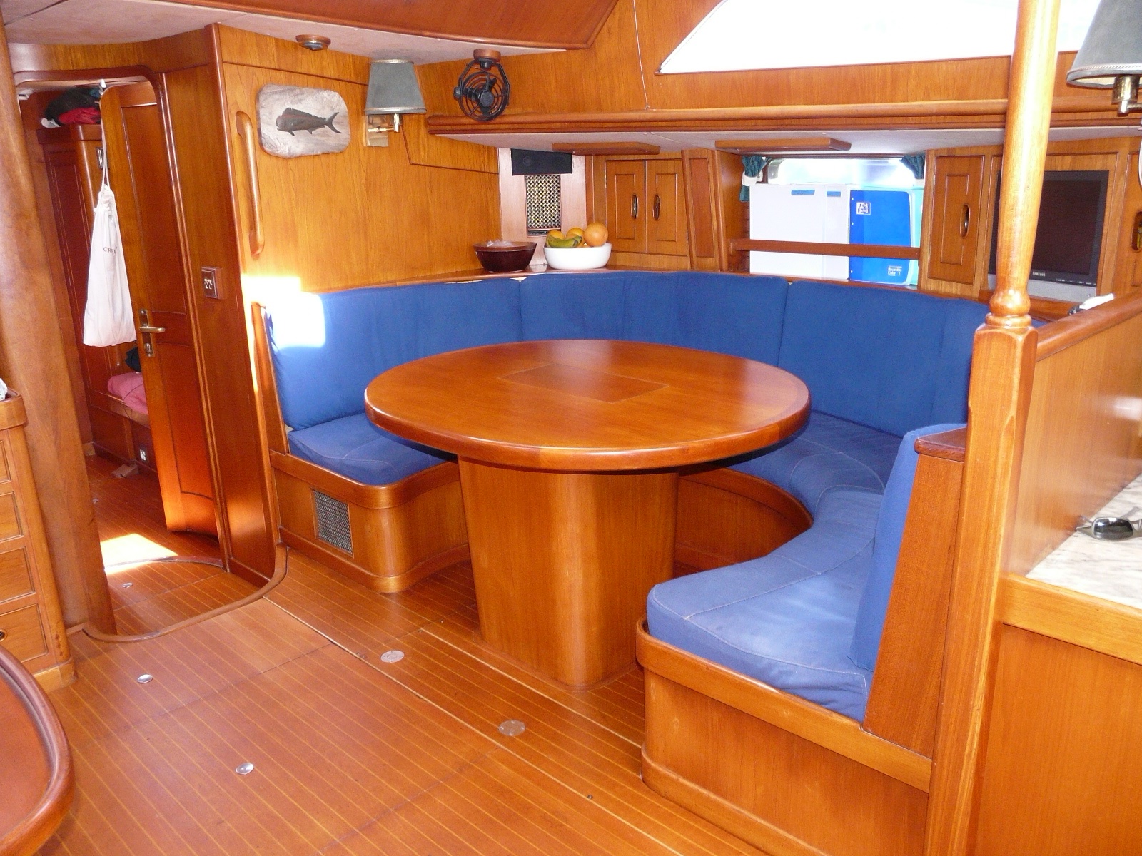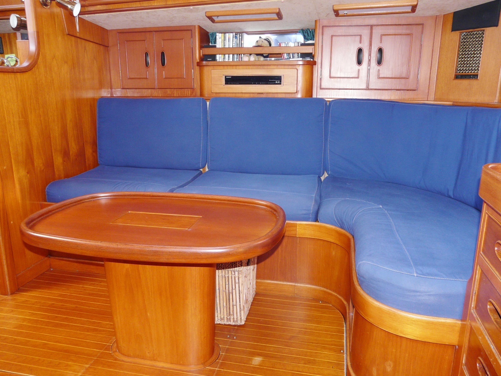 The spacious saloon has a dining table to starboard and a second seating area to port, aft of which is the navigation station.