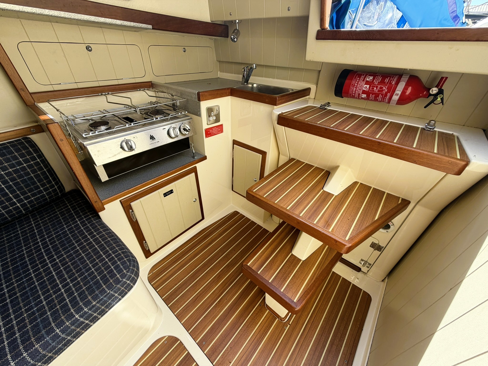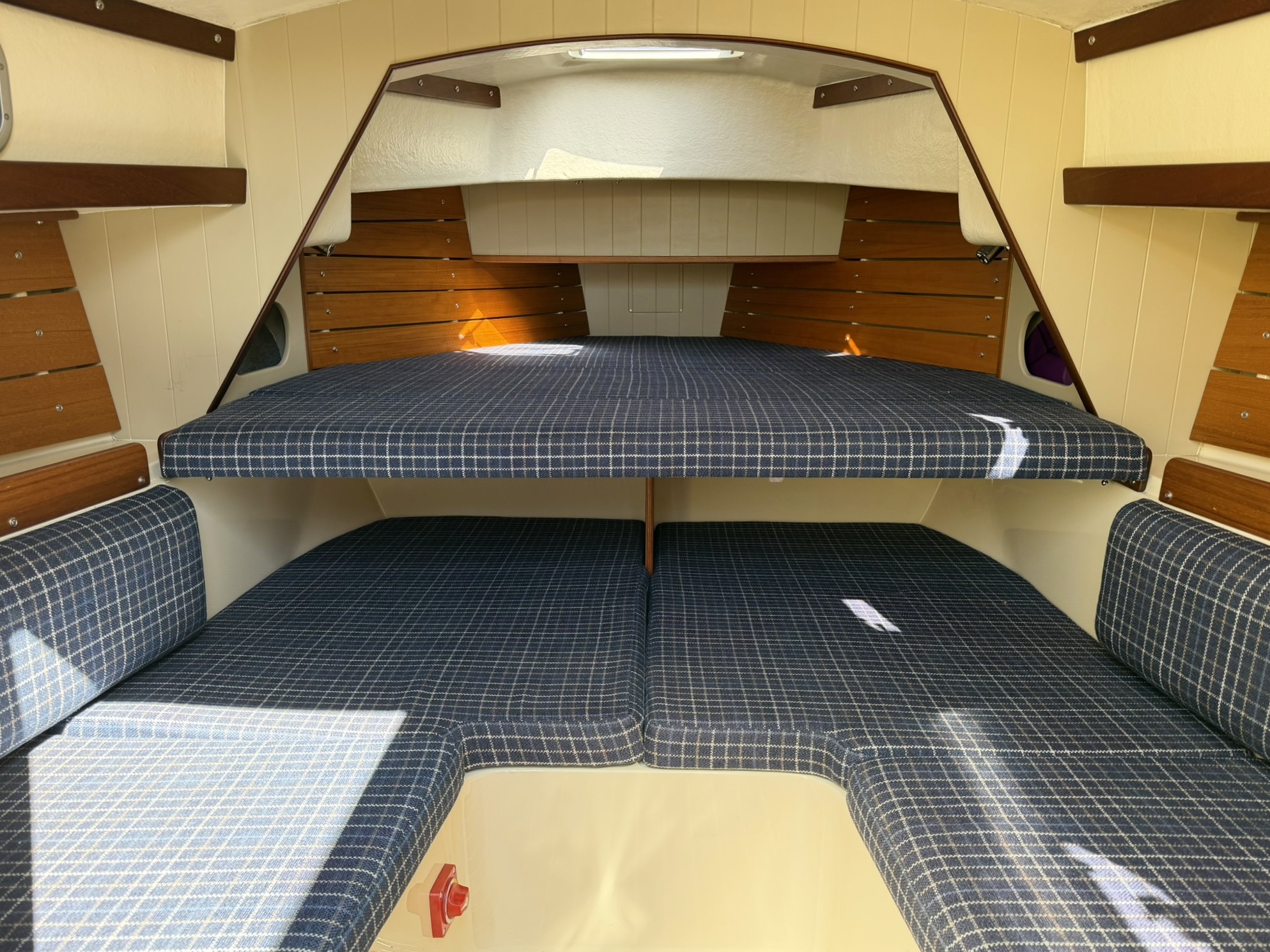 Tongue & grooved cream bulkheads and teak capping's.