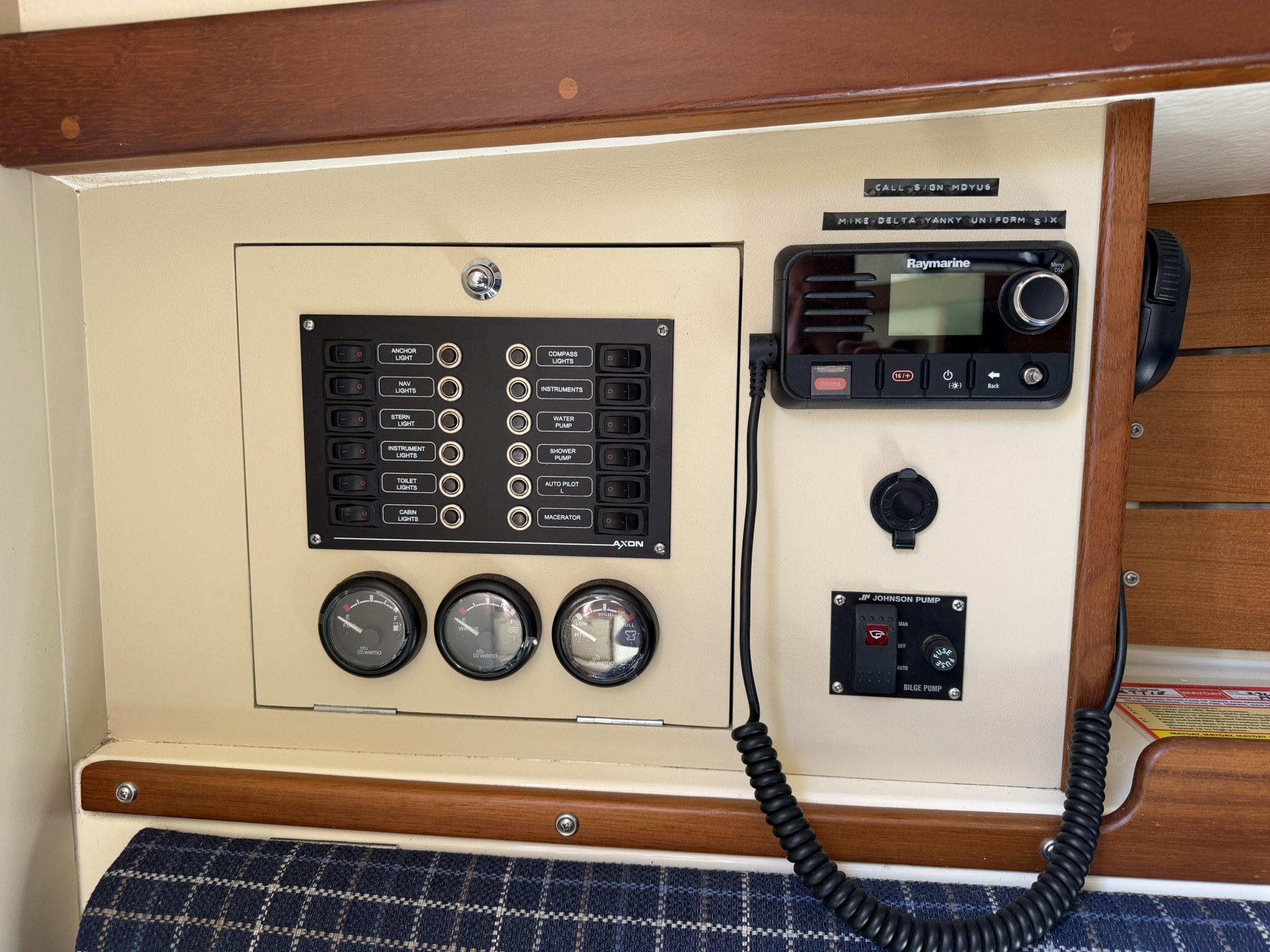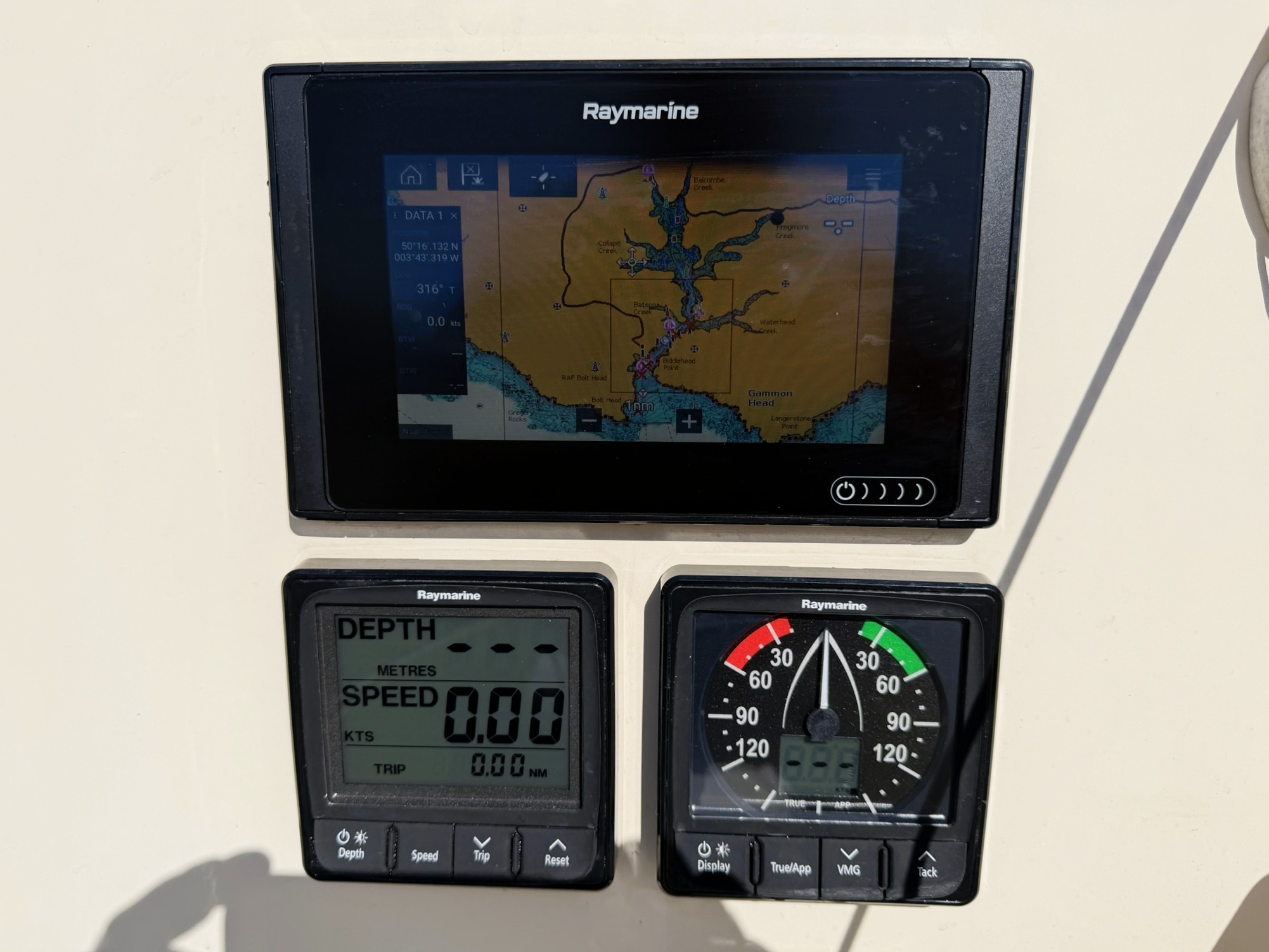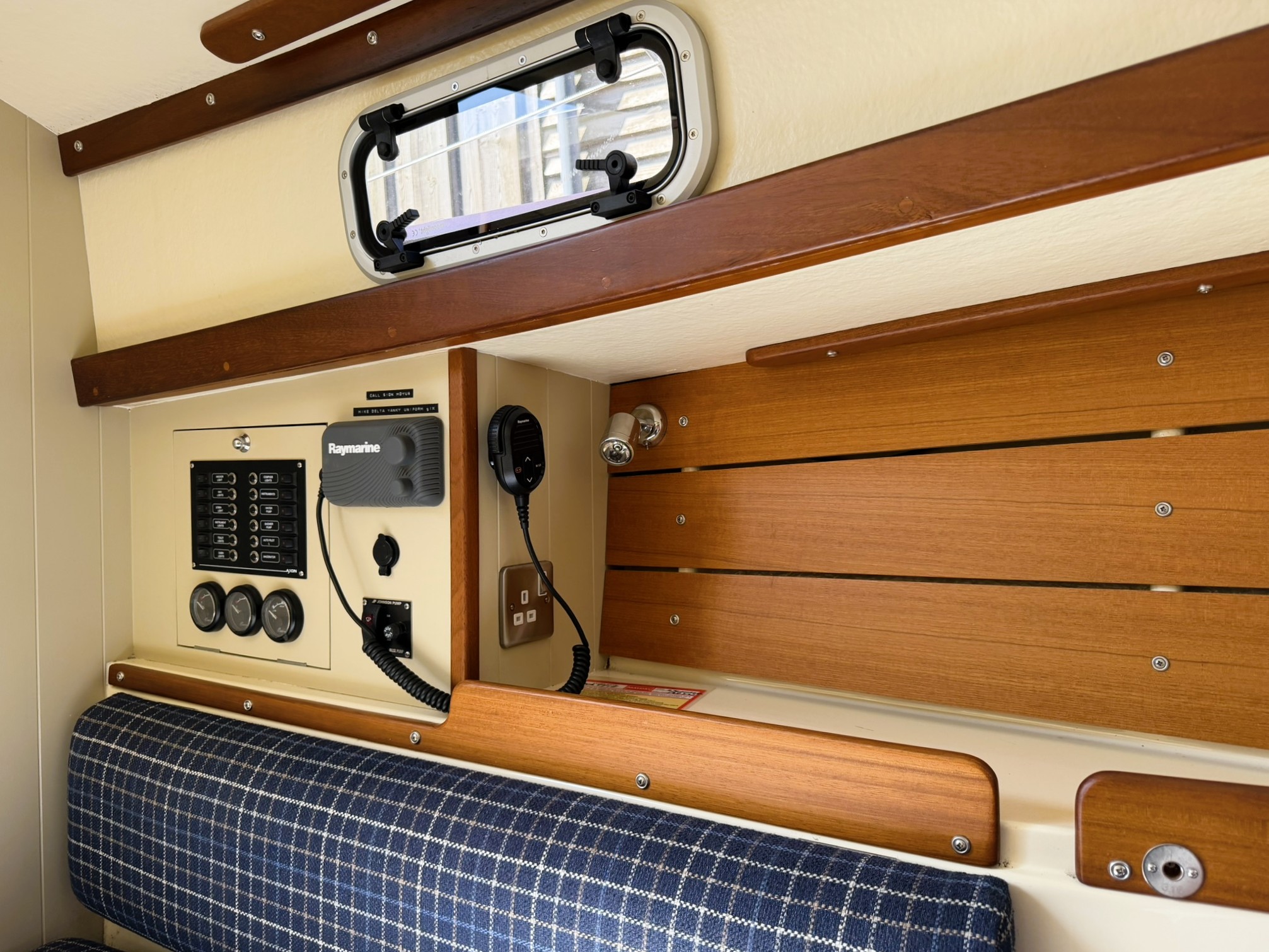 Navigation instruments on starboard bulkhead.
