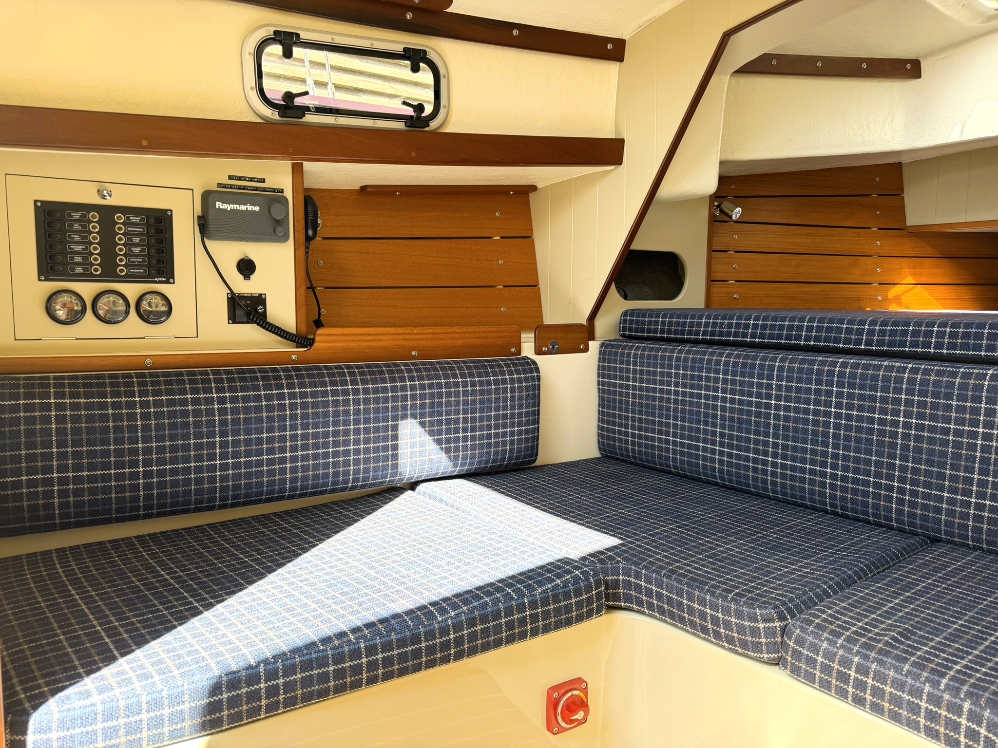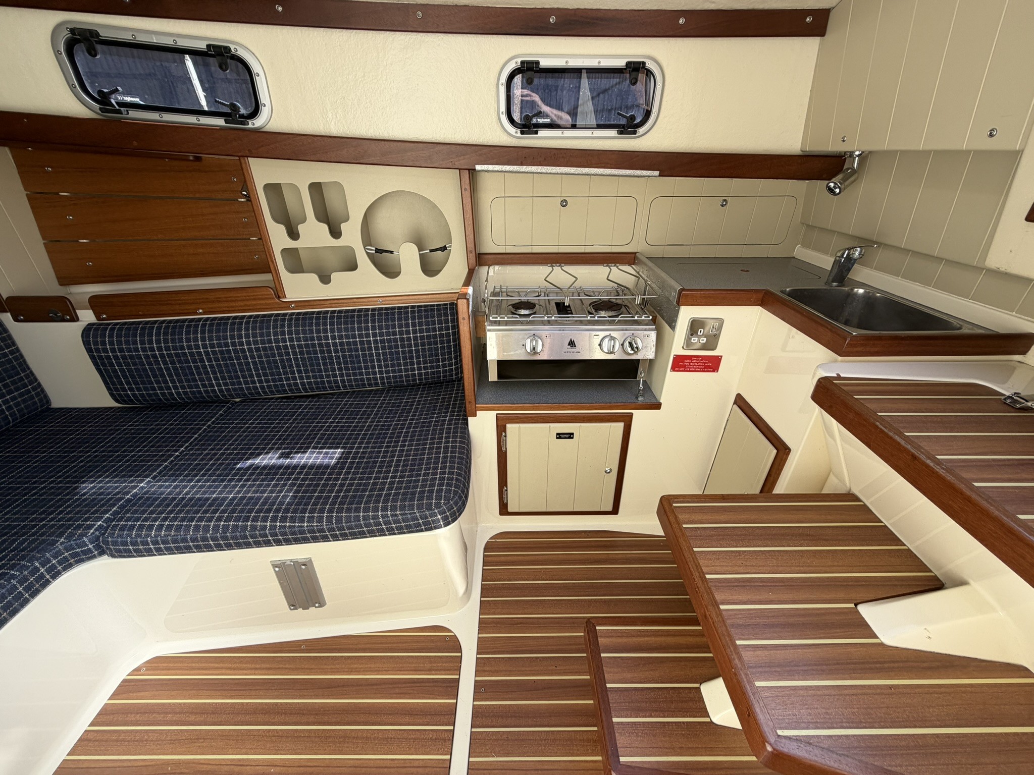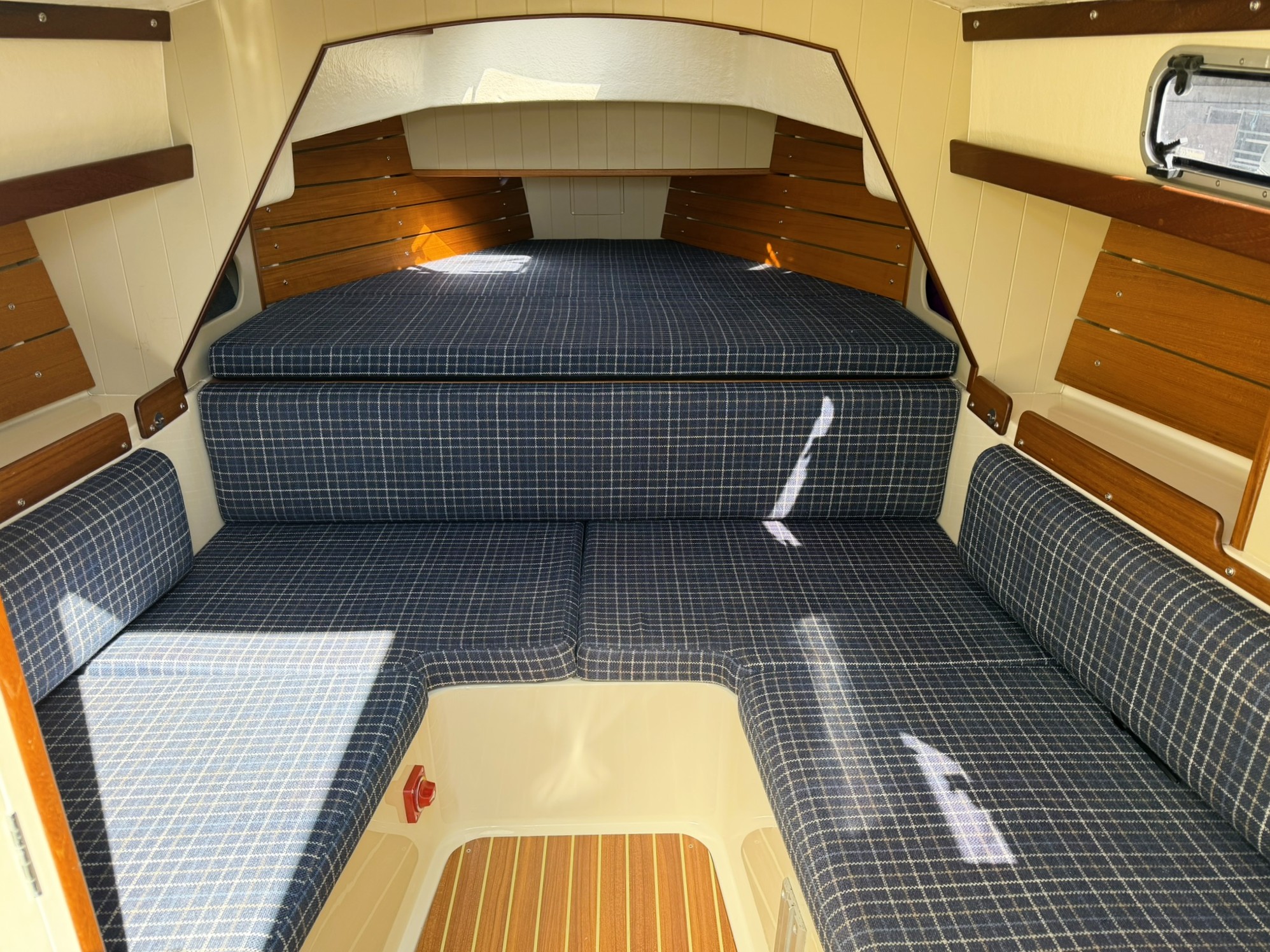U-shape seating with storage behind and under (two single berths when forward berth conversion in place).