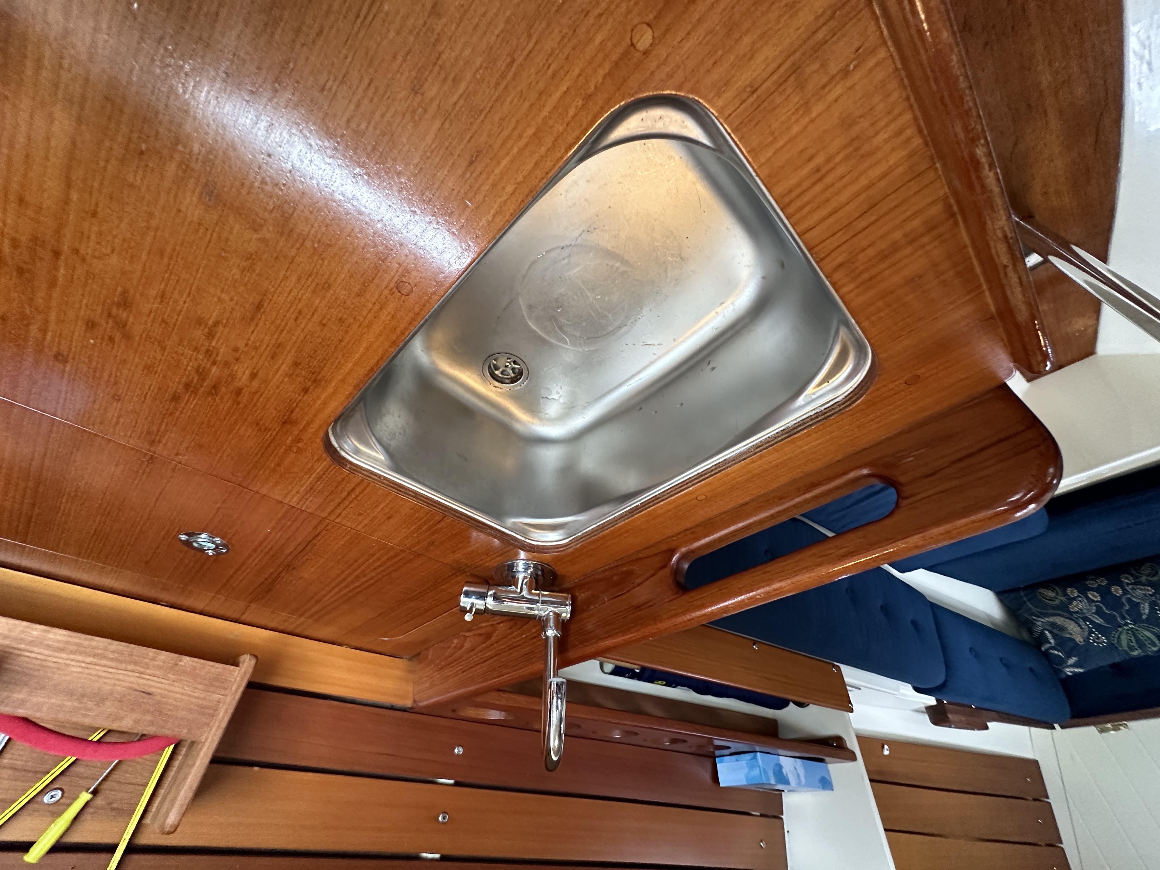 Galley complete with Tilley Talisman double burner with grill, electric water pump and stainless steel sink with navigation table cover