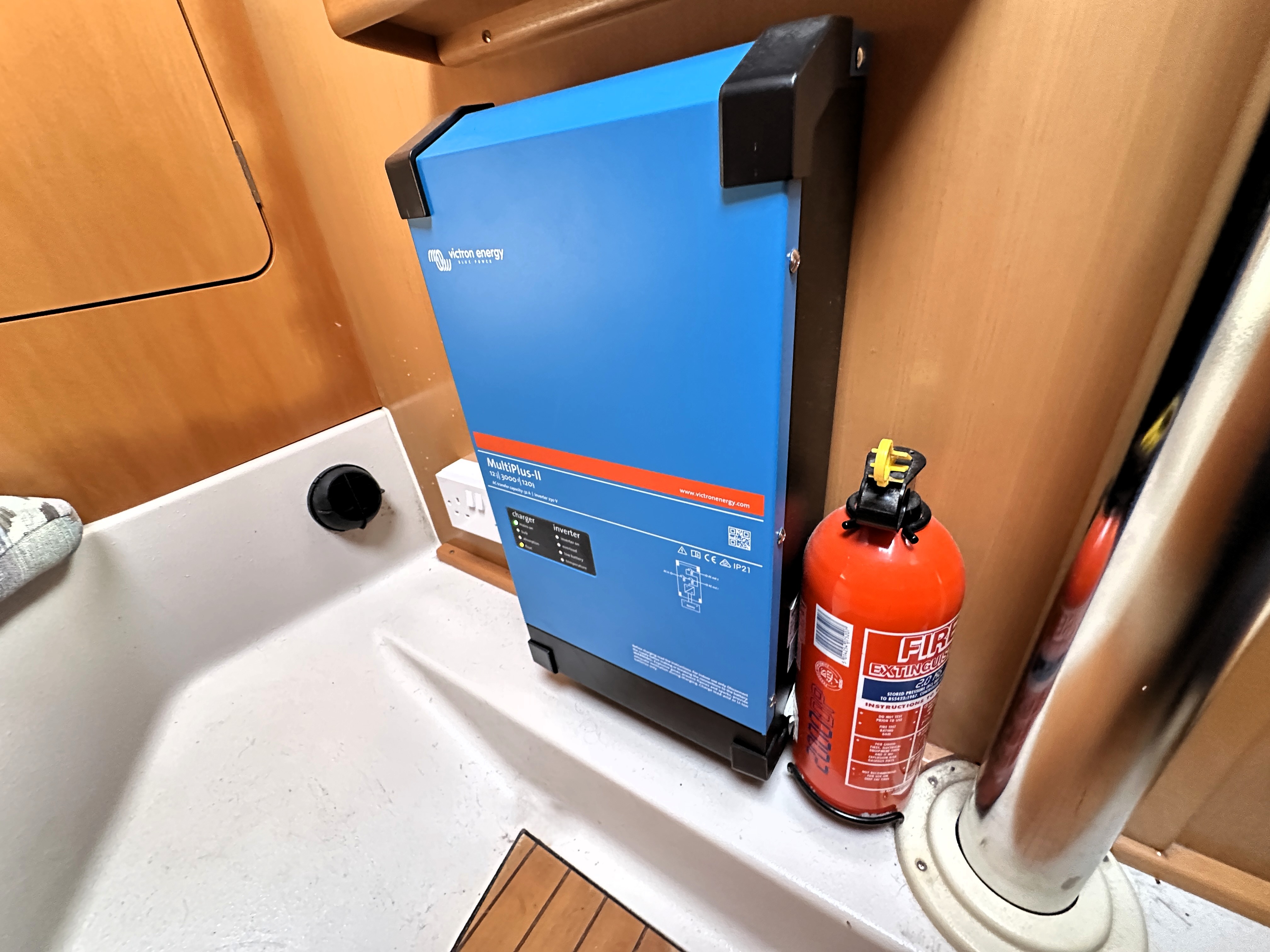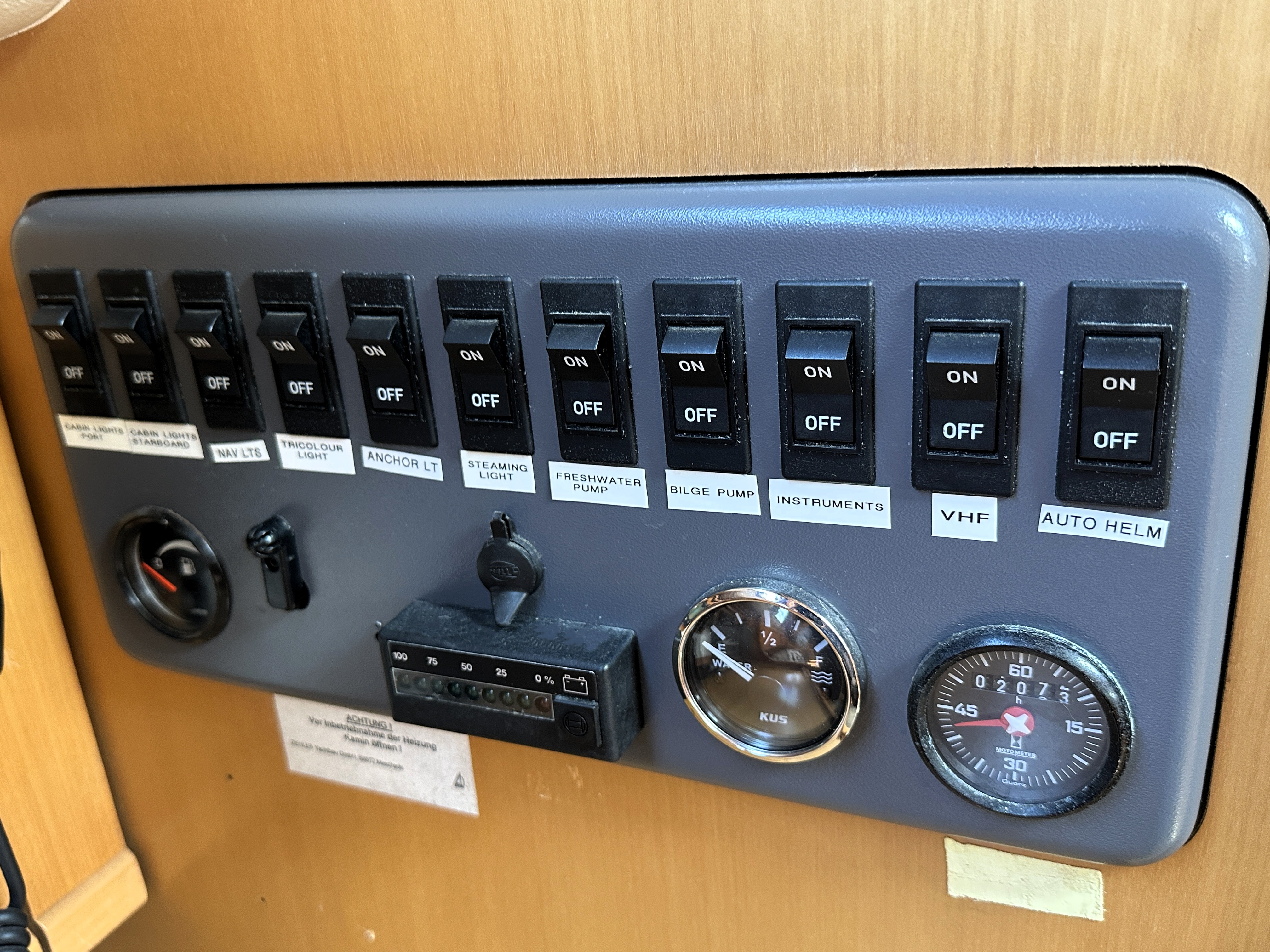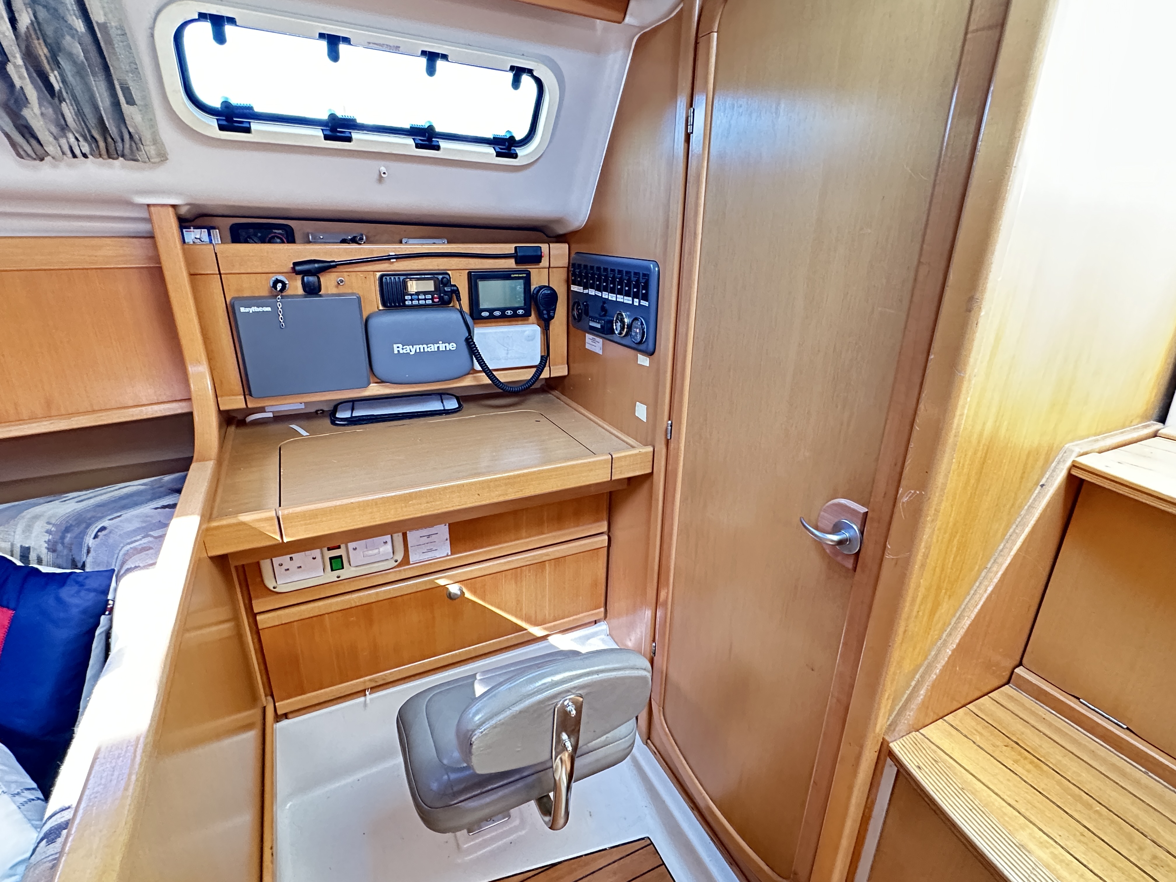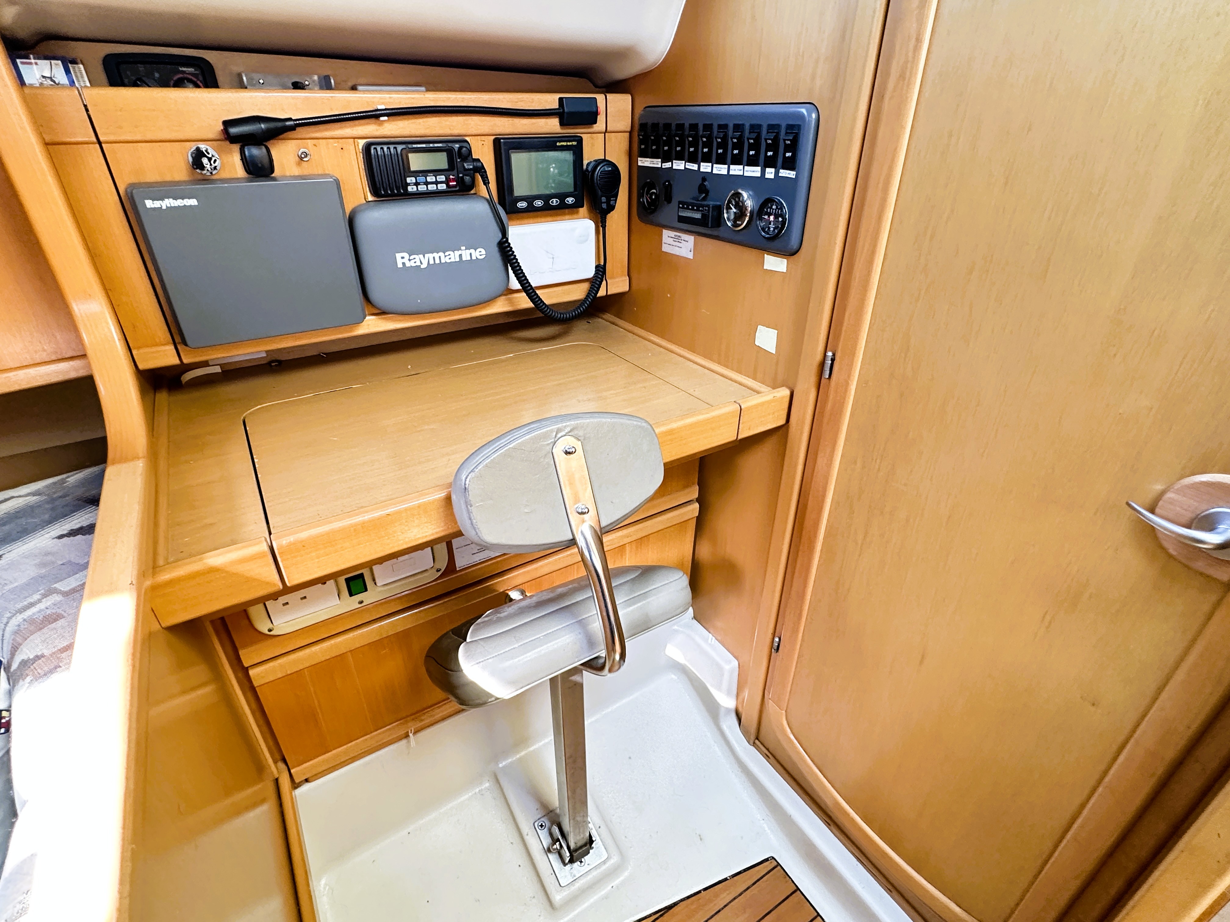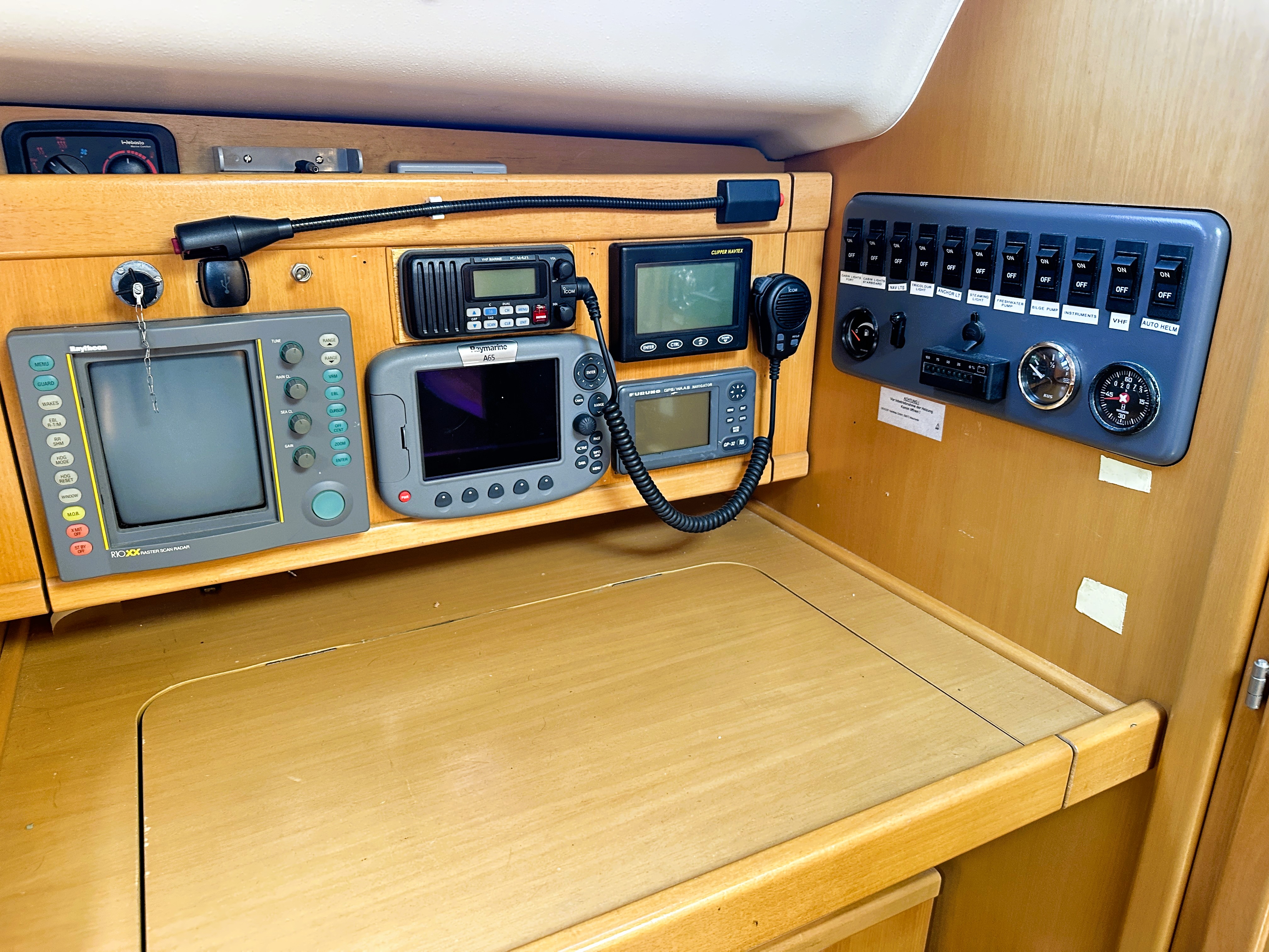 Side facing chart table to starboard with navtex, radar and vhf. Electrical distribution panel.