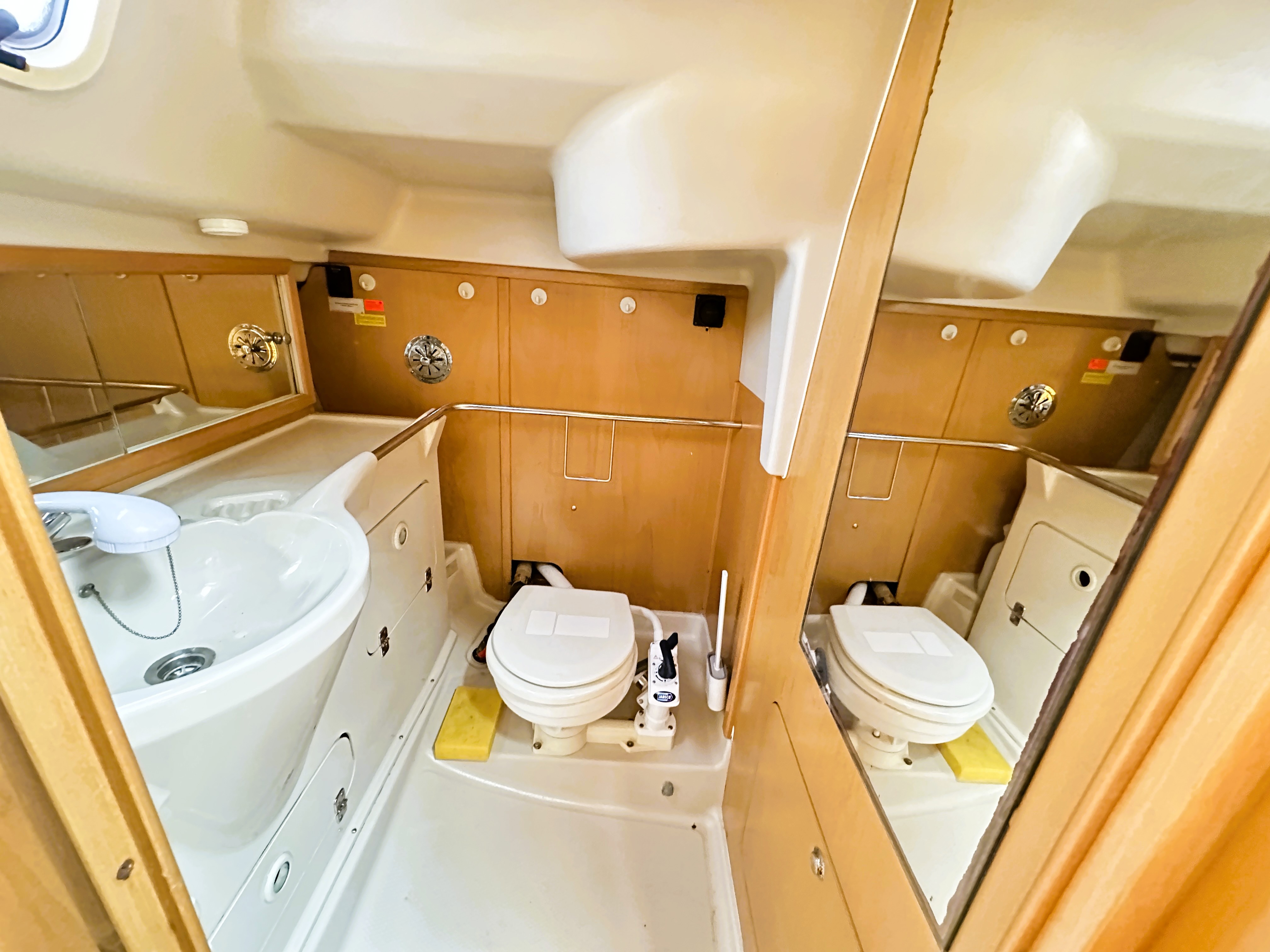 Heads compartment to starboard. JABSCO Marine W.C., hand basin and shower with hot and cold pressurised water.