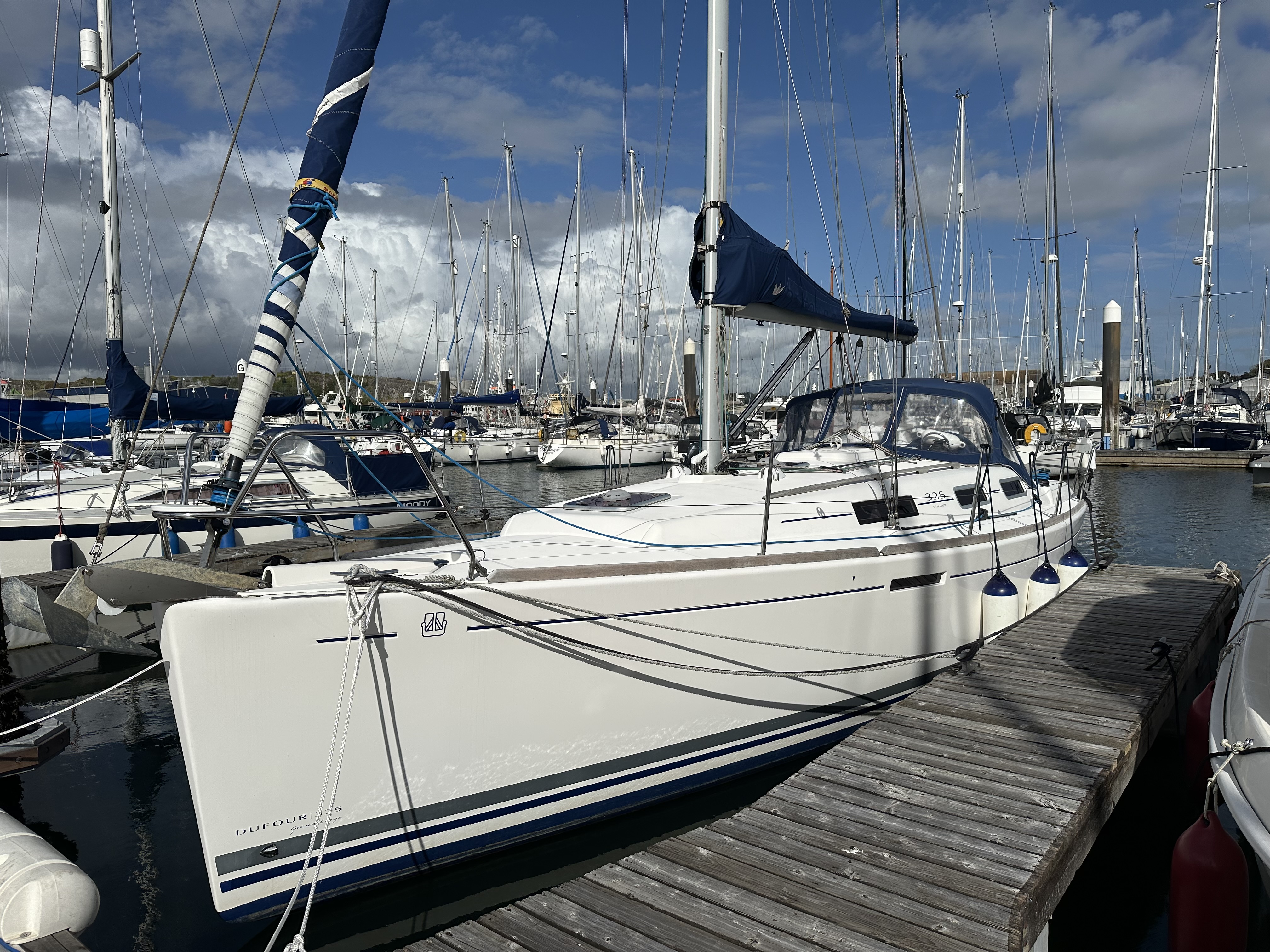 DUFOUR 325 GRAND LARGE built in 2007, launched 2009. Recently re-rigged and saildrive seal replaced. 2 cabin layout with Volvo Penta 19HP diesel inboard engine and 2 bladed folding prop. White GRP hull. Navman plotter, Furuno radar, autopilot & wind. Main with lazy jacks, furling genoa and 2023 Code Zero. A lovely well cared for example.