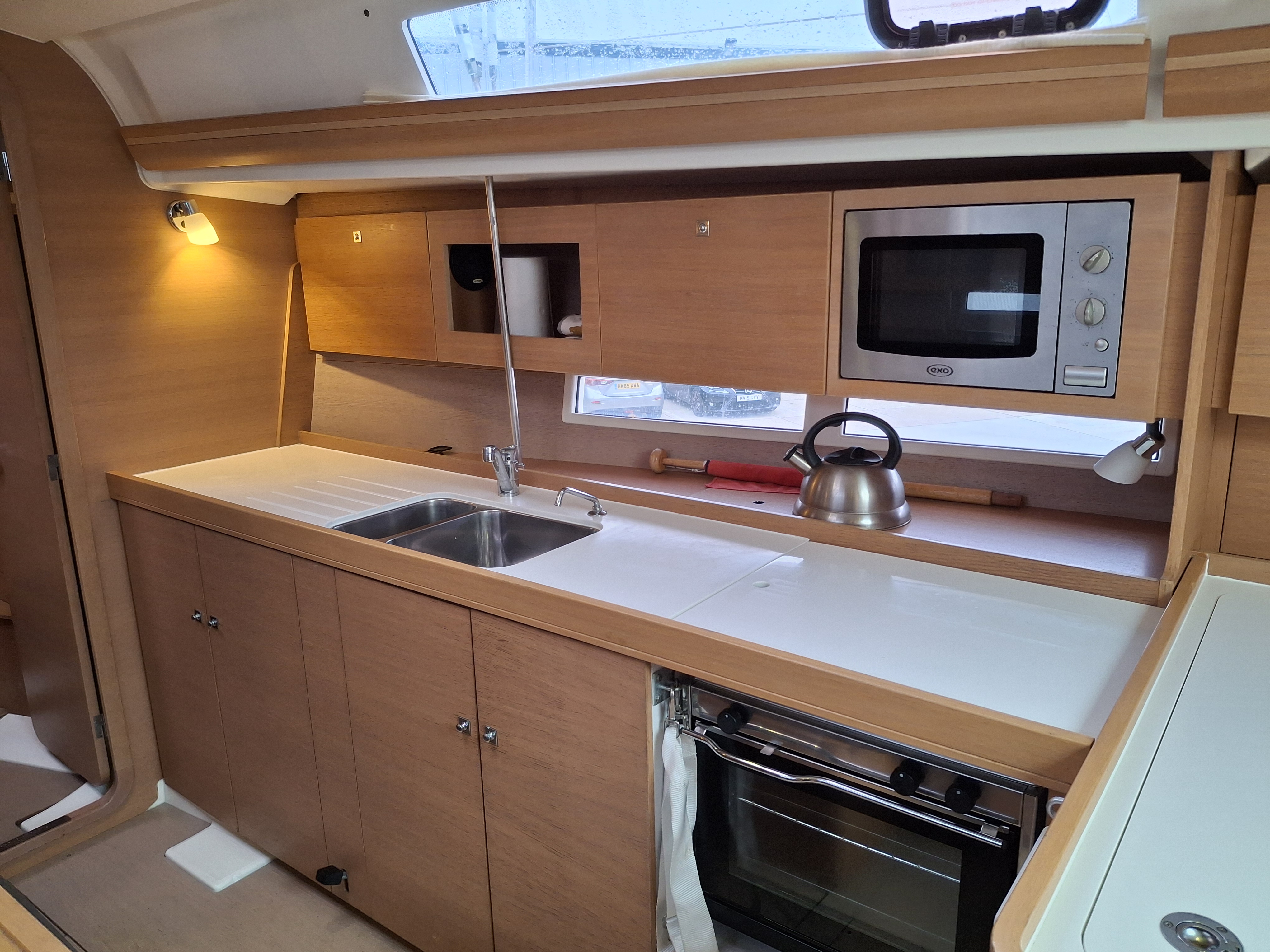 Galley to starboard with 2-burner gas hob with oven, microwave, large top opening fridge and stainless steel sink with mixer tap