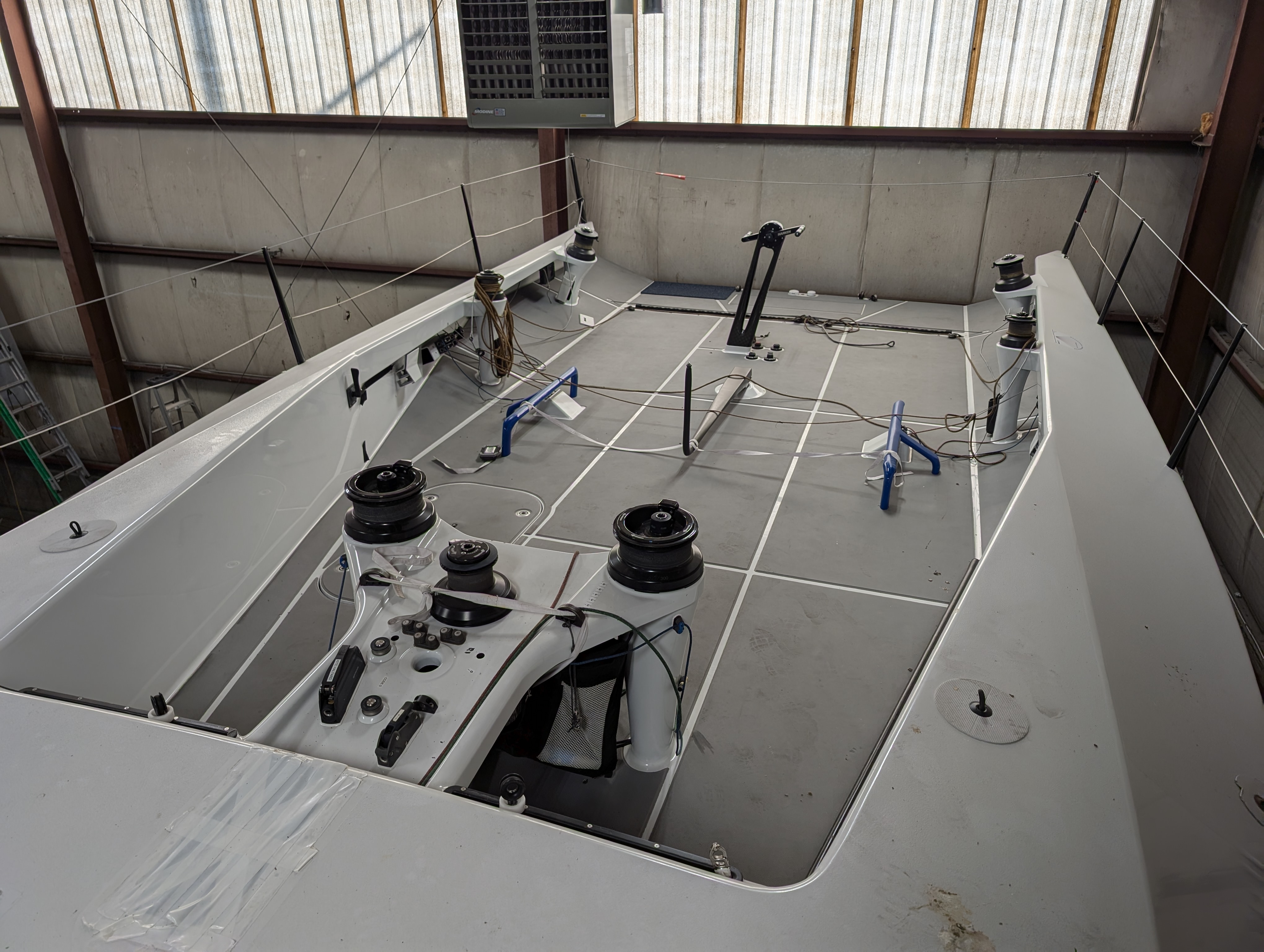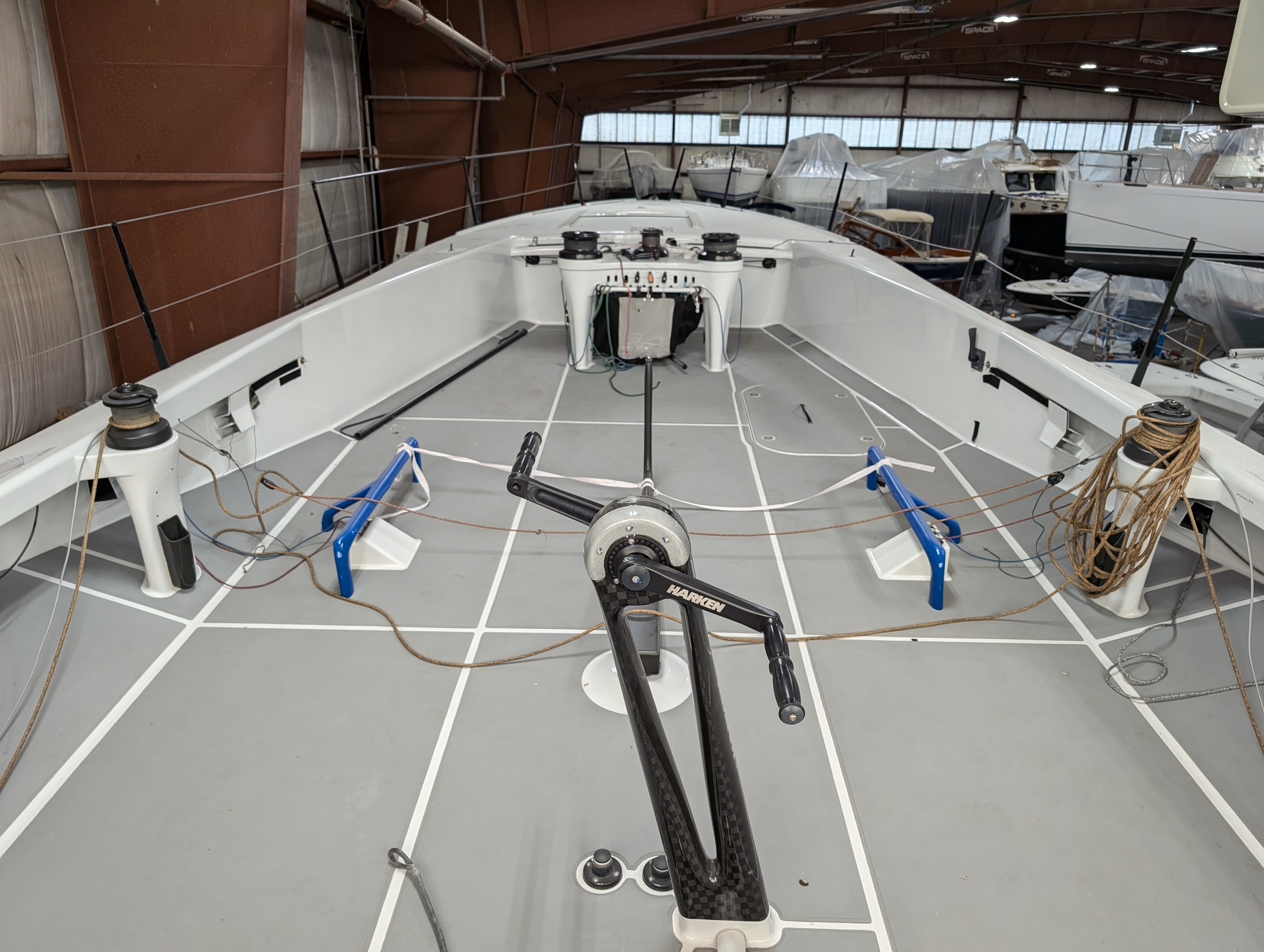 Deck gear: All deck gear is Harken, Spinlock or custom including winches, blocks, in/out and up/down jib sheeting.