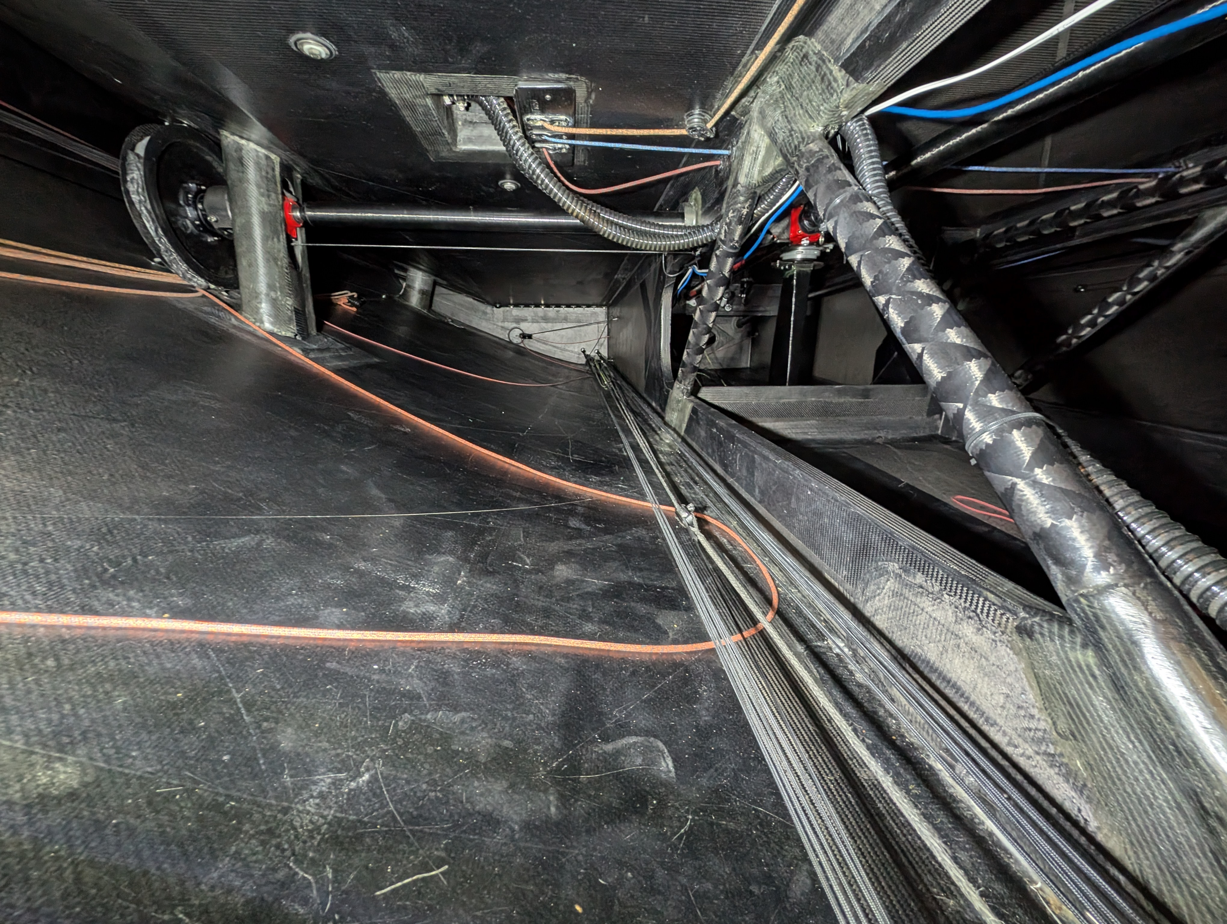 Hydraulics: Hydraulic system by Harken with carbon oil reservoir, hand-pump, selector valves and quick releases in the pit for the following cylinders: