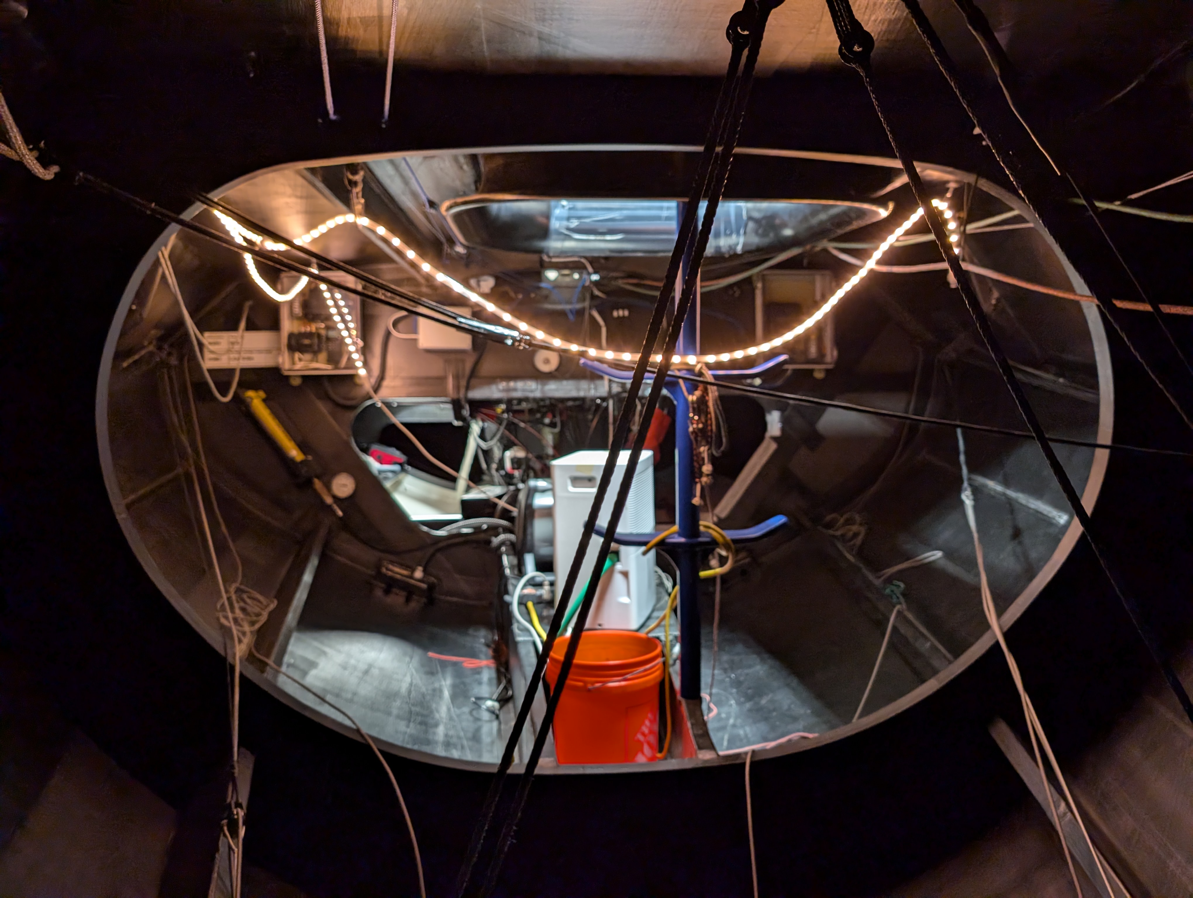Lift out cockpit floor access hatch to engine and aft bilge.