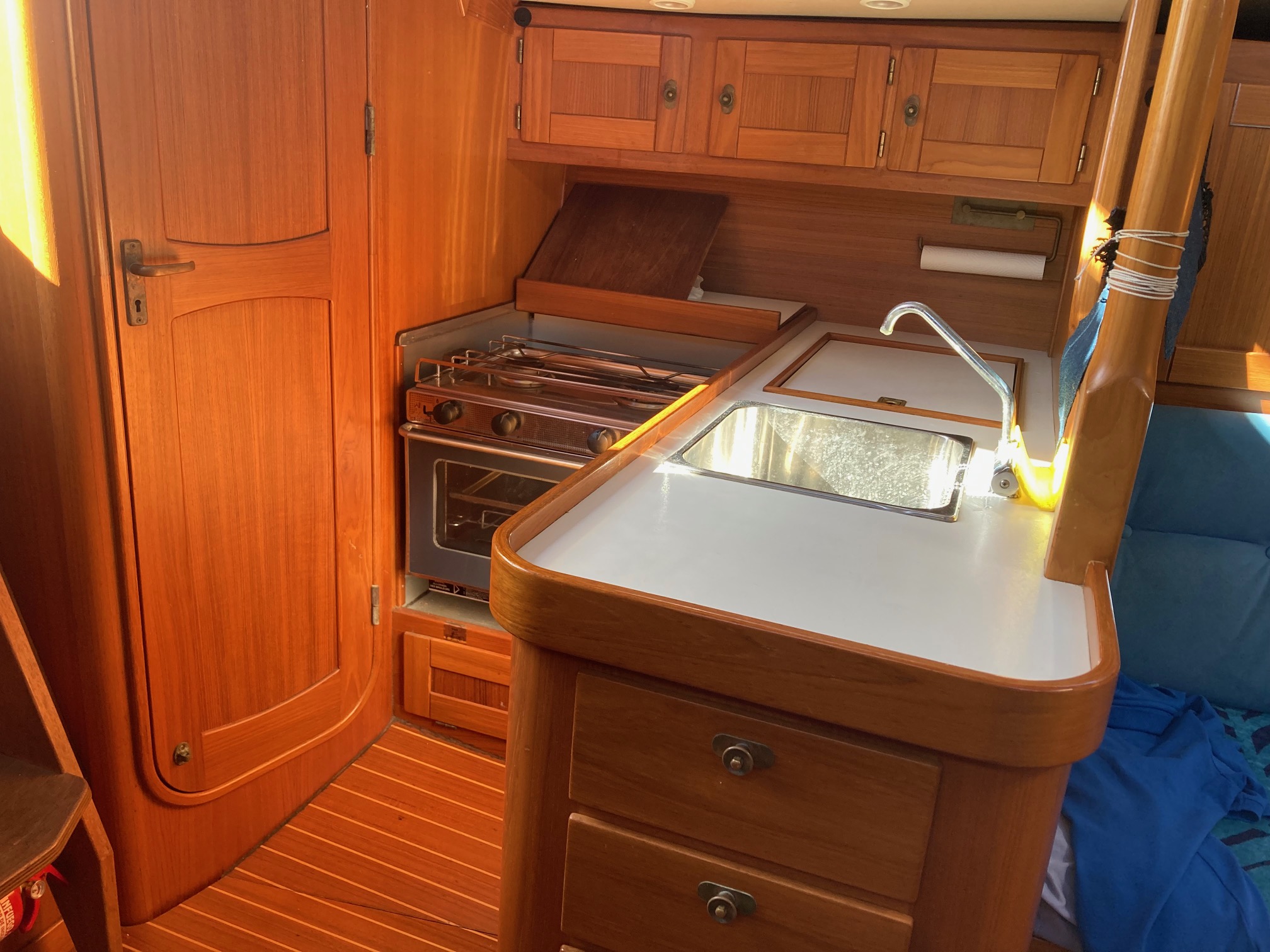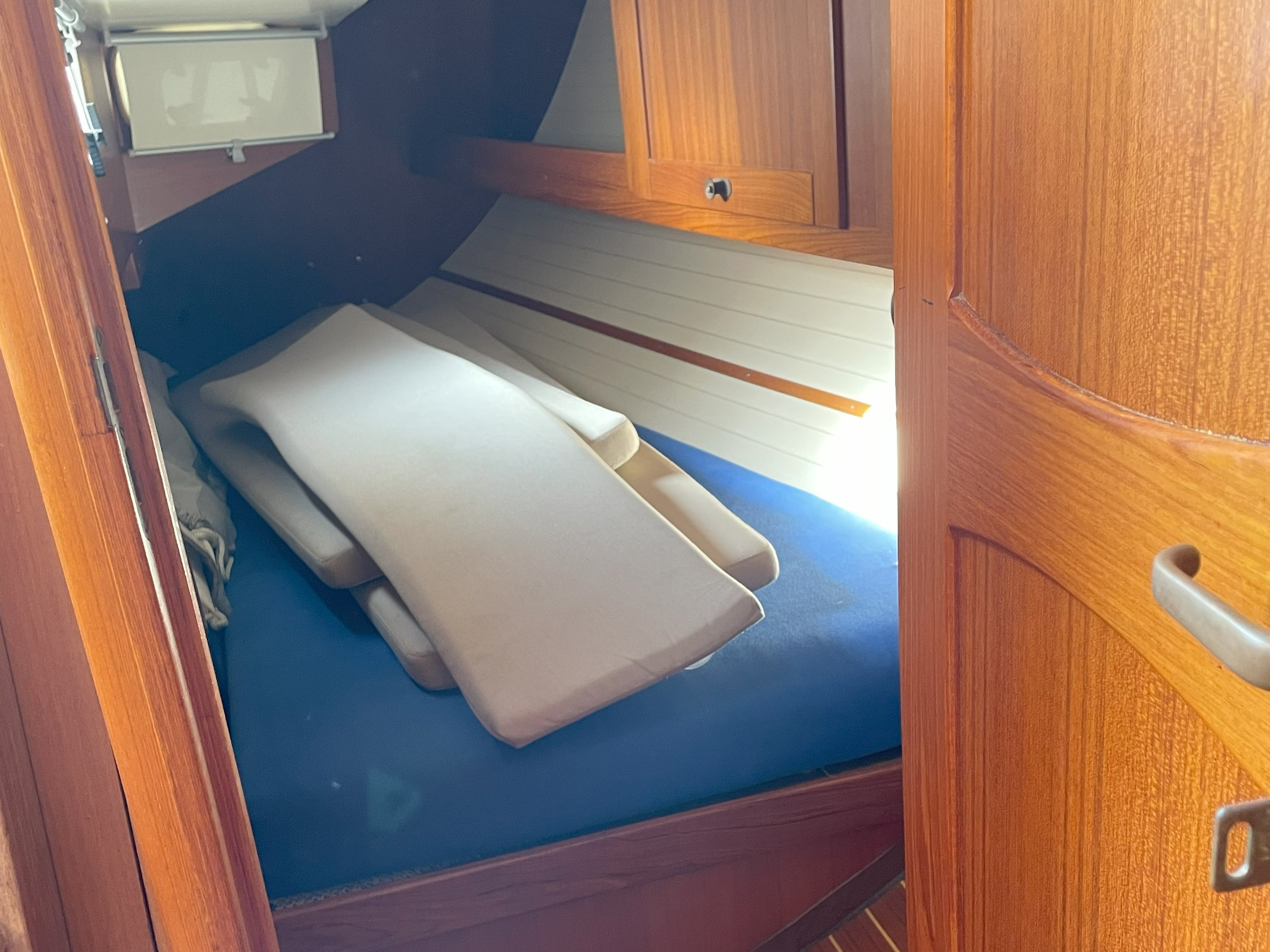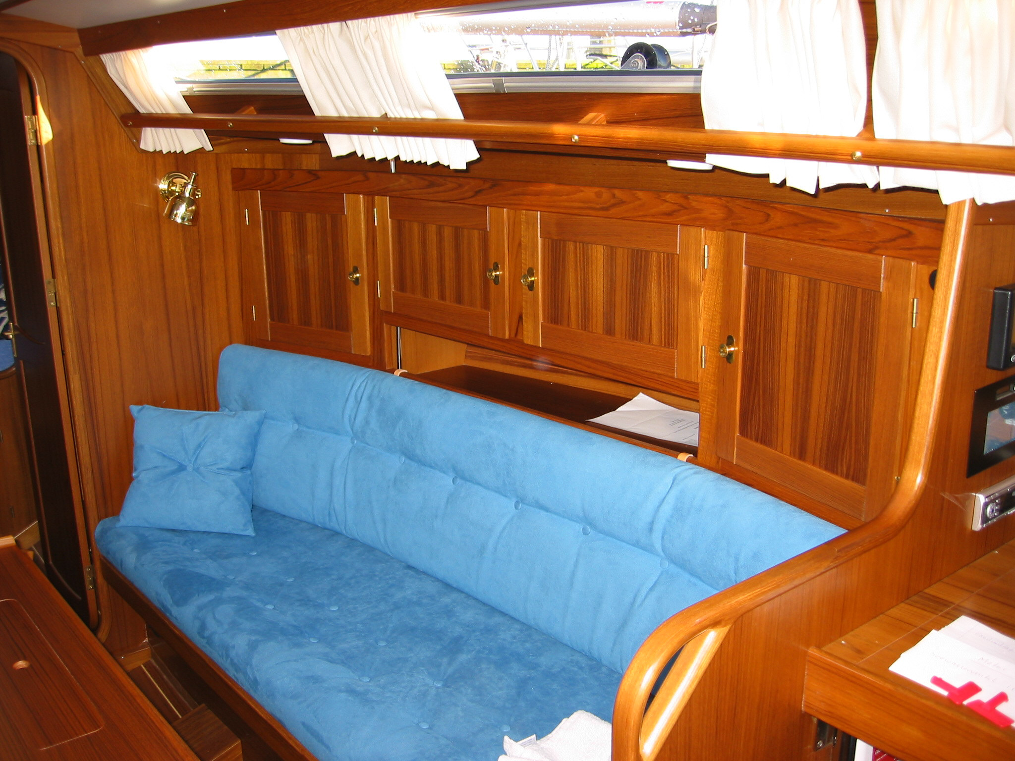 Forward double cabin with with large hanging locker. Spacious saloon with two large settees and a folding dining table and a generously sized chart table. L- shaped galley to port aft with a large head compartment opposite.