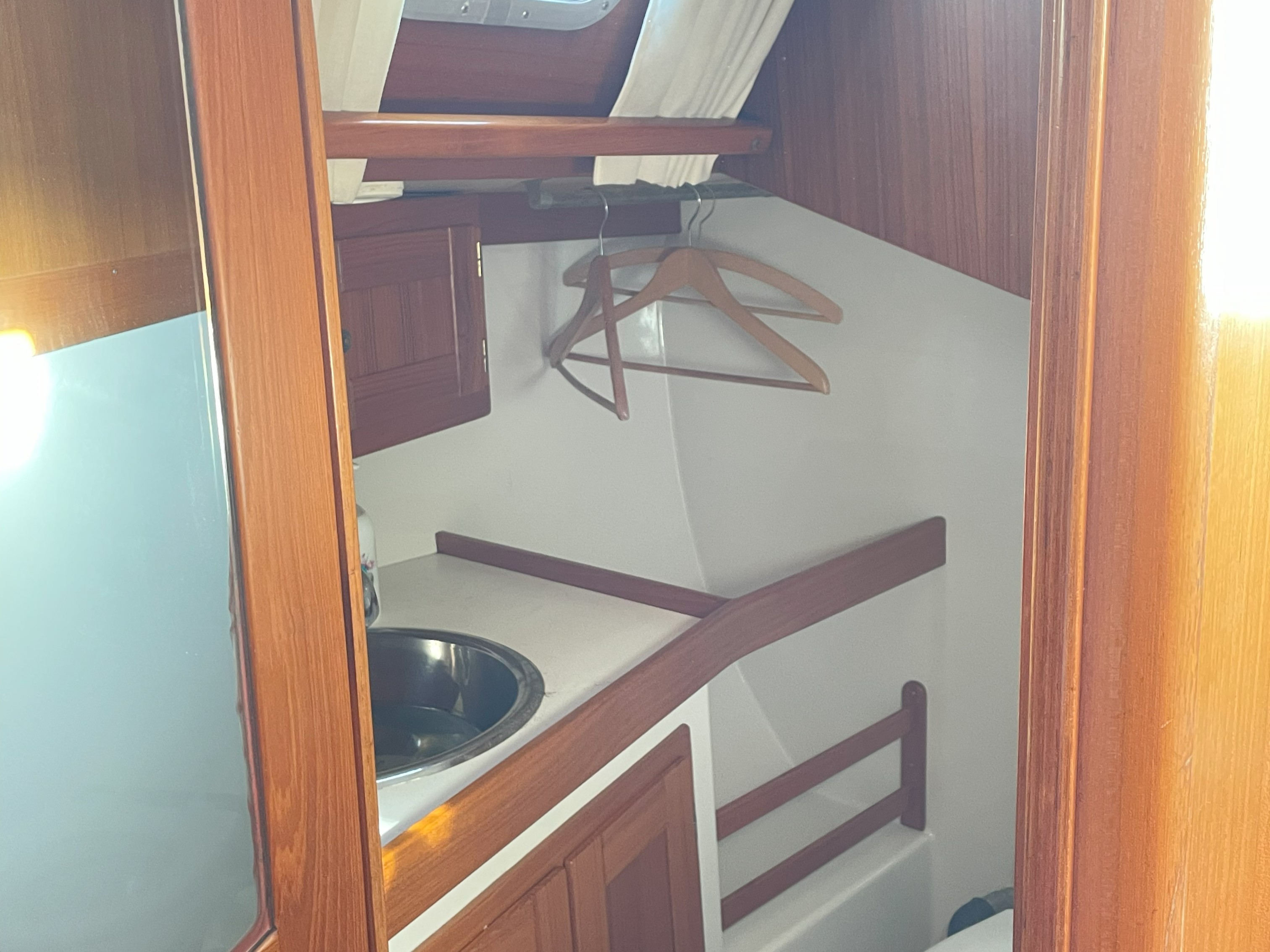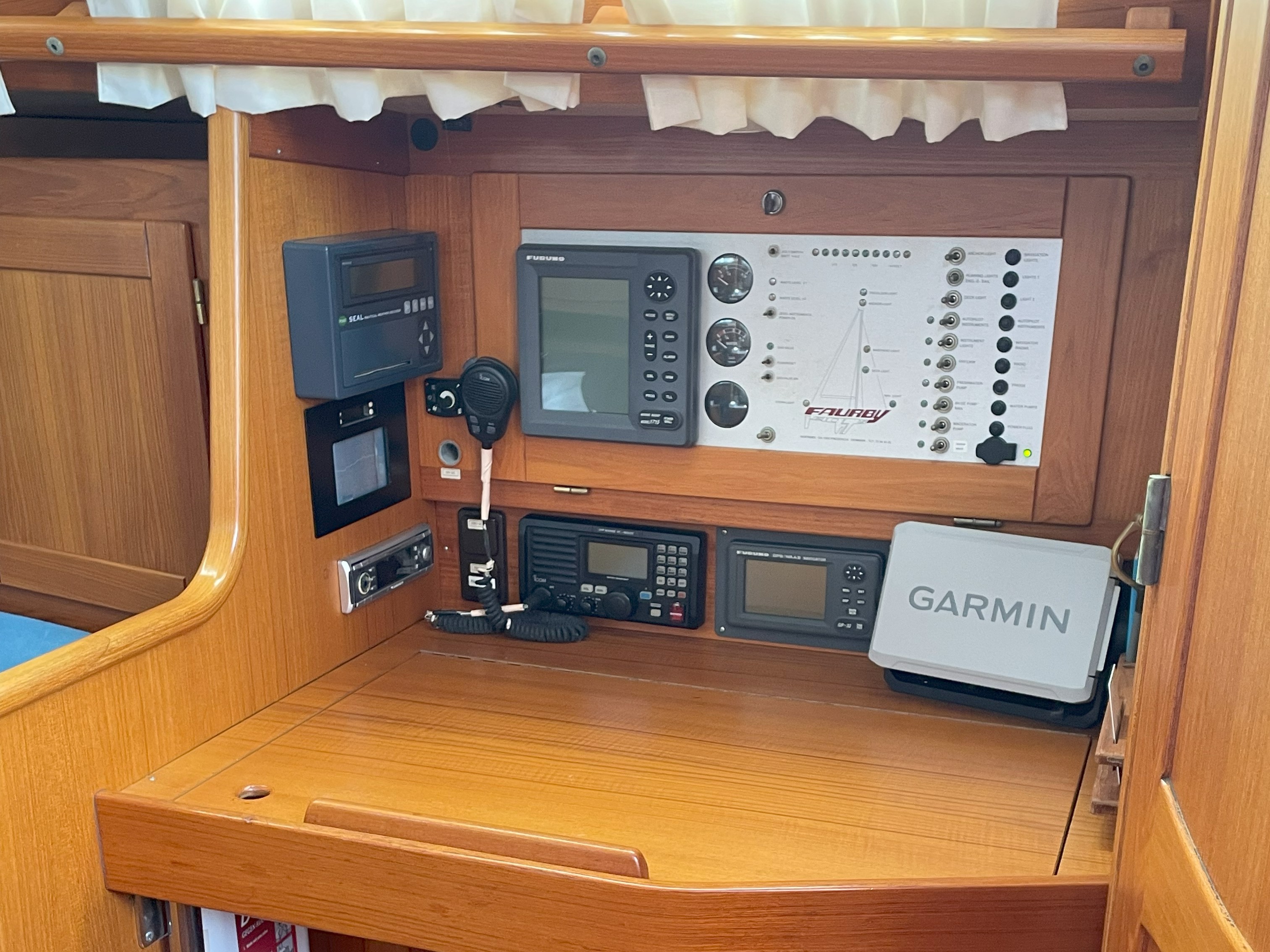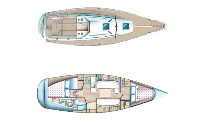 Forward double cabin with with large hanging locker. Spacious saloon with two large settees and a folding dining table and a generously sized chart table. L- shaped galley to port aft with a large head compartment opposite.