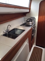 -starboard hull with galley, double s/s sinks, 2 burner gas cooker / oven, microwave oven and worktop, access to aft guest cabin