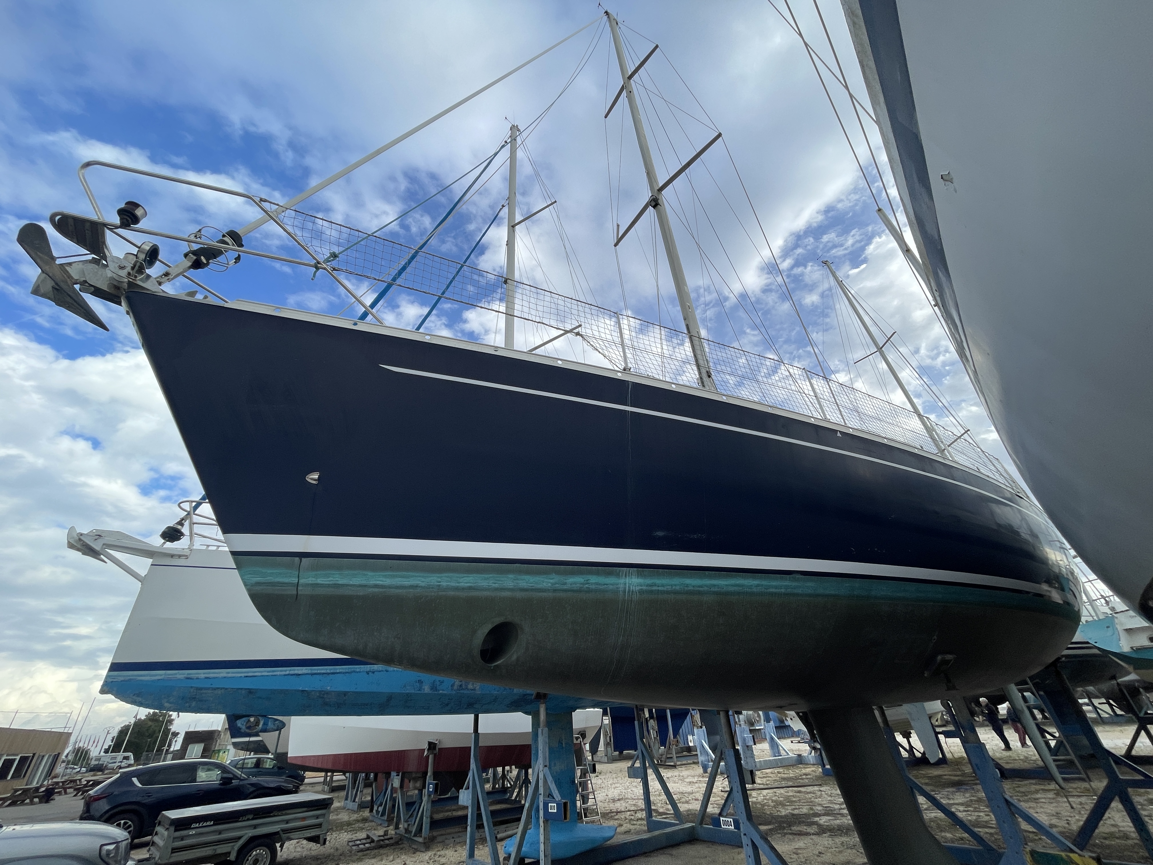 Carène : décapage des anciens antifoulings, application de 2 couches d’époxy + 4 couches de Coppercoat (antifouling 10 ans) effectuées en 2023