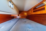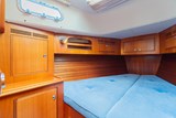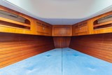 Double berth, hanging locker, storage cupboard and shelving along hull side