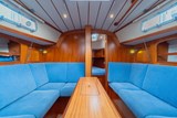 Mahogany interior joinery, teak and holly flooring, Ting 52 light blue upholstery and beige carpets