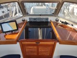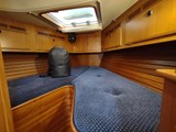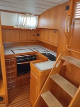 Working surface in white laminate with strong, all-round teak fiddle rail. Well insulated deep fridge with water cooled electric compressor for chilling. Additional deep freezer behind Nav Station can be a fridge or freezer. Extra deep, double stainless-steel sink. Two burner gas stove with oven, well gimballed with fiddle rails and locking device for oven door. Electric gas switch and safety solenoid. Solenoid and gas piping in gas locker changed new May /2025. Two aluminum propane tanks in locker with filling adaptors for travel. Crockery locker and cutlery drawer. Teak Bread Board.