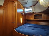 There are two armchairs in the salon, with settee and fixed teak table. All interior woodwork in warm satin finished teak; a rare, significant upgrade, that can’t be duplicated as teak boats are no longer produced by Hallberg Rassy. Flat locker doors with ventilation openings and the teak grain running continuous thru the wall panels. Floor is varnished teak with inlaid holly strips. Cushions on all berths 5 inch thick and resting on unvarnished, well-ventilated boards to avoid condensation. Aft cabin berths have additional memory foam mattress toppers. Two private cabins, each with 3 pc heads. Customized one floor living plan. Hand holds are in all the right positions. All portholes open and are fitted with curtains. Curtains also under the hatches.